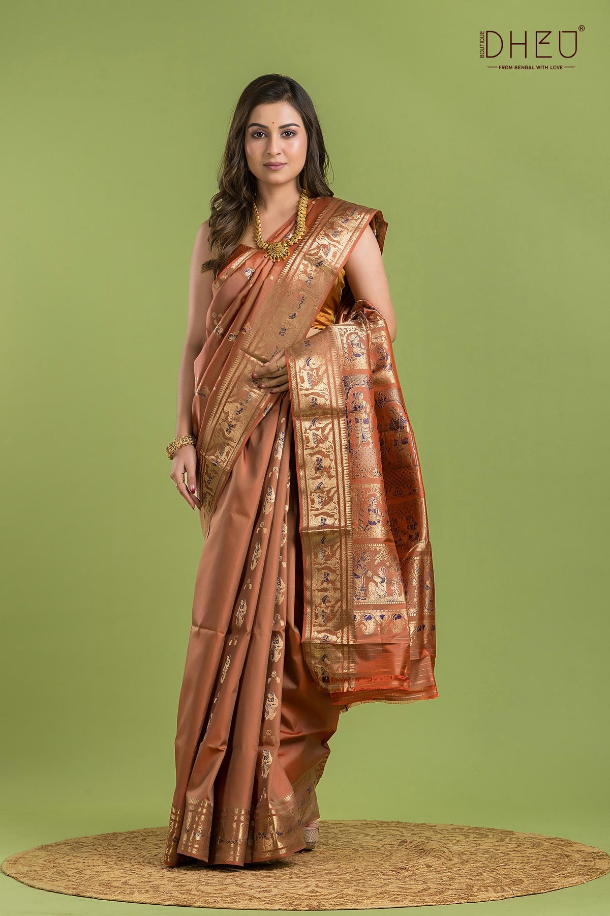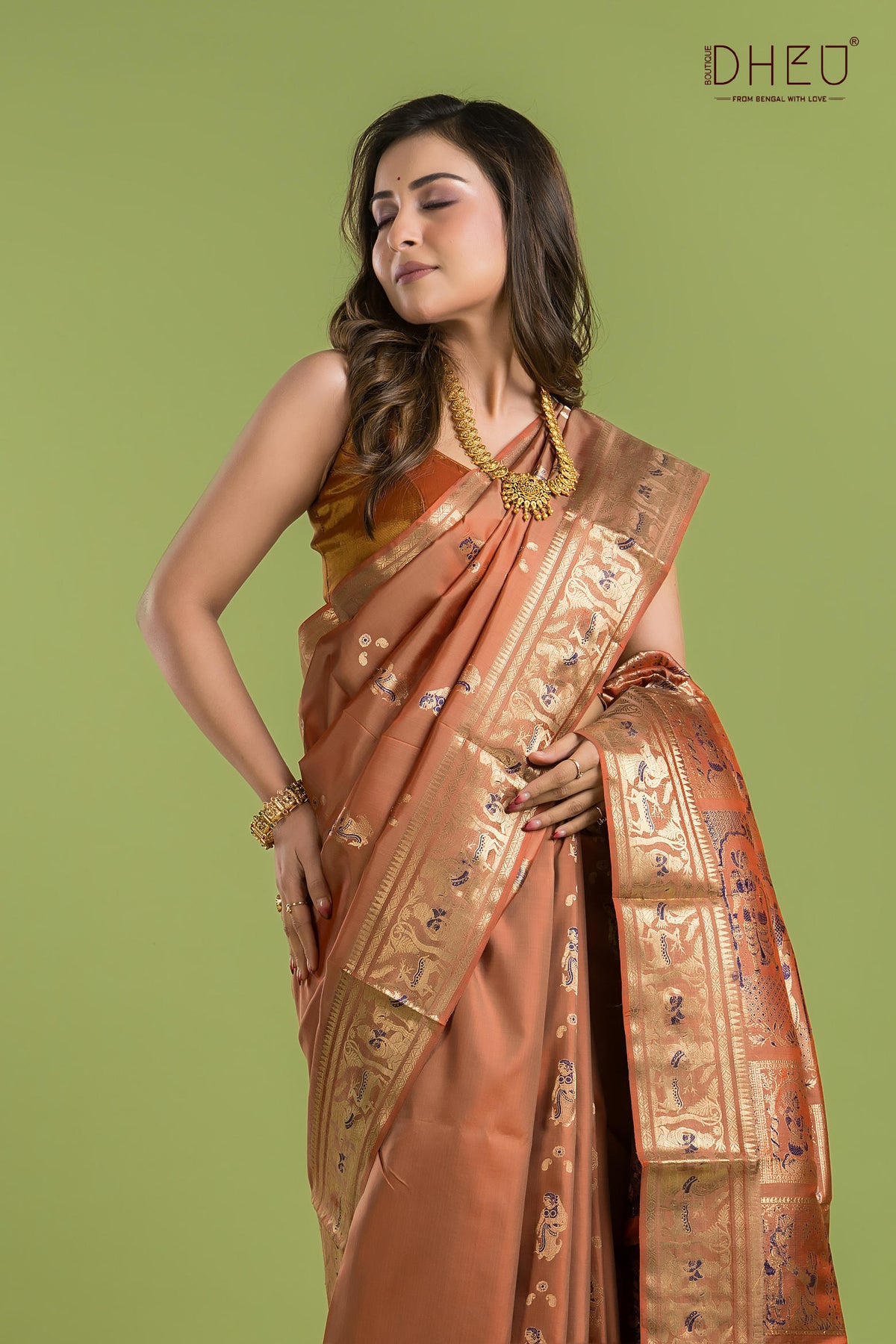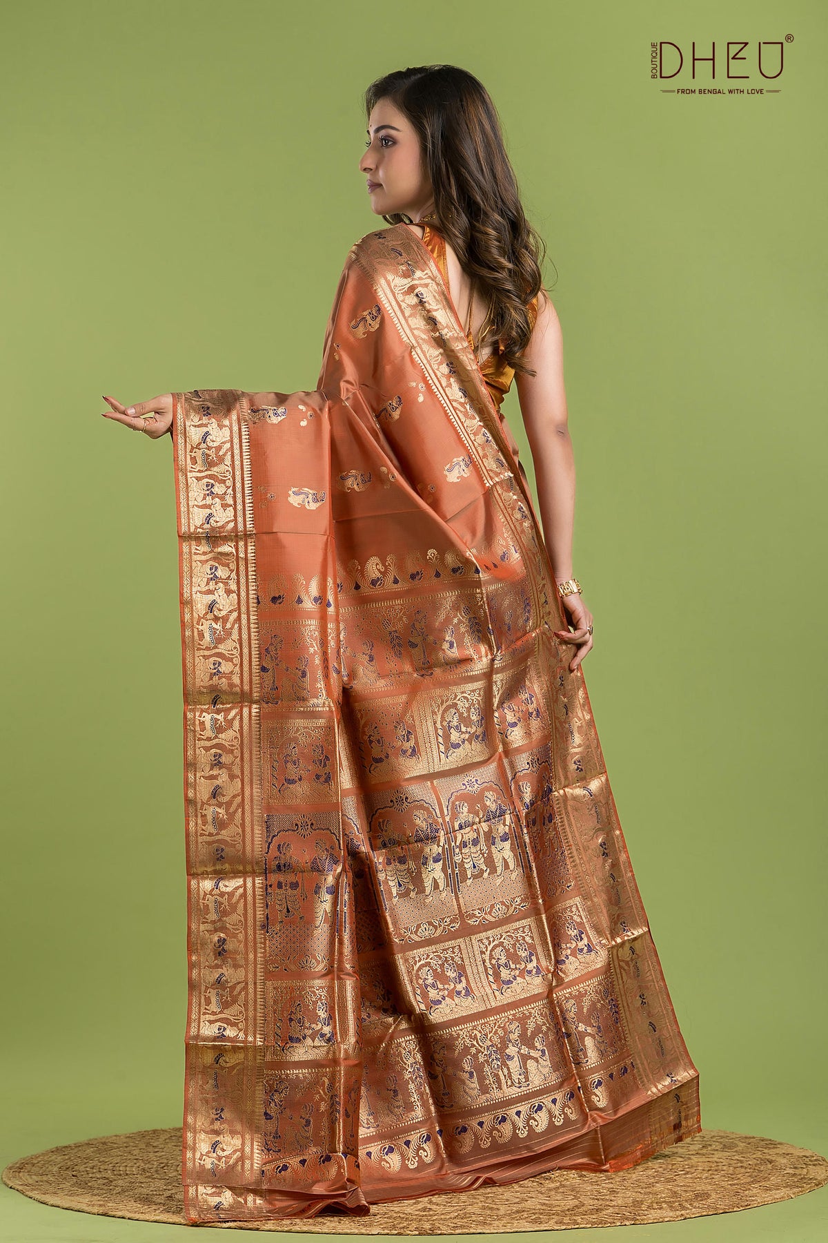 Experience the timeless grandeur of Bengal’s legendary weaving tradition with this Pure Swarnachari Silk Saree. Woven from 100% pure mulberry silk and Silk Mark Certified, this saree guarantees authenticity, superior quality, and long-lasting elegance. The saree features traditional designs inspired by mythology, nature, and royal heritage. The luxurious silk fabric drapes effortlessly, offering unmatched comfort and a regal silhouette. Delicate zari work and finely detailed borders enhance its opulence, making it a treasured heirloom piece.