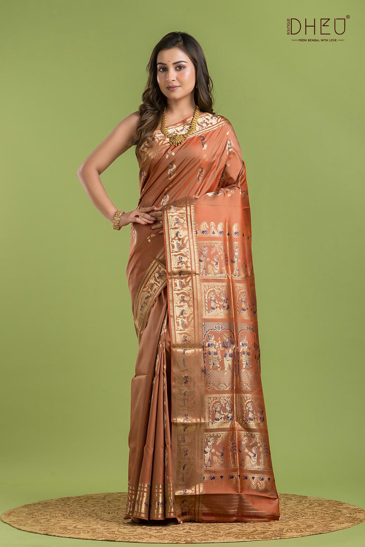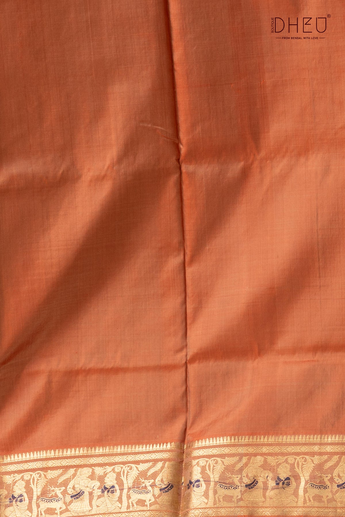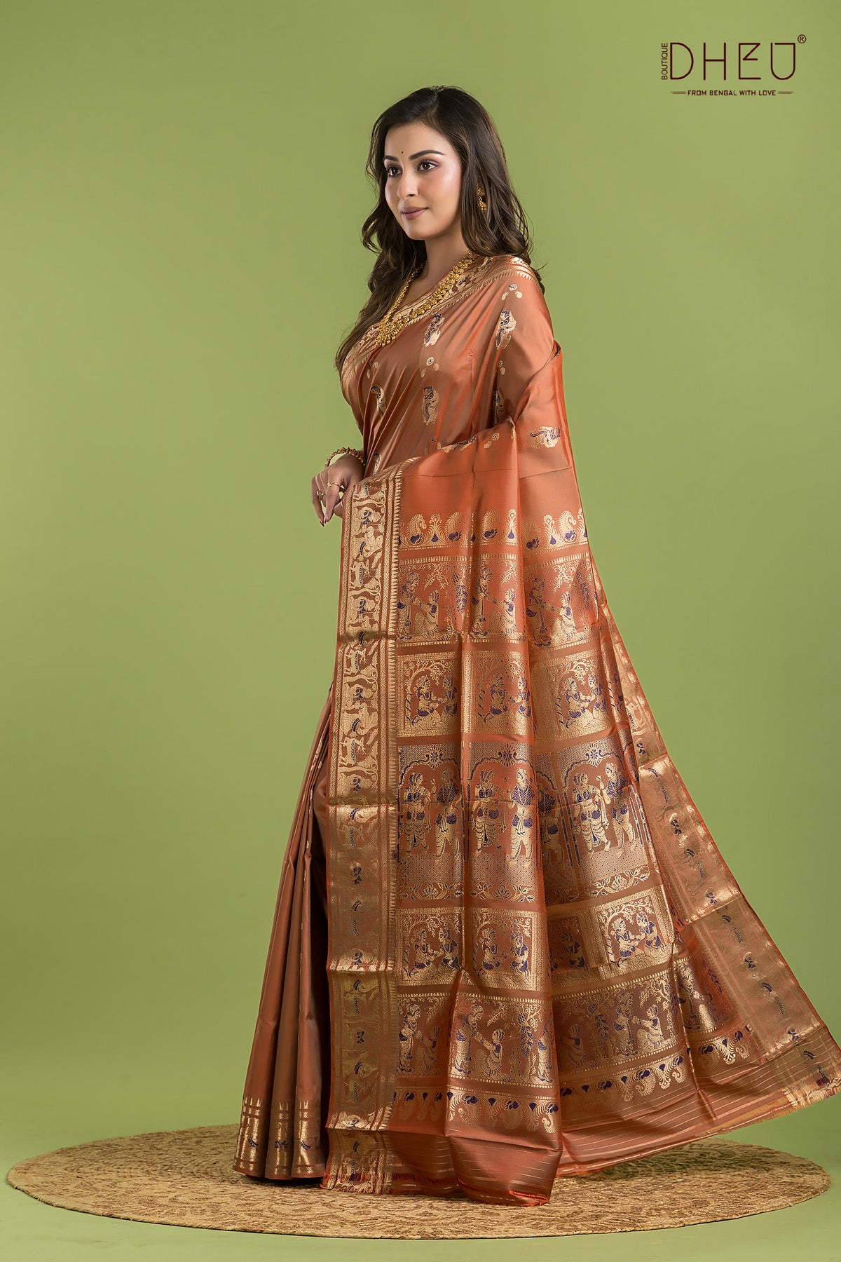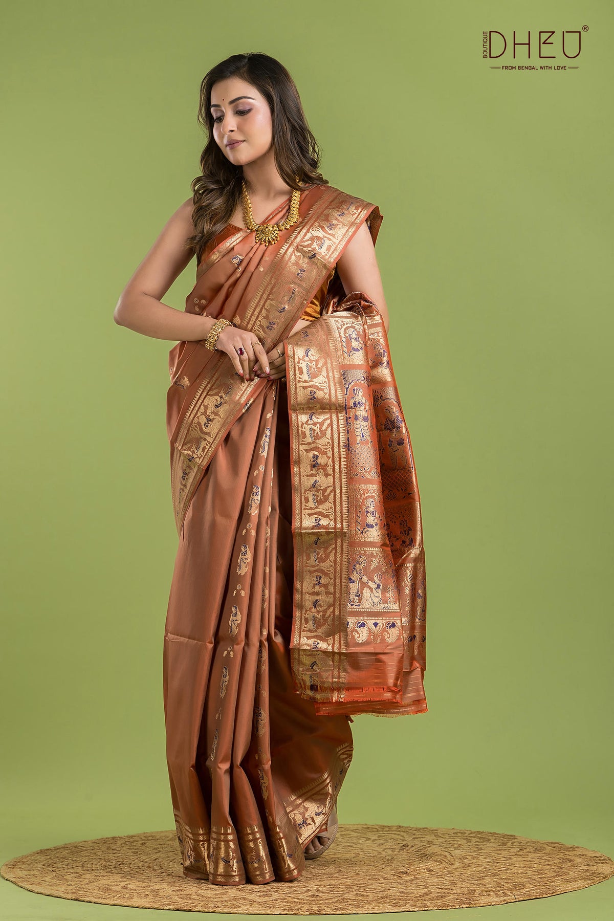 Experience the timeless grandeur of Bengal’s legendary weaving tradition with this Pure Swarnachari Silk Saree. Woven from 100% pure mulberry silk and Silk Mark Certified, this saree guarantees authenticity, superior quality, and long-lasting elegance. The saree features traditional designs inspired by mythology, nature, and royal heritage. The luxurious silk fabric drapes effortlessly, offering unmatched comfort and a regal silhouette. Delicate zari work and finely detailed borders enhance its opulence, making it a treasured heirloom piece.