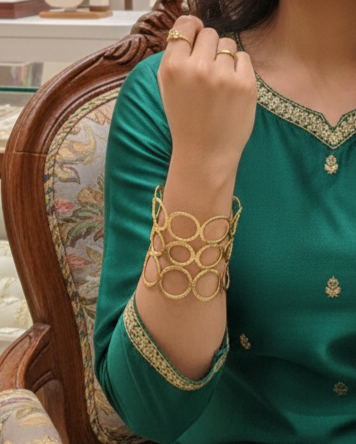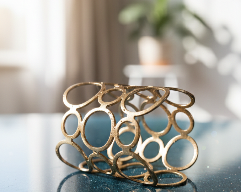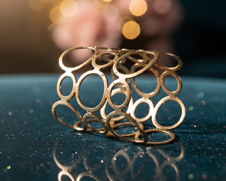 Elevate your accessory game with this striking Geometric Circle Cut-Out Cuff. Crafted with a bold, contemporary aesthetic, this statement bangle features an intricate pattern of interlocking circles of varying sizes. The polished gold-tone finish catches the light beautifully, making it the perfect piece to transition from a professional day look to an elegant evening ensemble.
