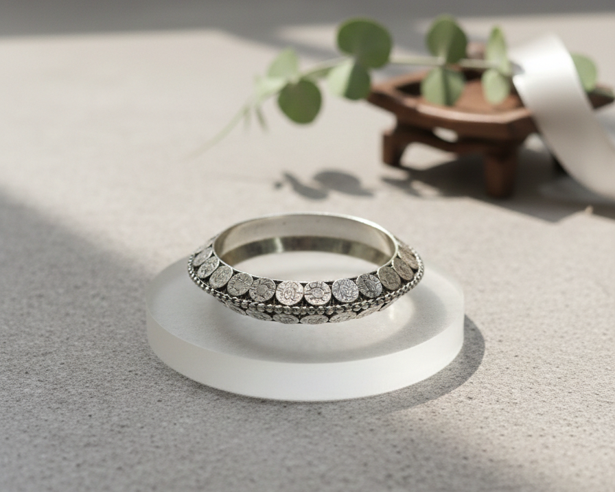 Elevate your jewelry collection with this stunning Tribal Coin Bangle, a perfect blend of traditional heritage and contemporary boho-chic. Meticulously crafted, this statement piece features a dual-row of intricately embossed vintage-style coins, framed by delicate beadwork for a textured, high-fashion look.