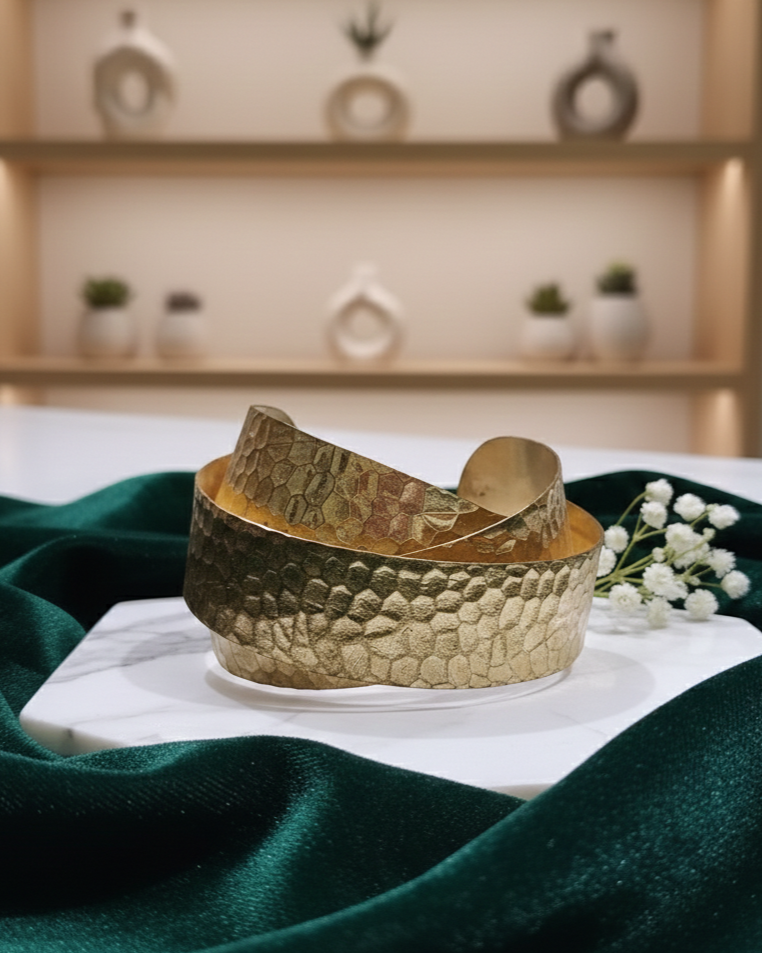 Elevate your jewelry collection with this striking hand-textured wrap cuff. Crafted with a unique honeycomb-embossed finish, this bangle captures the light from every angle, offering a rich, dimensional glow. Its architectural, overlapping design creates a bold silhouette that works perfectly as a standalone statement piece or paired with minimalist gold accessories.