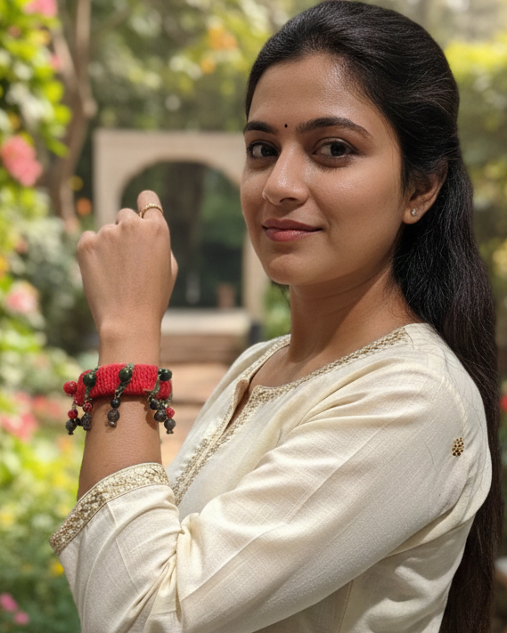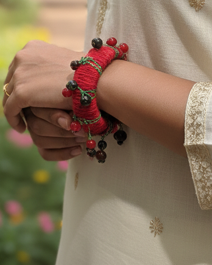 Embrace a touch of rustic charm with this uniquely handcrafted thread-work bangle. Wrapped in vibrant crimson red and forest green silk threads, this statement piece features a textured, multi-tonal design that stands out in any jewelry collection.