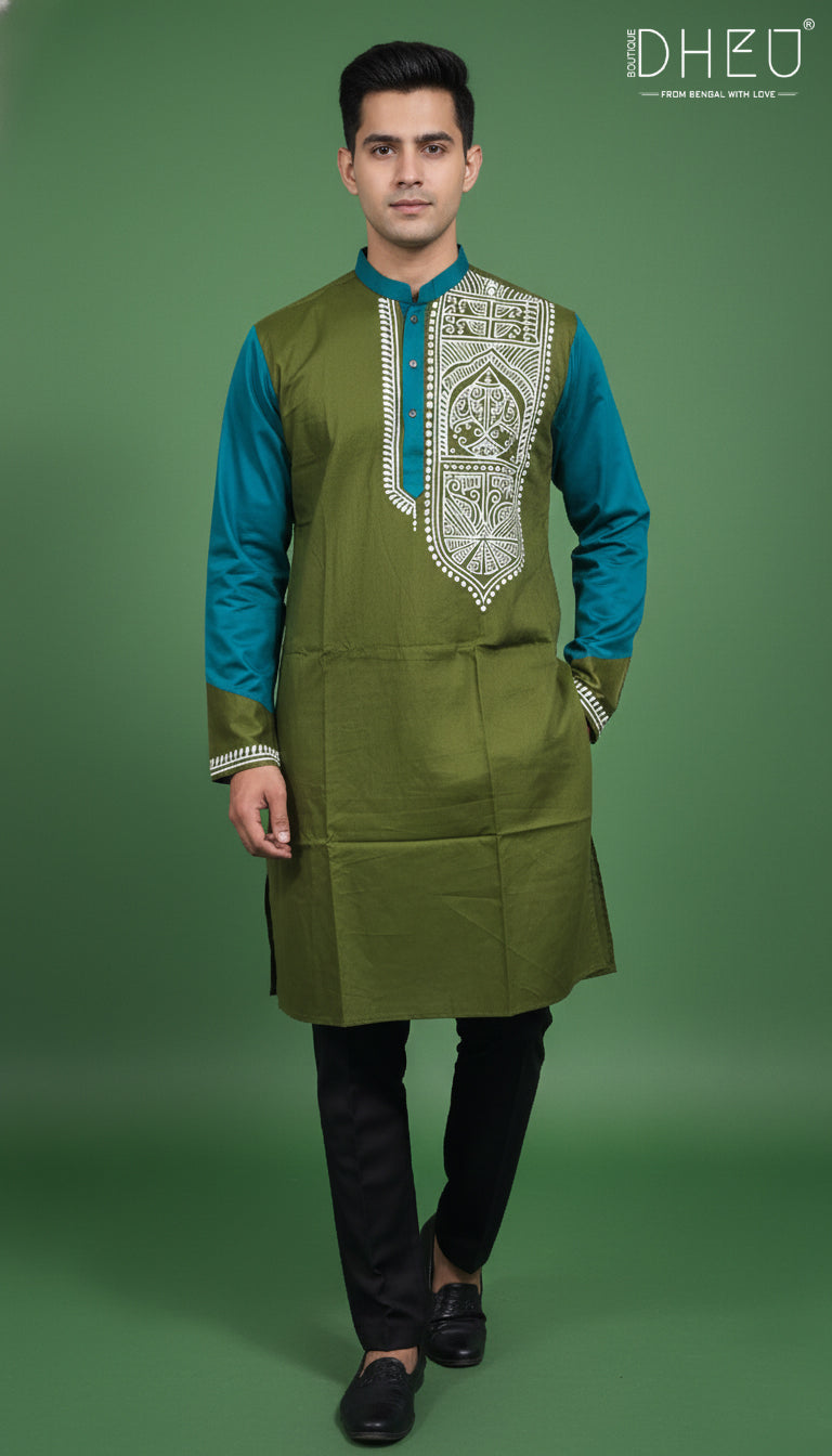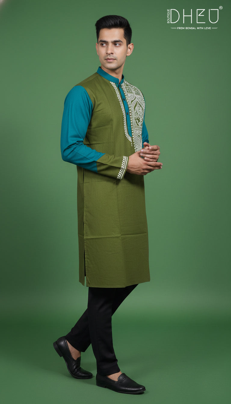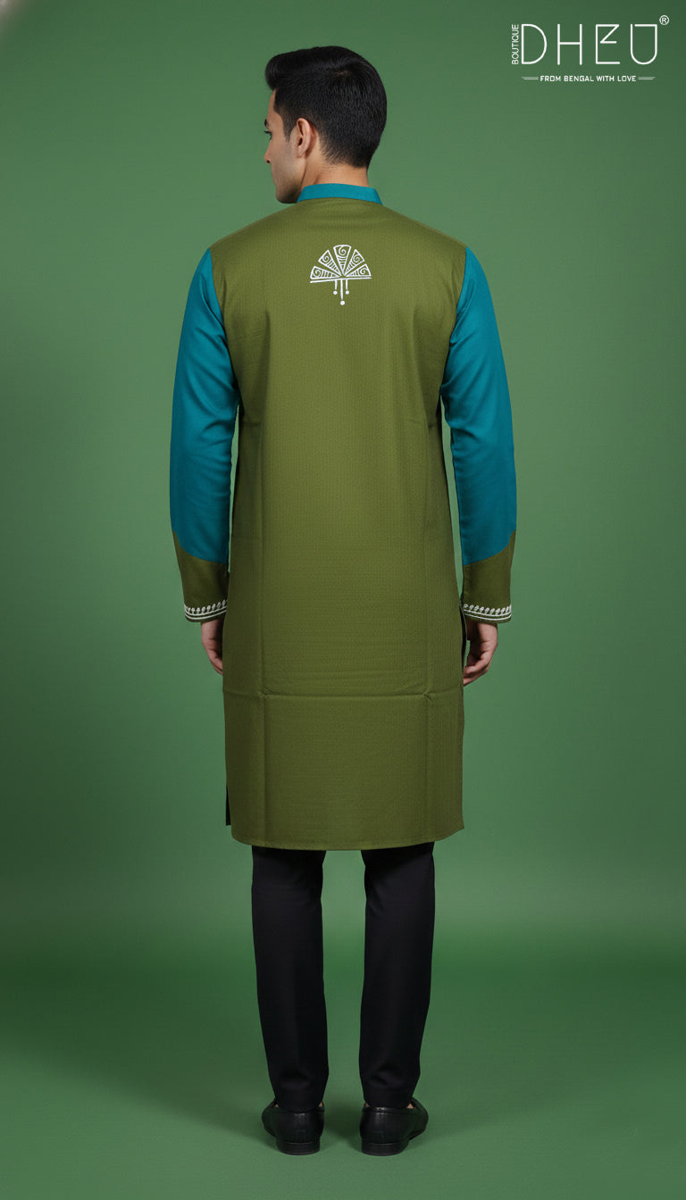Elevate your ethnic wardrobe with this masterfully crafted designer kurta from Dheu. Featuring a sophisticated dual-tone palette of Olive Green and Teal Blue, this piece is designed for the modern man who appreciates traditional roots with a contemporary edge. The focal point is the intricate white Nakshi-style embroidery along the placket, adding a touch of artisanal elegance to your look.