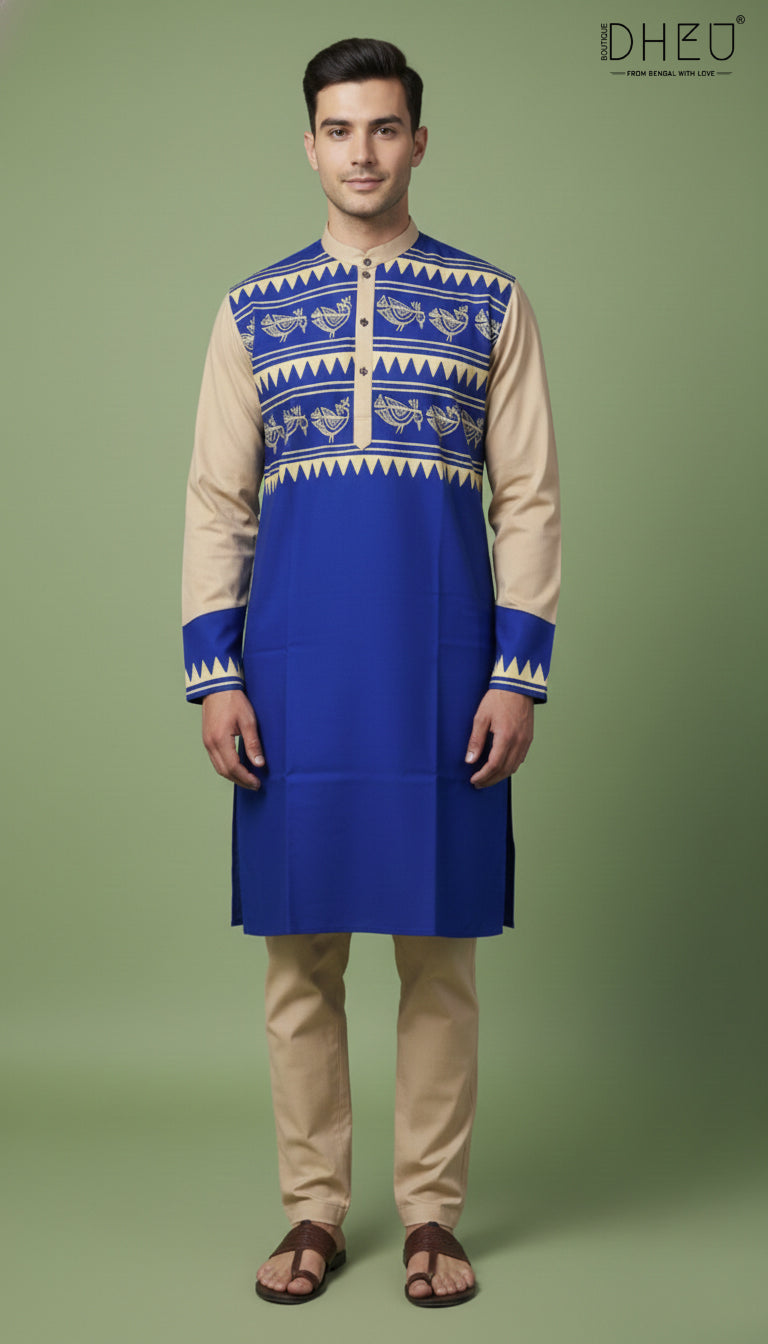 Elevate your ethnic wardrobe with this Boutique Dheu original. This kurta stands out with its intricate chest paneling featuring folk-inspired bird motifs and geometric saw-tooth borders. The contrasting beige sleeves and mandarin collar provide a sophisticated, multi-tonal look that transitions perfectly from daytime celebrations to evening gatherings.