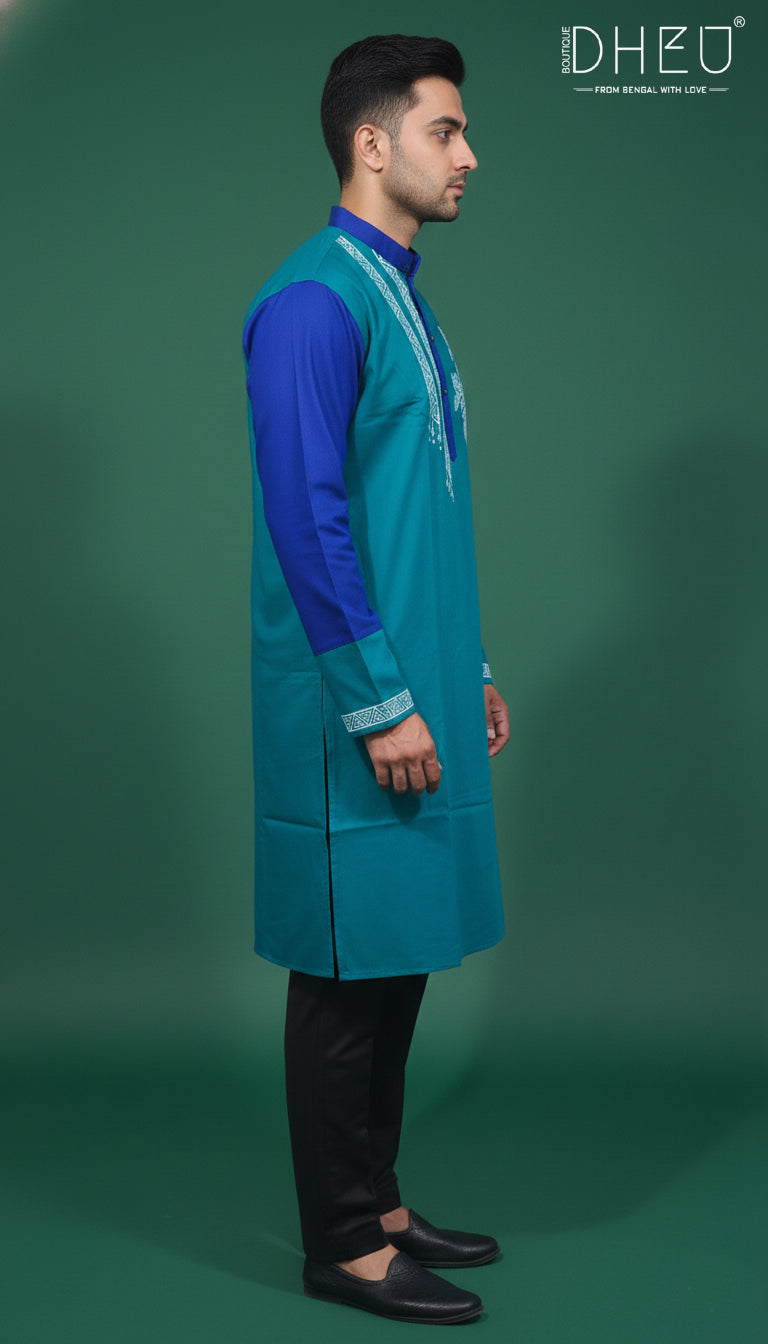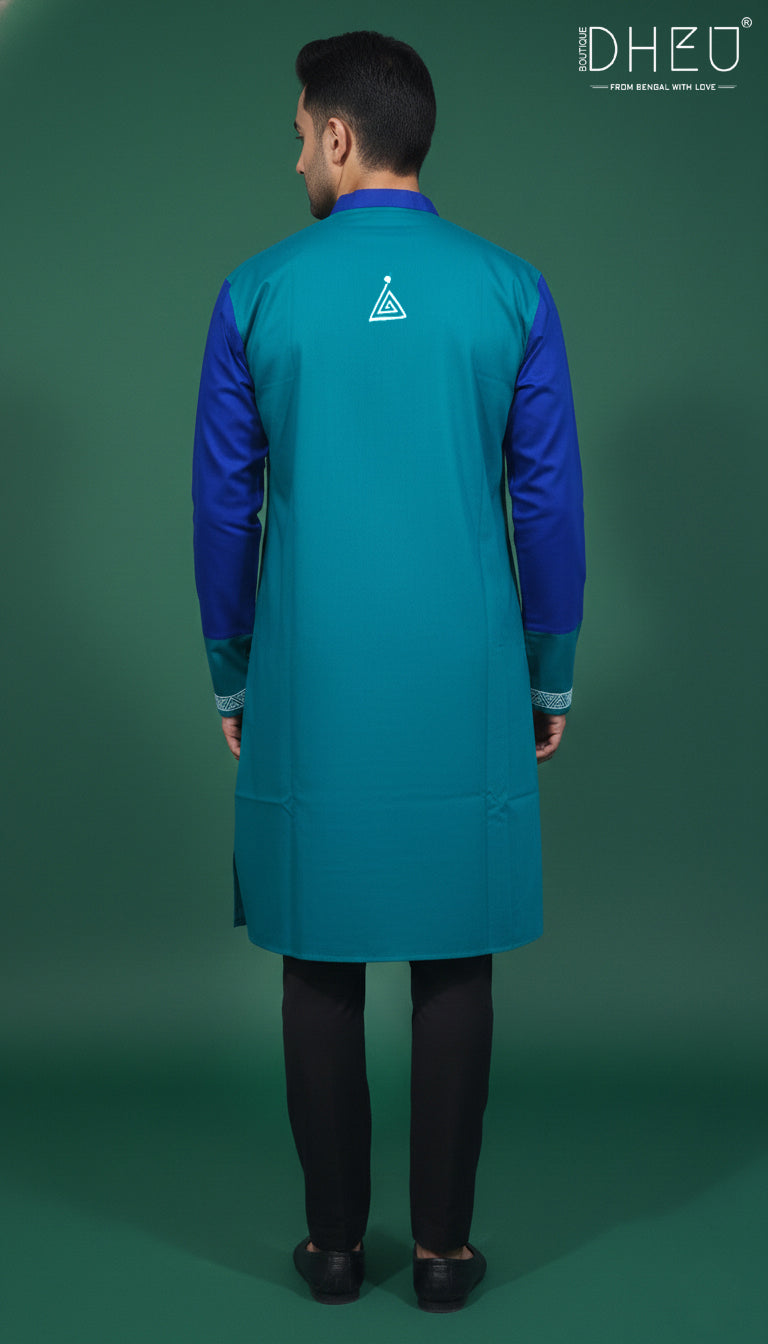 Elevate your ethnic wardrobe with this masterfully crafted Kurta from Dheu. Designed for the modern man who values cultural heritage, this piece features a sophisticated play of teal and royal blue, accented with traditional hand-inspired embroidery.