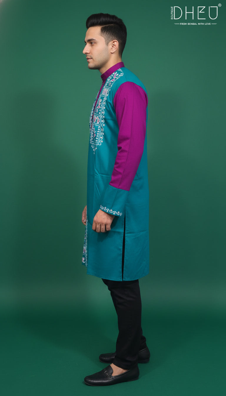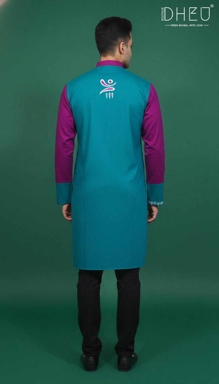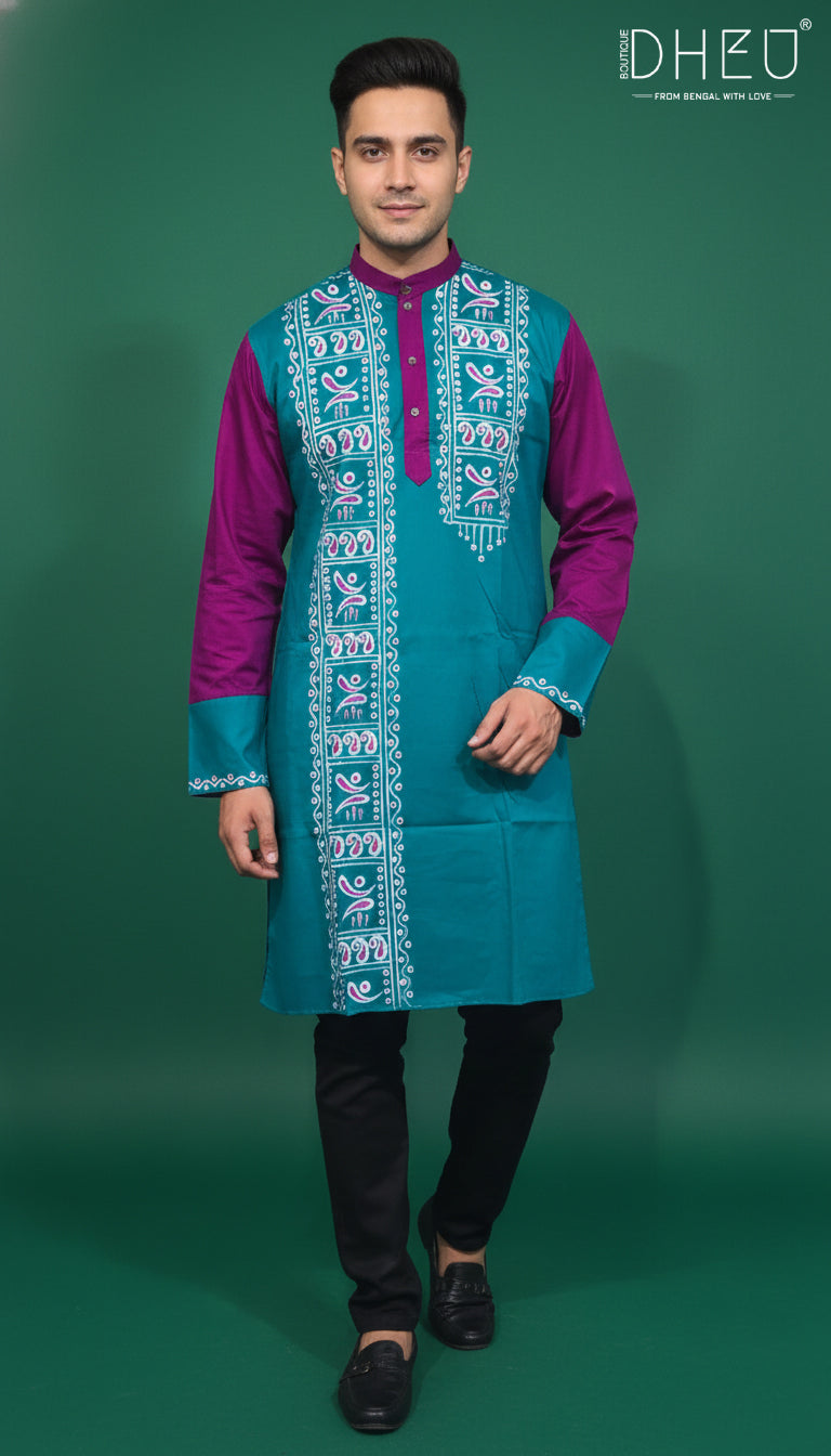 Celebrate heritage with a contemporary twist. This premium cotton kurta features a bold color-block design in vibrant teal and magenta, accented by intricate white screen-printed motifs. Designed for the modern man who values comfort without compromising on style, it’s the perfect choice for festive gatherings, cultural events, or semi-formal celebrations.