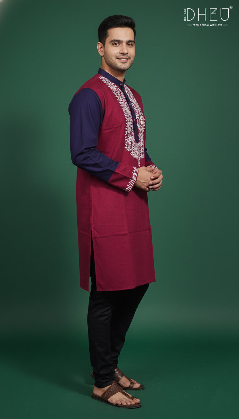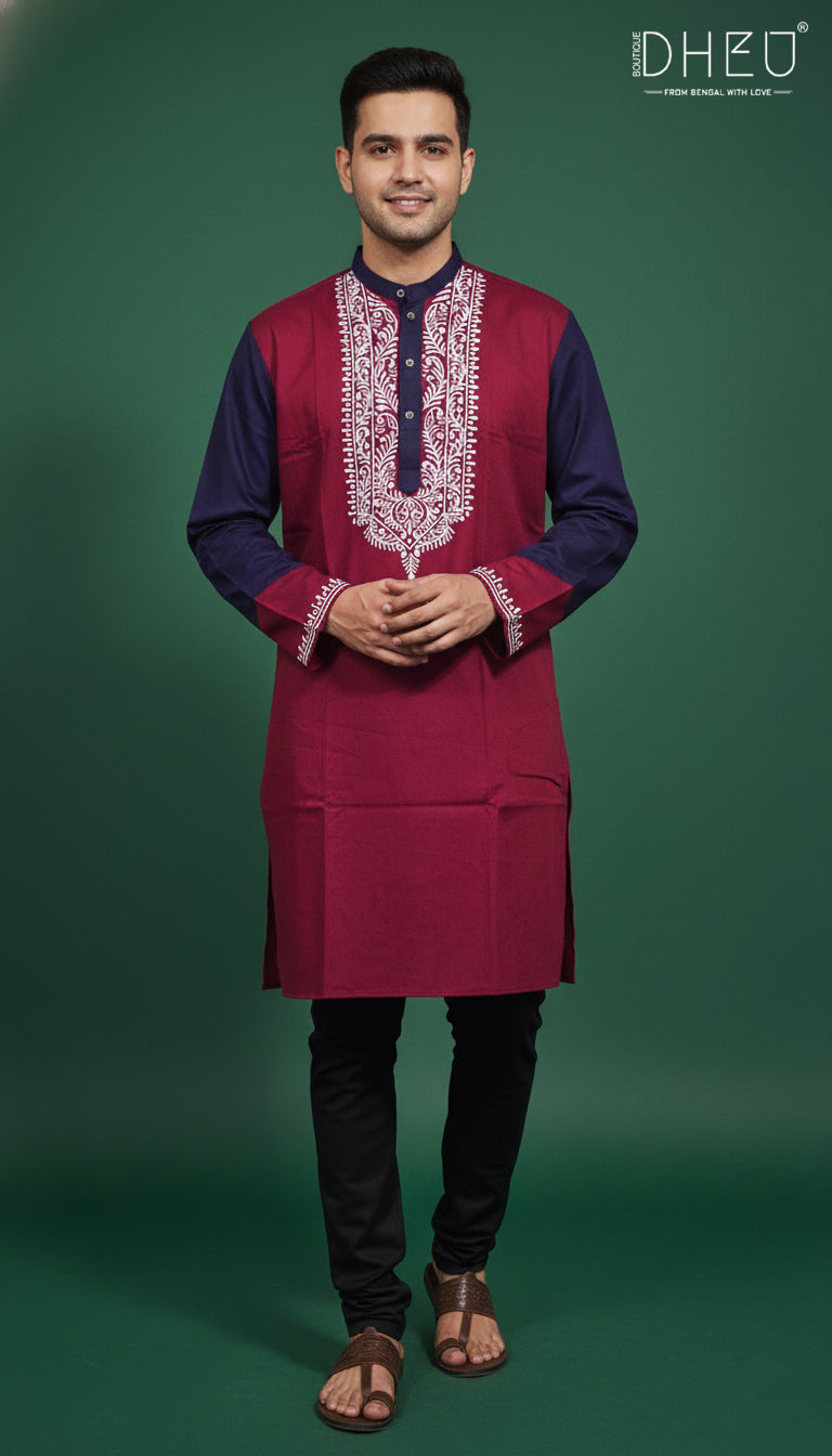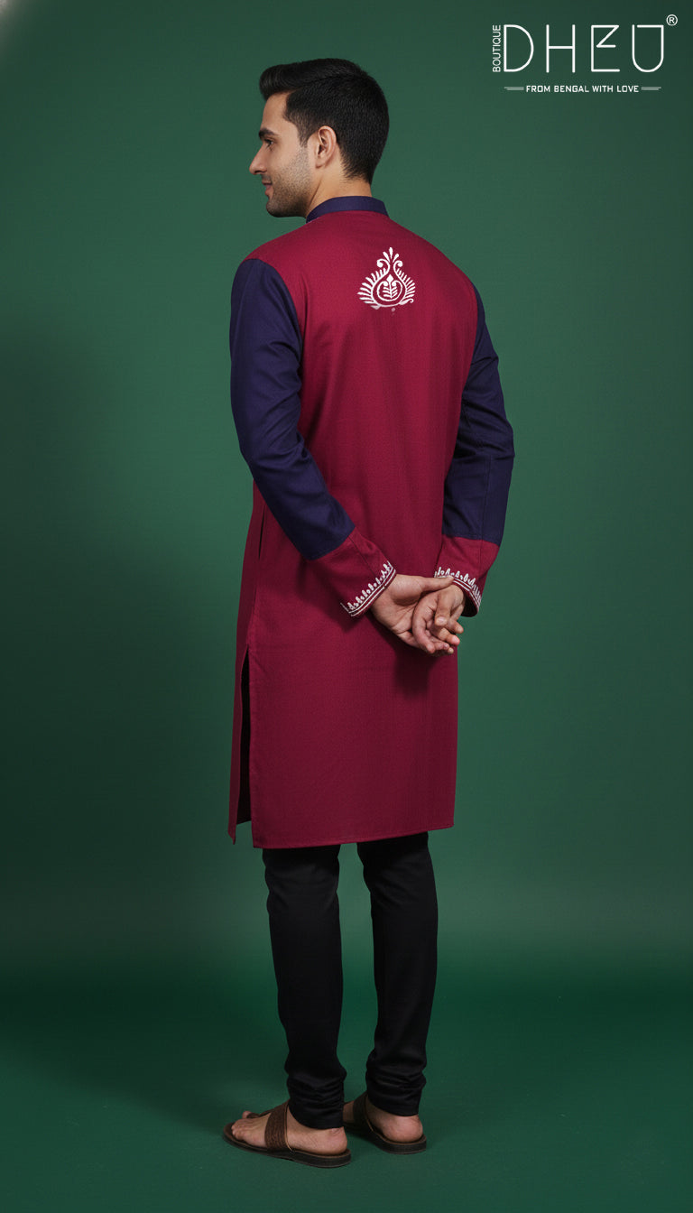 Elevate your ethnic wardrobe with this impeccably crafted cotton kurta from Dheu. Designed for the modern man who values cultural roots and contemporary style, this piece features a striking color-block aesthetic and intricate detailing that reflects the soul of Bengal.