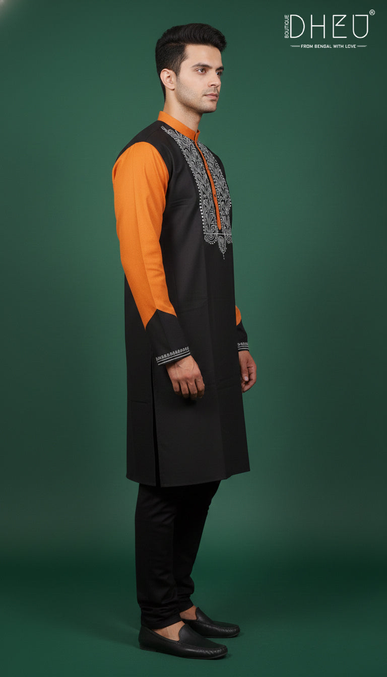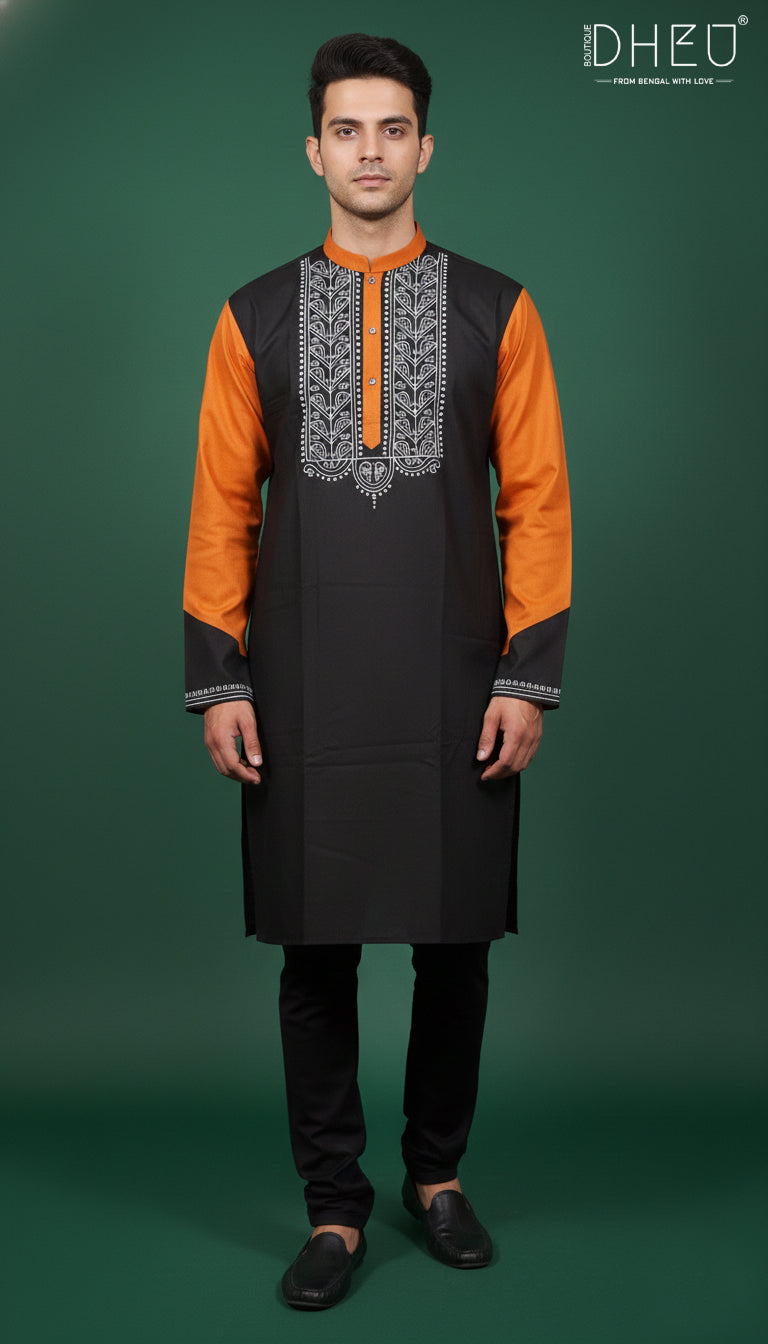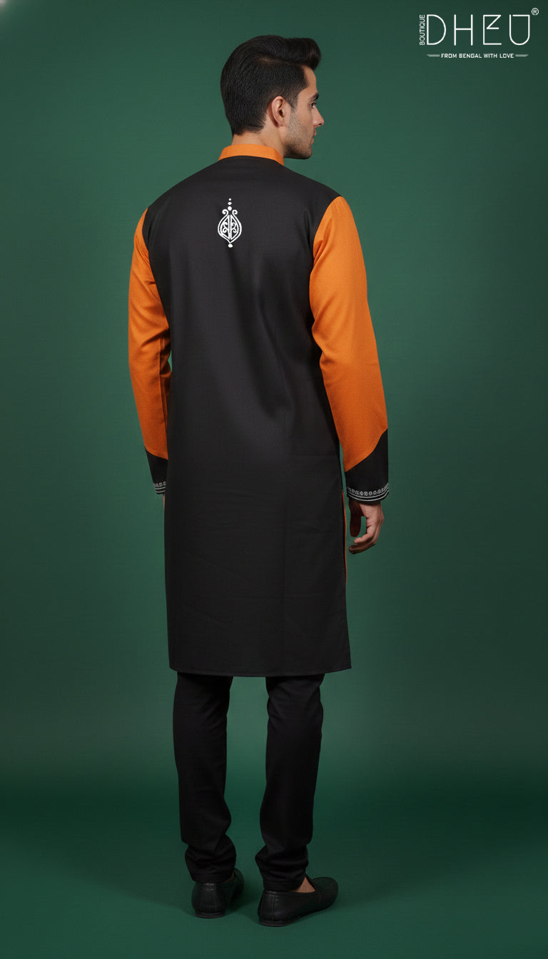 Elevate your ethnic style with this striking dual-tone kurta from Dheu. Masterfully crafted to balance contemporary design with traditional roots, this piece features a sophisticated contrast of deep black and orange. The centerpiece is the intricate white thread embroidery on the chest, showcasing traditional motifs that add a touch of artisanal elegance.