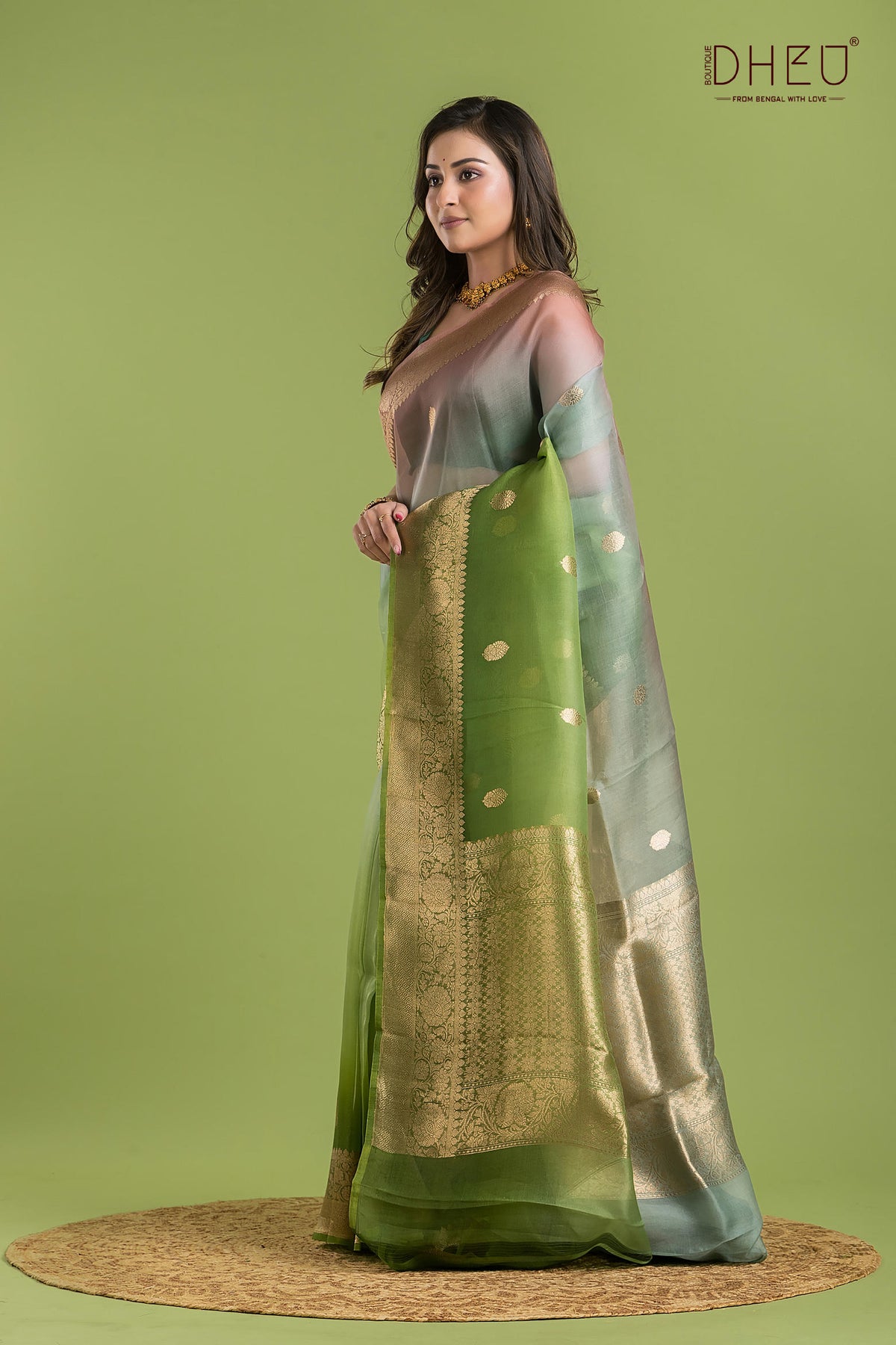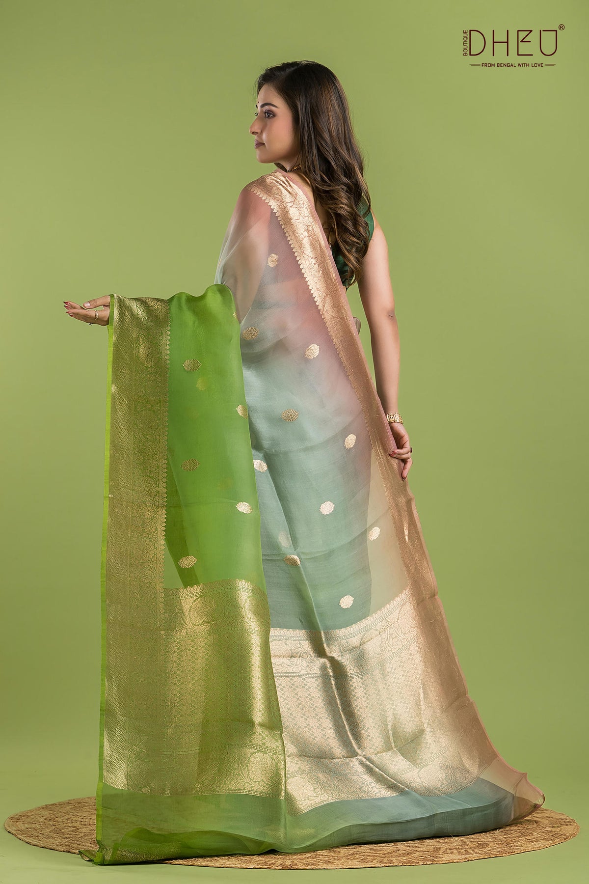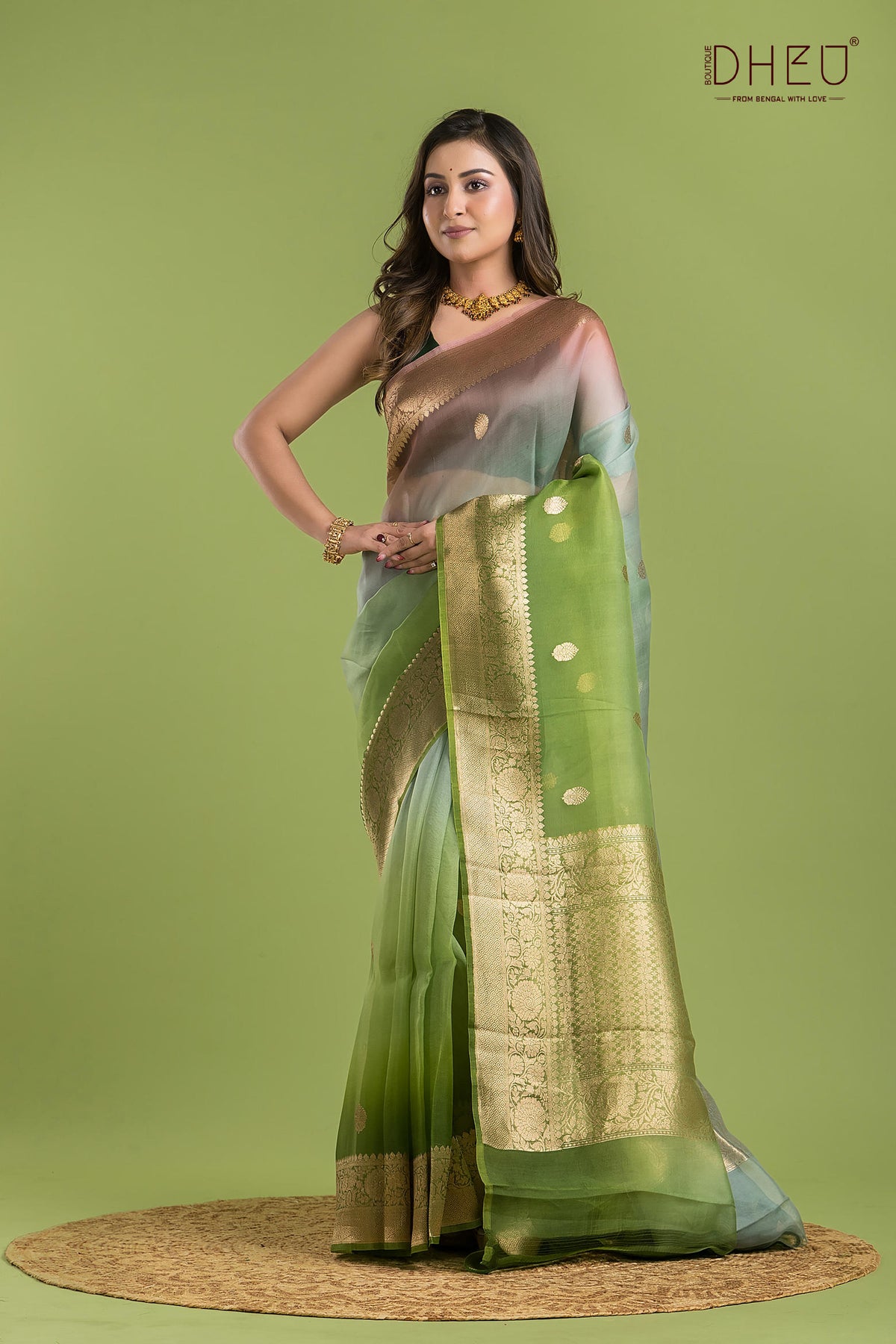 • Saree Color :- Pastel Green, Grey, and Peach with golden.