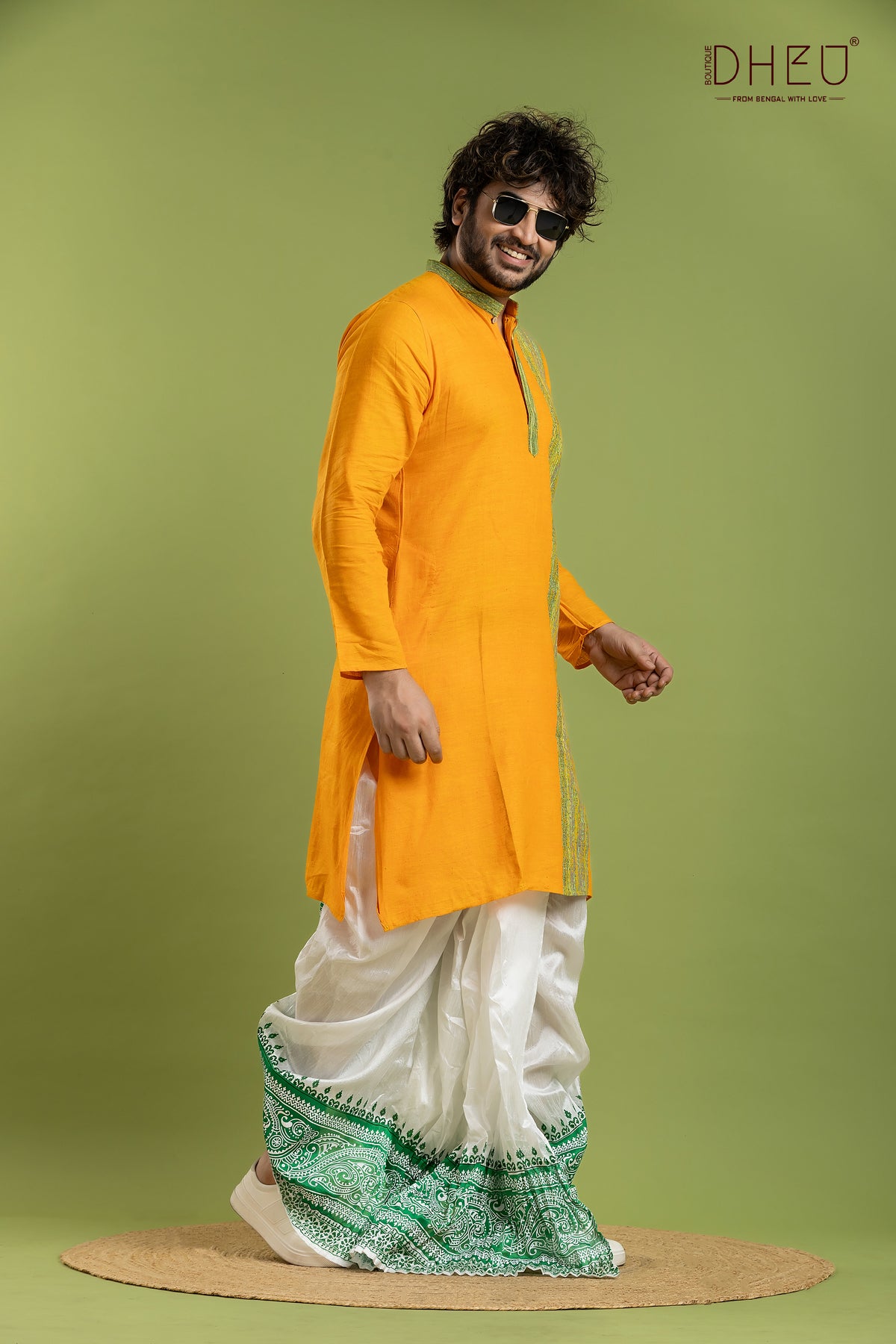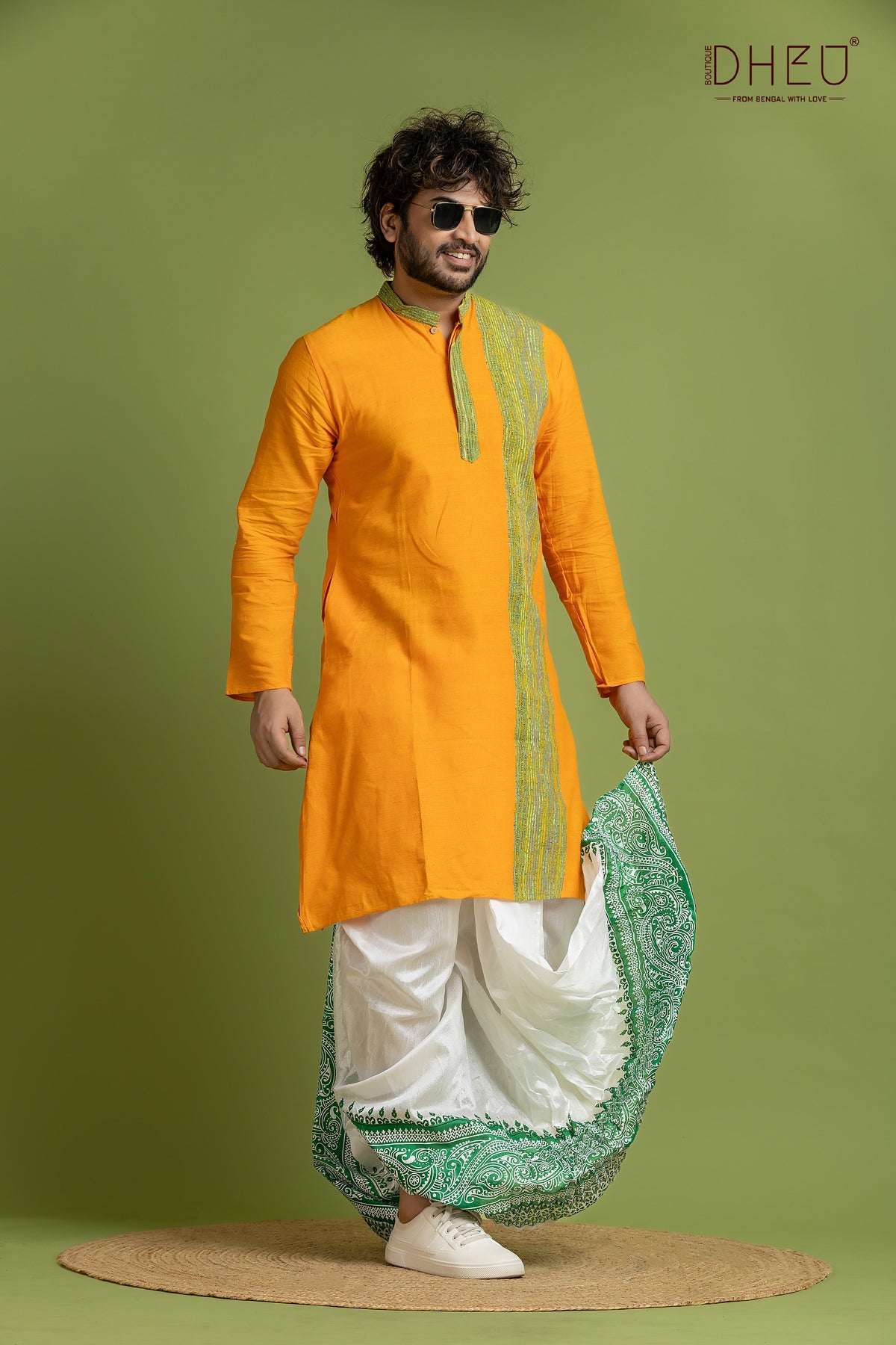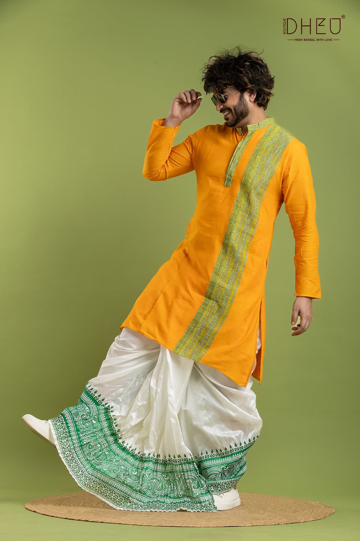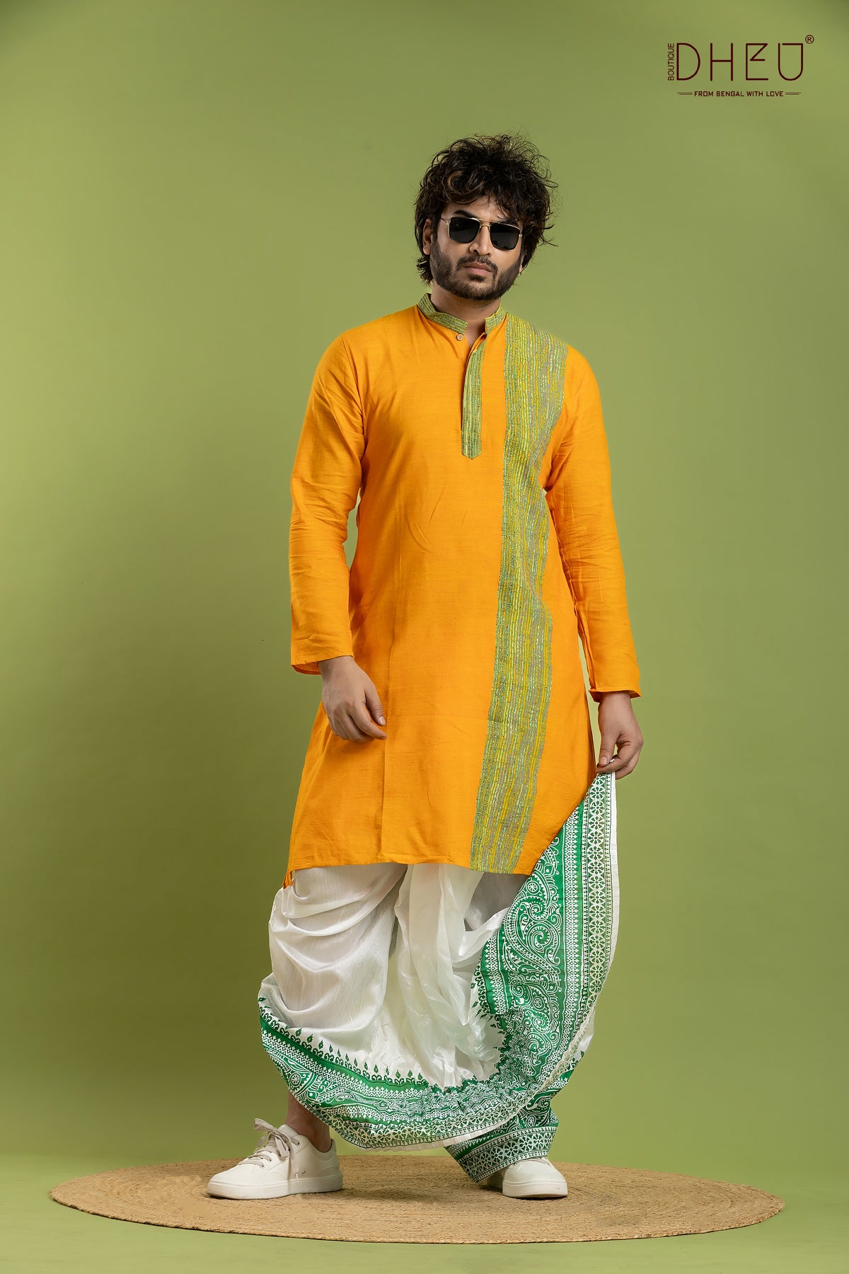Elevate your festive wardrobe with this exquisite Designer Kurta Dhoti set from Dheu. Crafted from premium Cotton, this ethnic full-sleeve kurta in Yellow pairs beautifully with an White Dupion Silk dhoti. Perfect for weddings, celebrations, and special occasions, this ready-to-wear set combines traditional craftsmanship with contemporary style.