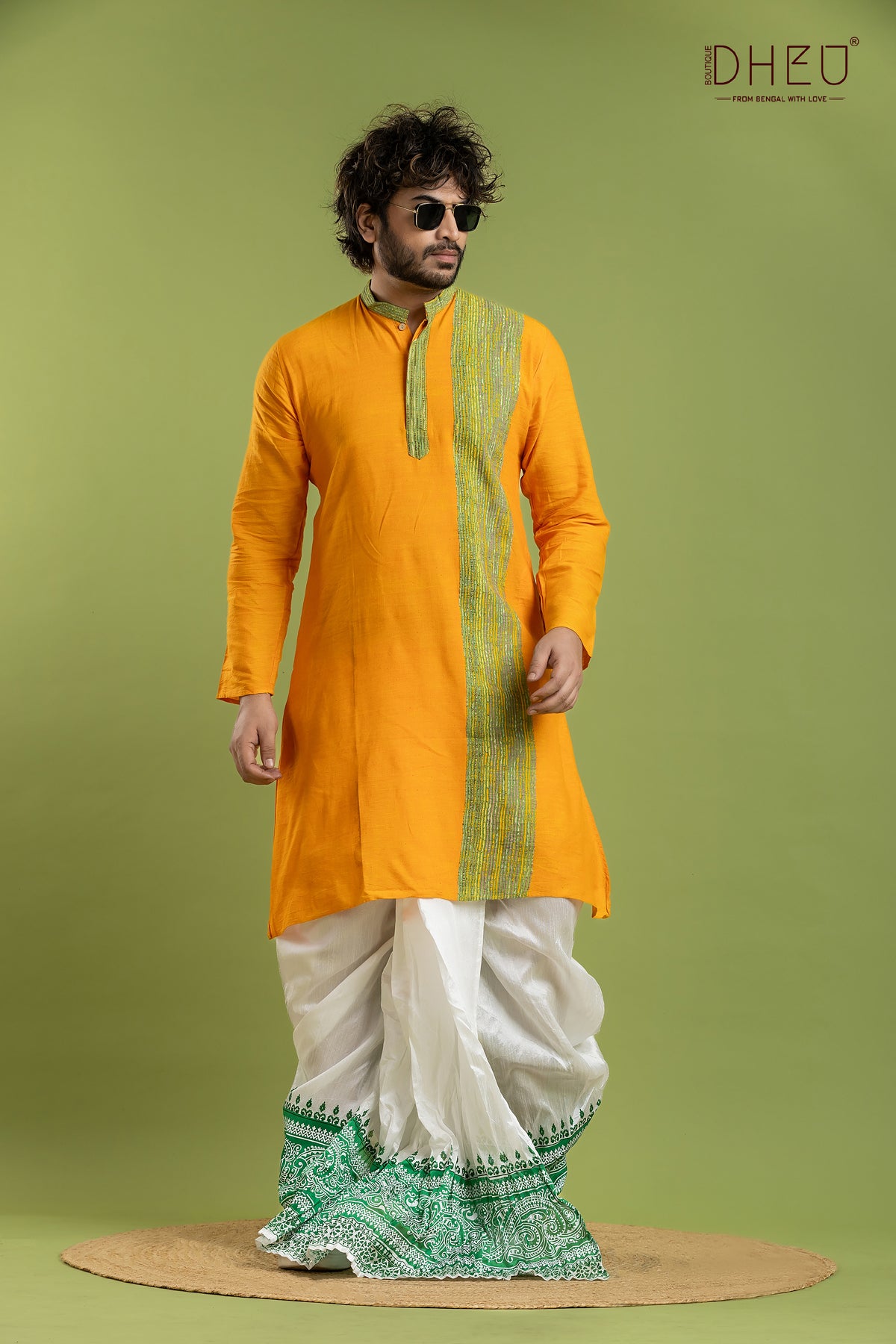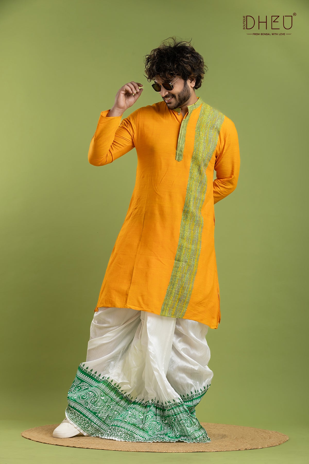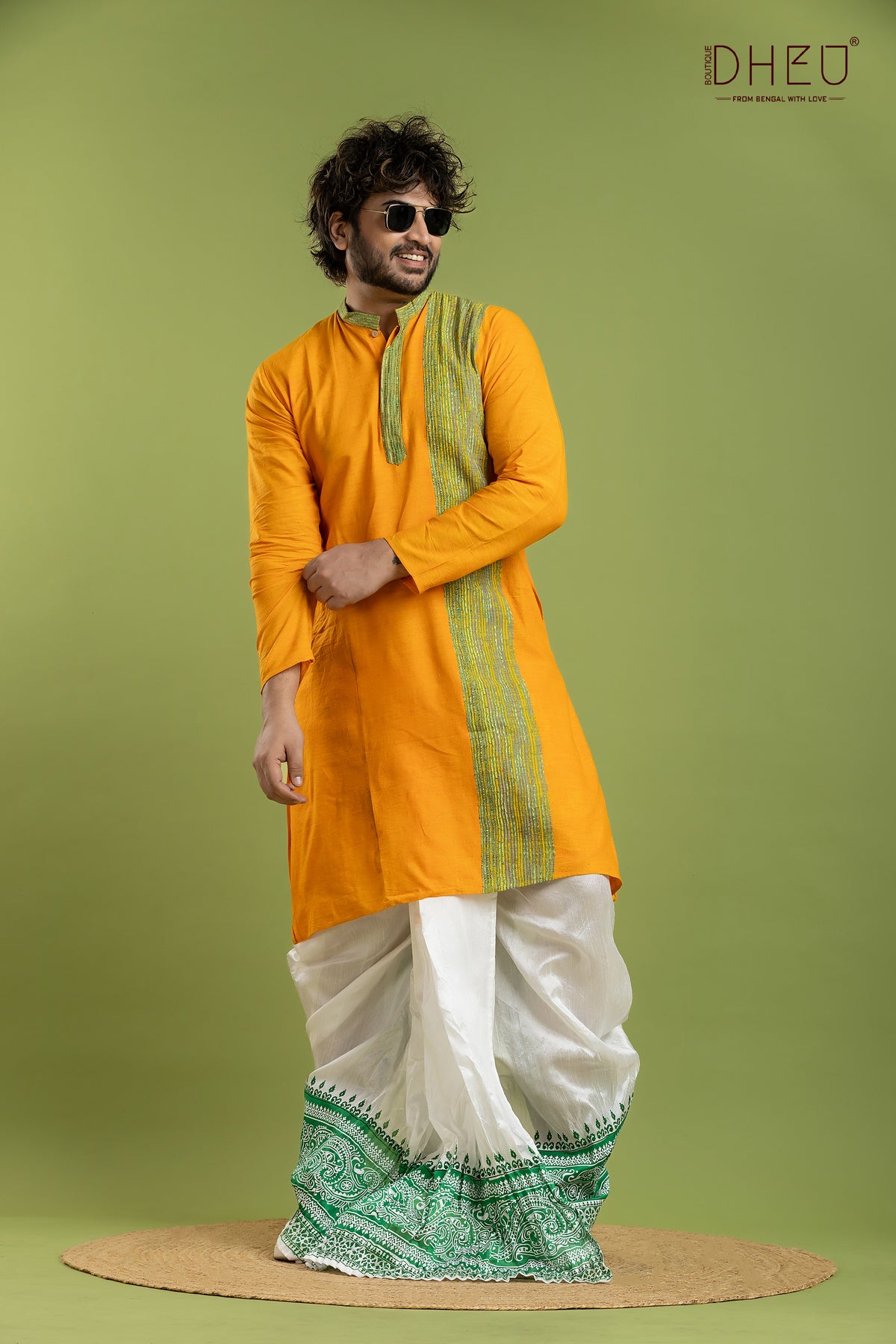 Elevate your festive wardrobe with this exquisite Designer Kurta Dhoti set from Dheu. Crafted from premium Cotton, this ethnic full-sleeve kurta in Yellow pairs beautifully with an White Dupion Silk dhoti. Perfect for weddings, celebrations, and special occasions, this ready-to-wear set combines traditional craftsmanship with contemporary style.