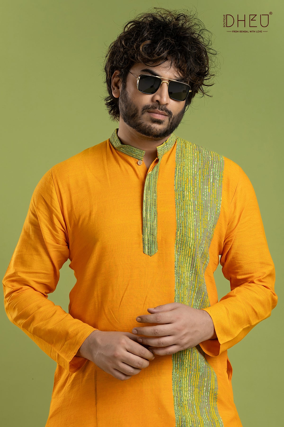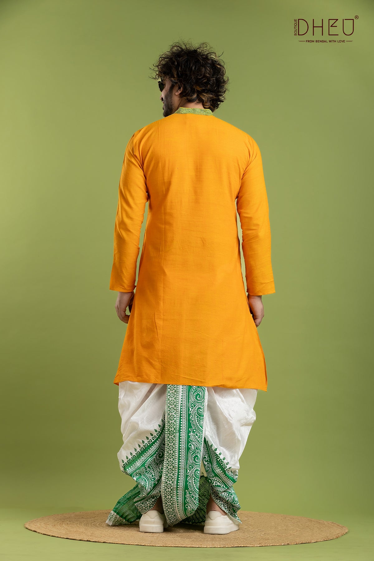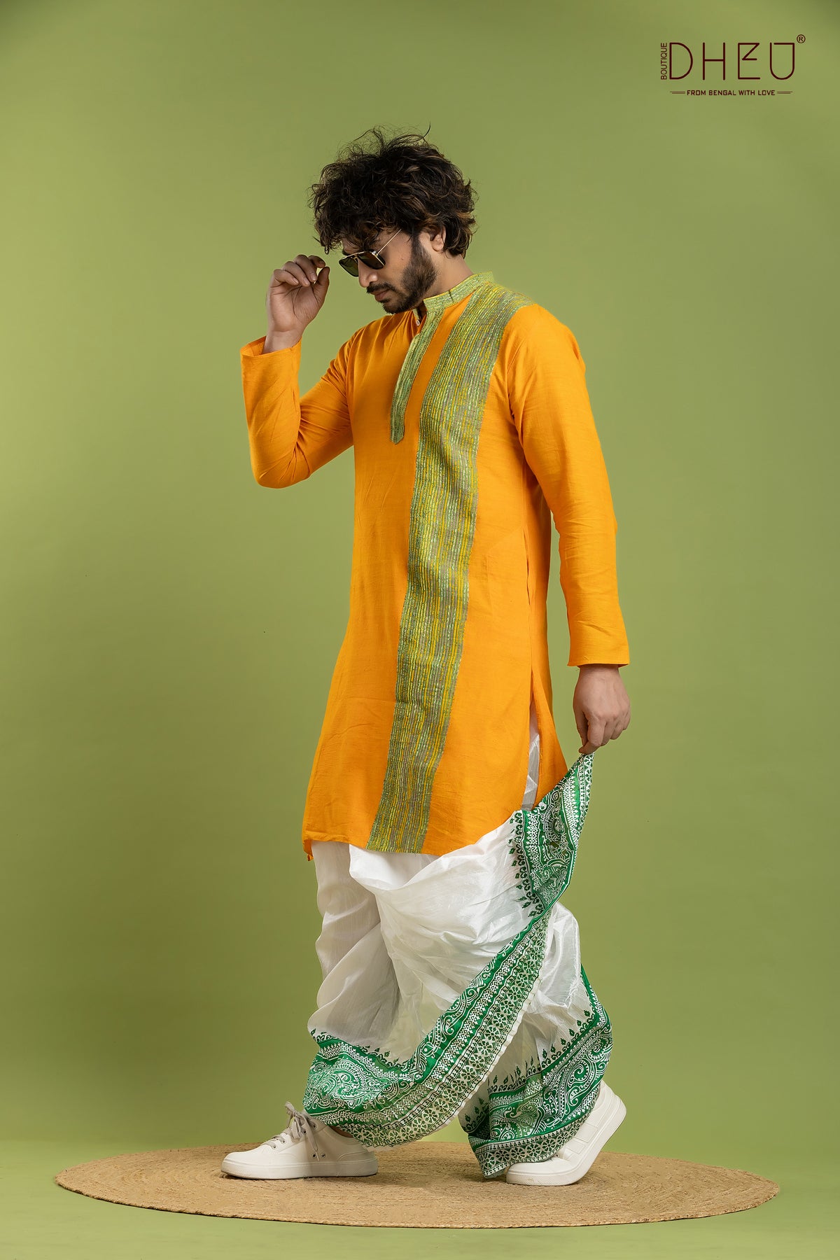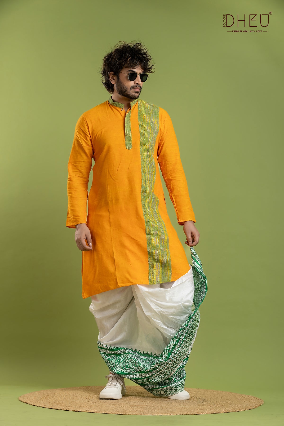 Elevate your festive wardrobe with this exquisite Designer Kurta Dhoti set from Dheu. Crafted from premium Cotton, this ethnic full-sleeve kurta in Yellow pairs beautifully with an White Dupion Silk dhoti. Perfect for weddings, celebrations, and special occasions, this ready-to-wear set combines traditional craftsmanship with contemporary style.