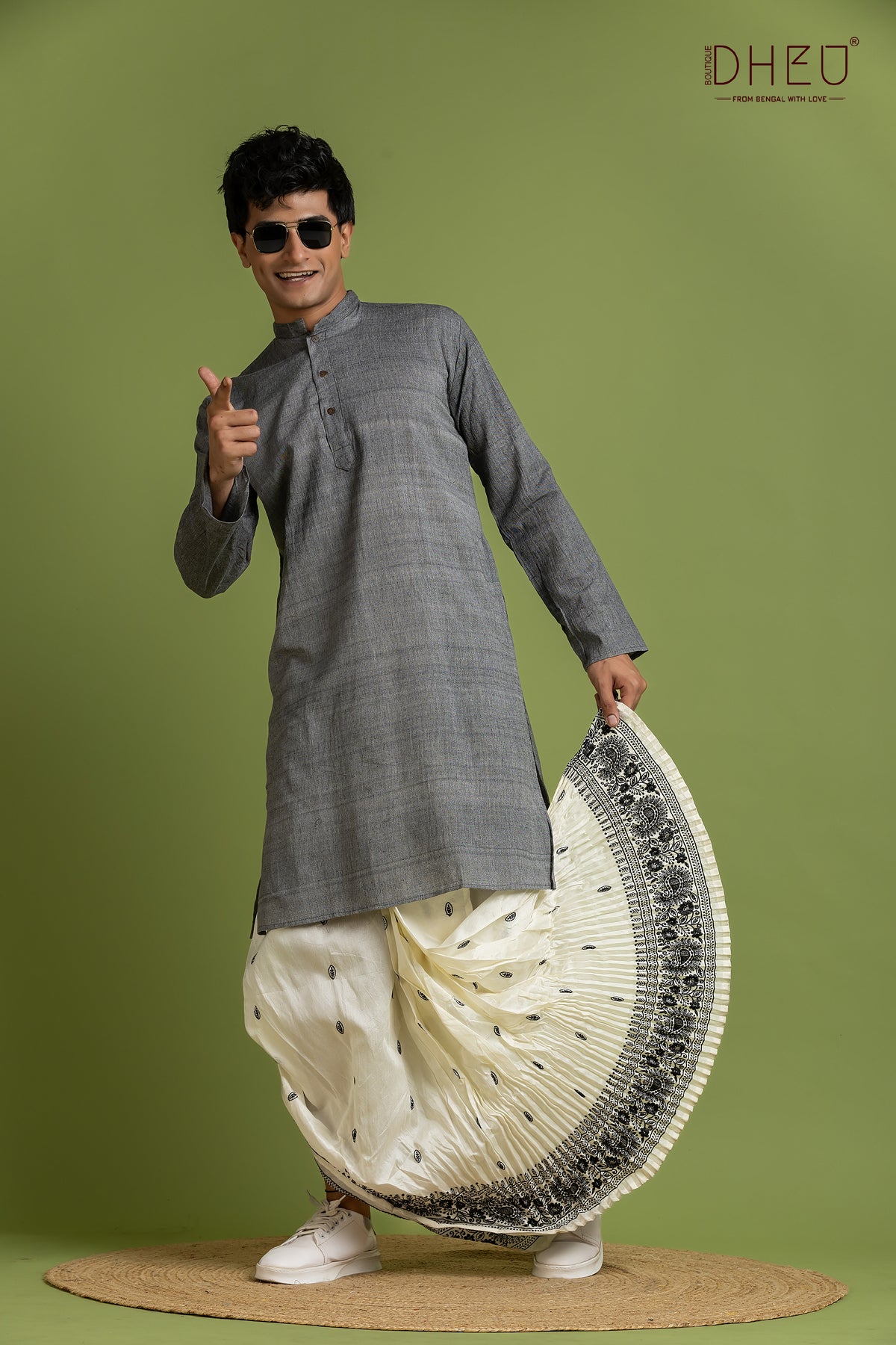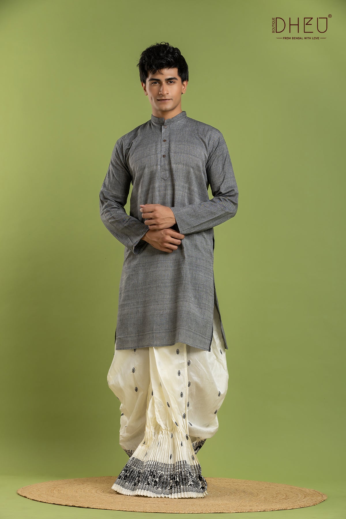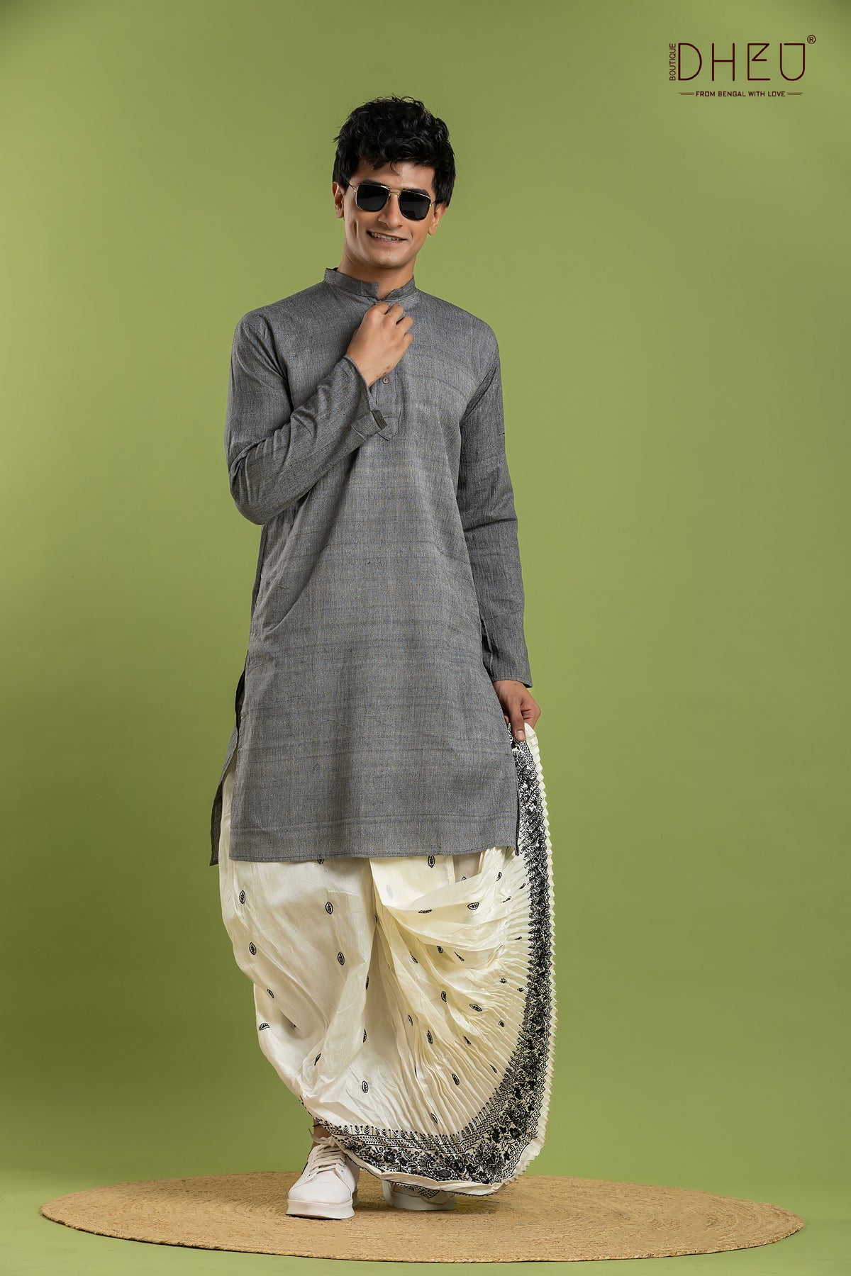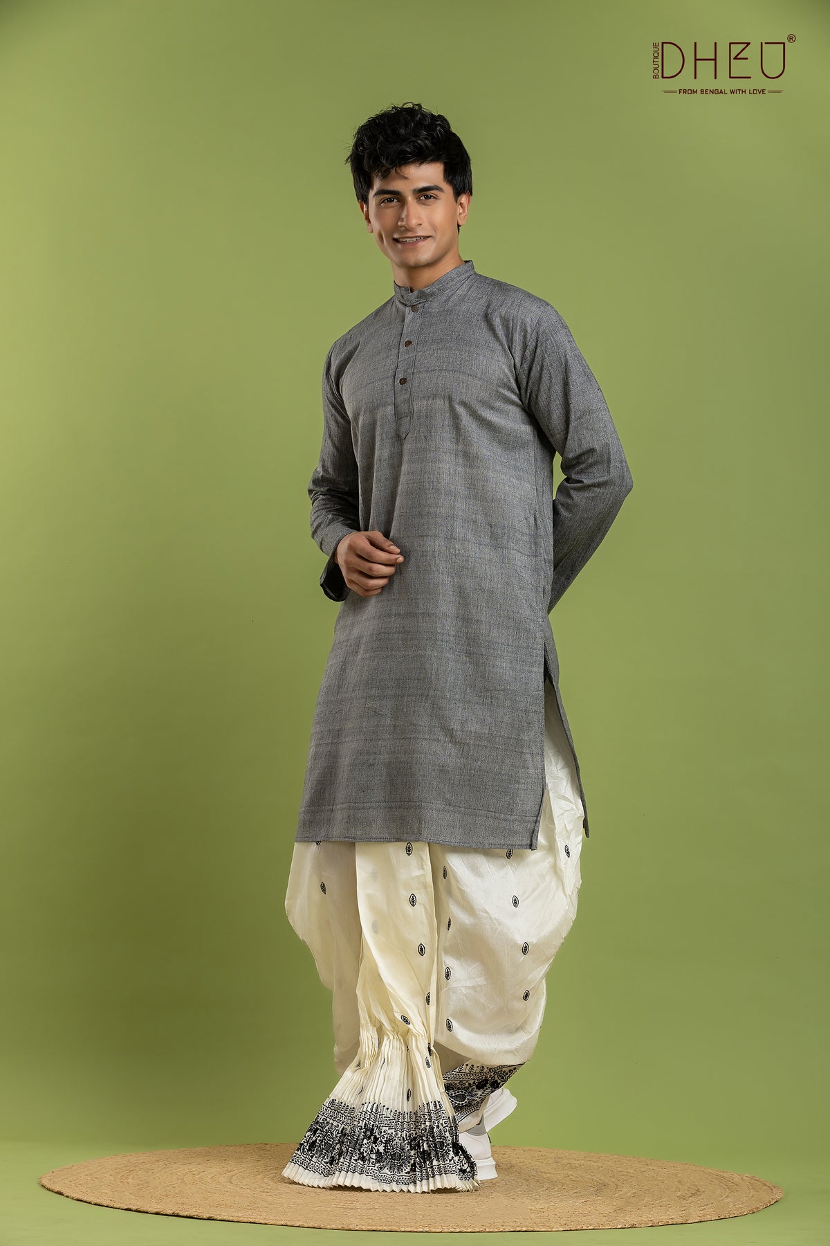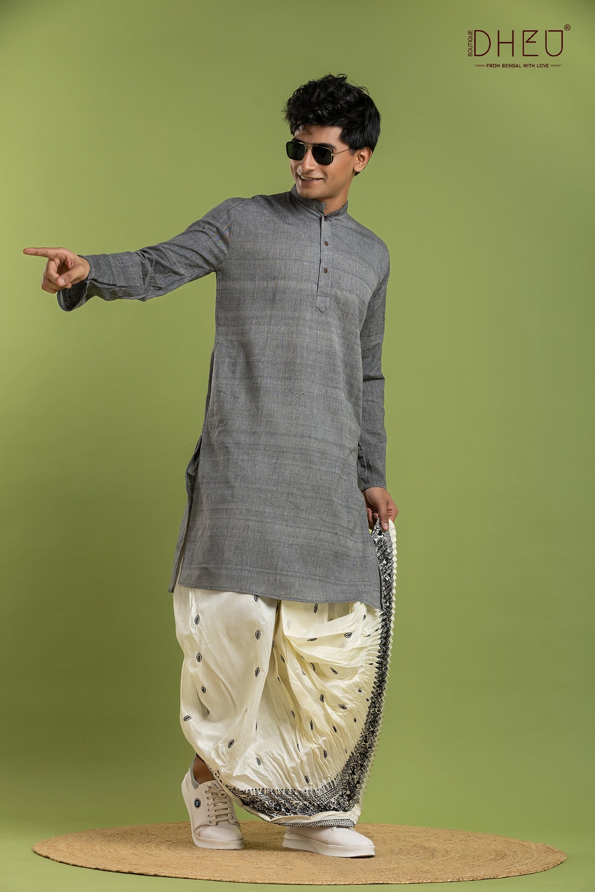 Elevate your festive wardrobe with this exquisite Designer Kurta Dhoti set from Dheu. Crafted from premium Cotton, this ethnic full-sleeve kurta in Green pairs beautifully with an White Dupion Silk dhoti. Perfect for weddings, celebrations, and special occasions, this ready-to-wear set combines traditional craftsmanship with contemporary style.