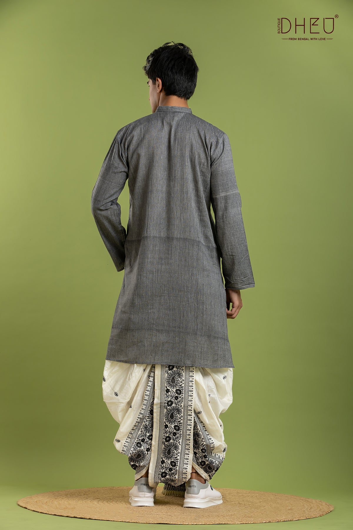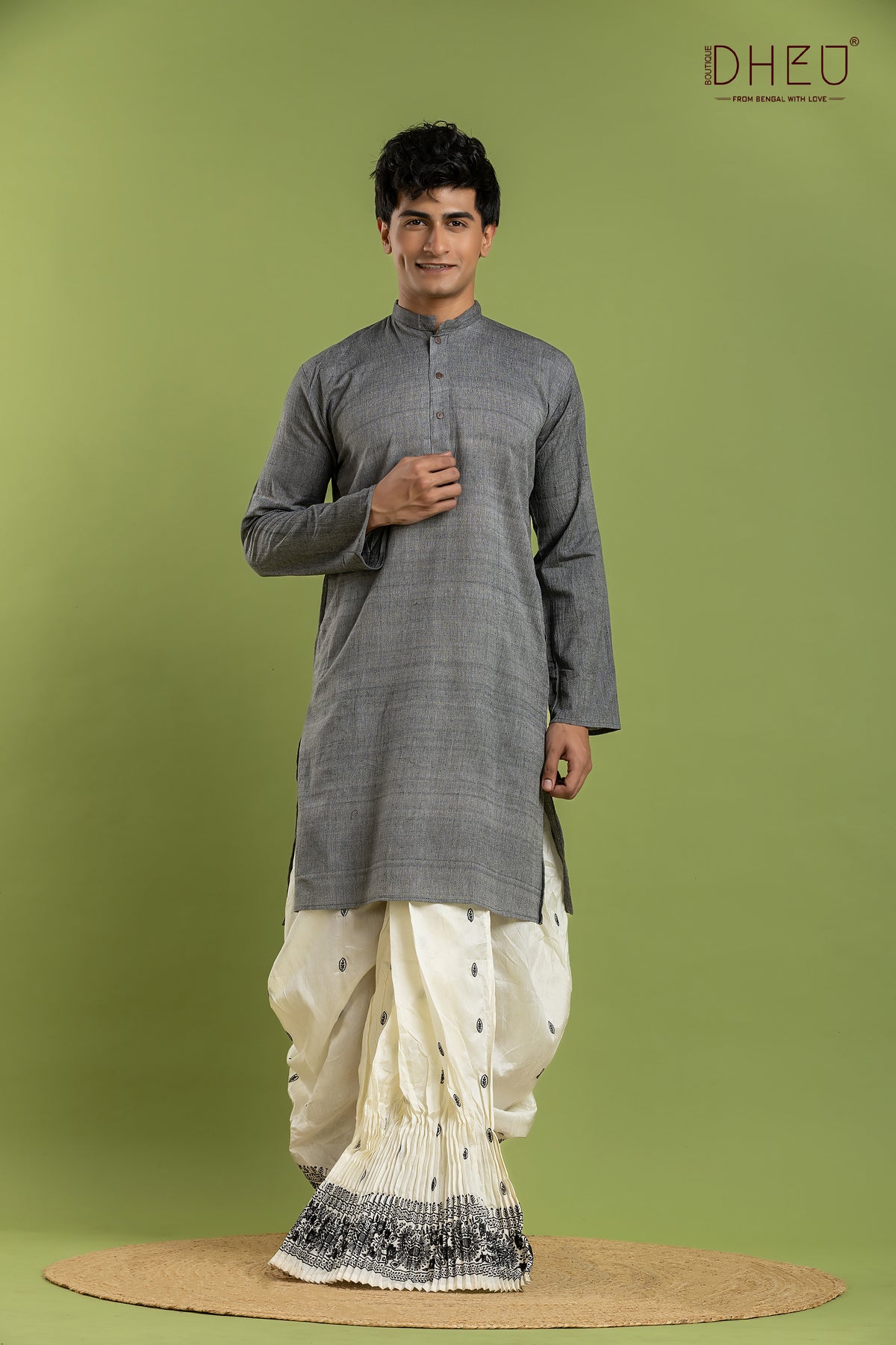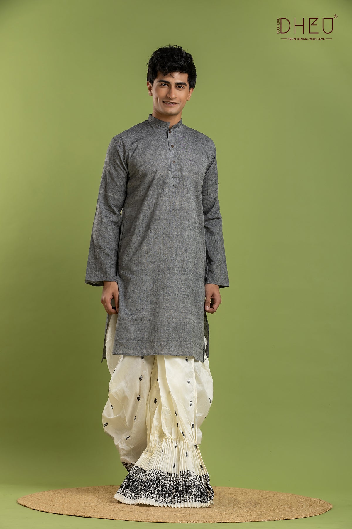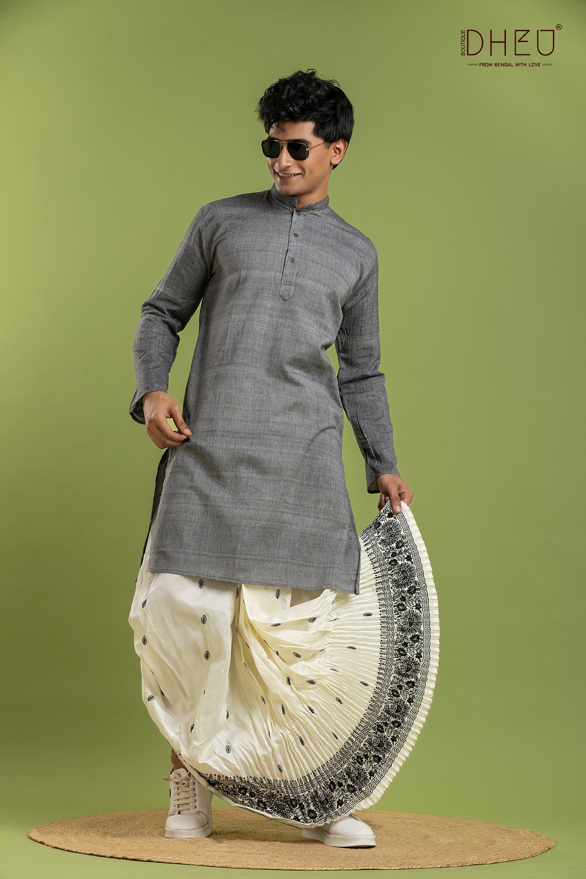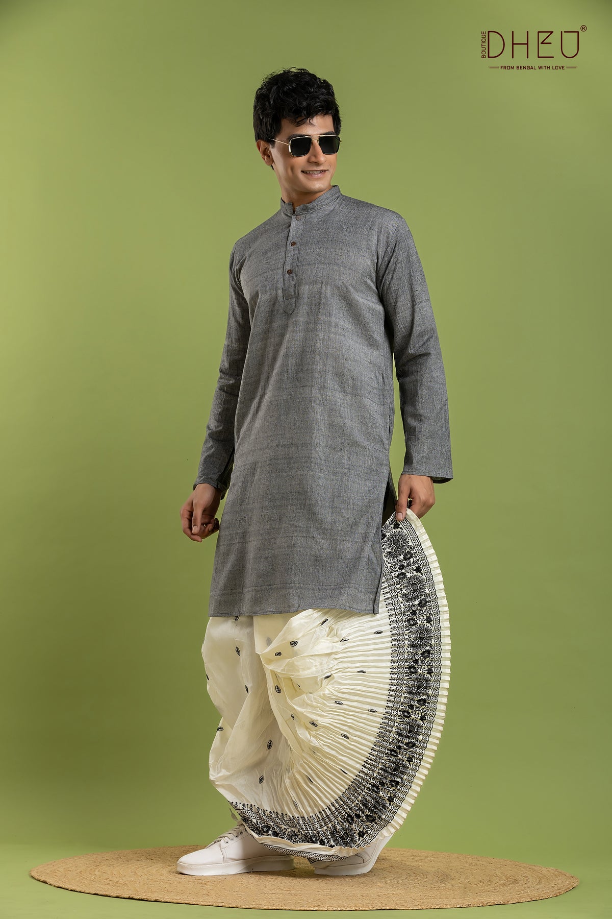 Elevate your festive wardrobe with this exquisite Designer Kurta Dhoti set from Dheu. Crafted from premium Cotton, this ethnic full-sleeve kurta in Green pairs beautifully with an White Dupion Silk dhoti. Perfect for weddings, celebrations, and special occasions, this ready-to-wear set combines traditional craftsmanship with contemporary style.