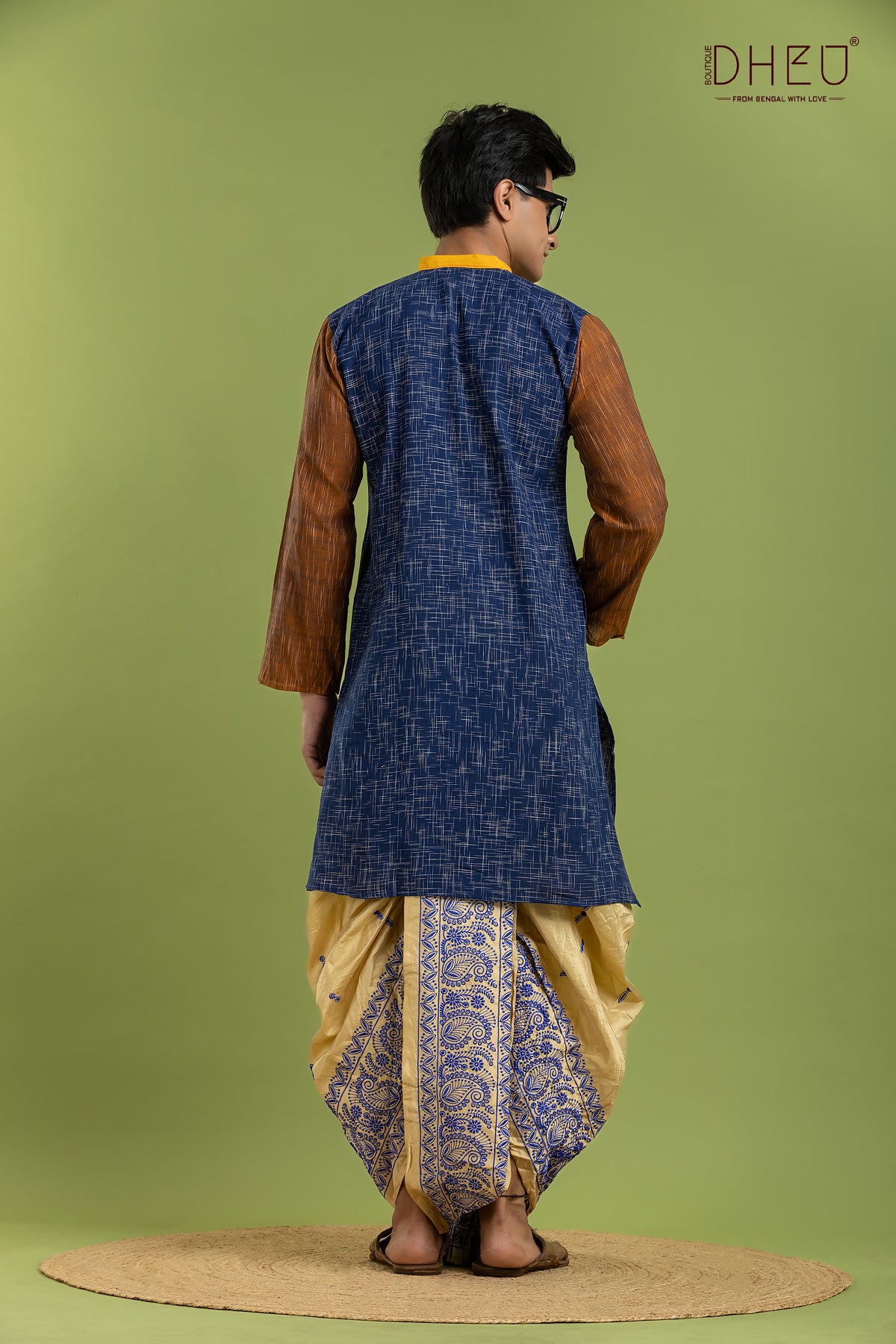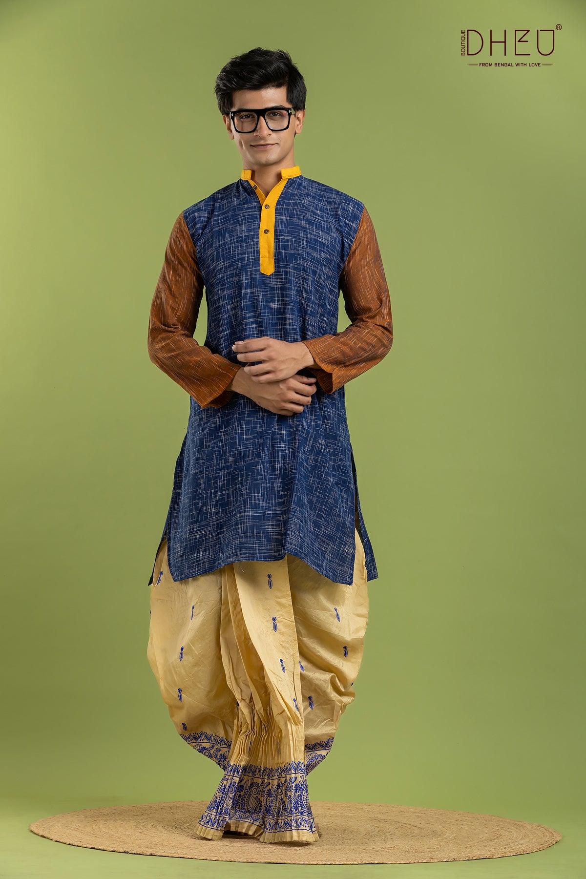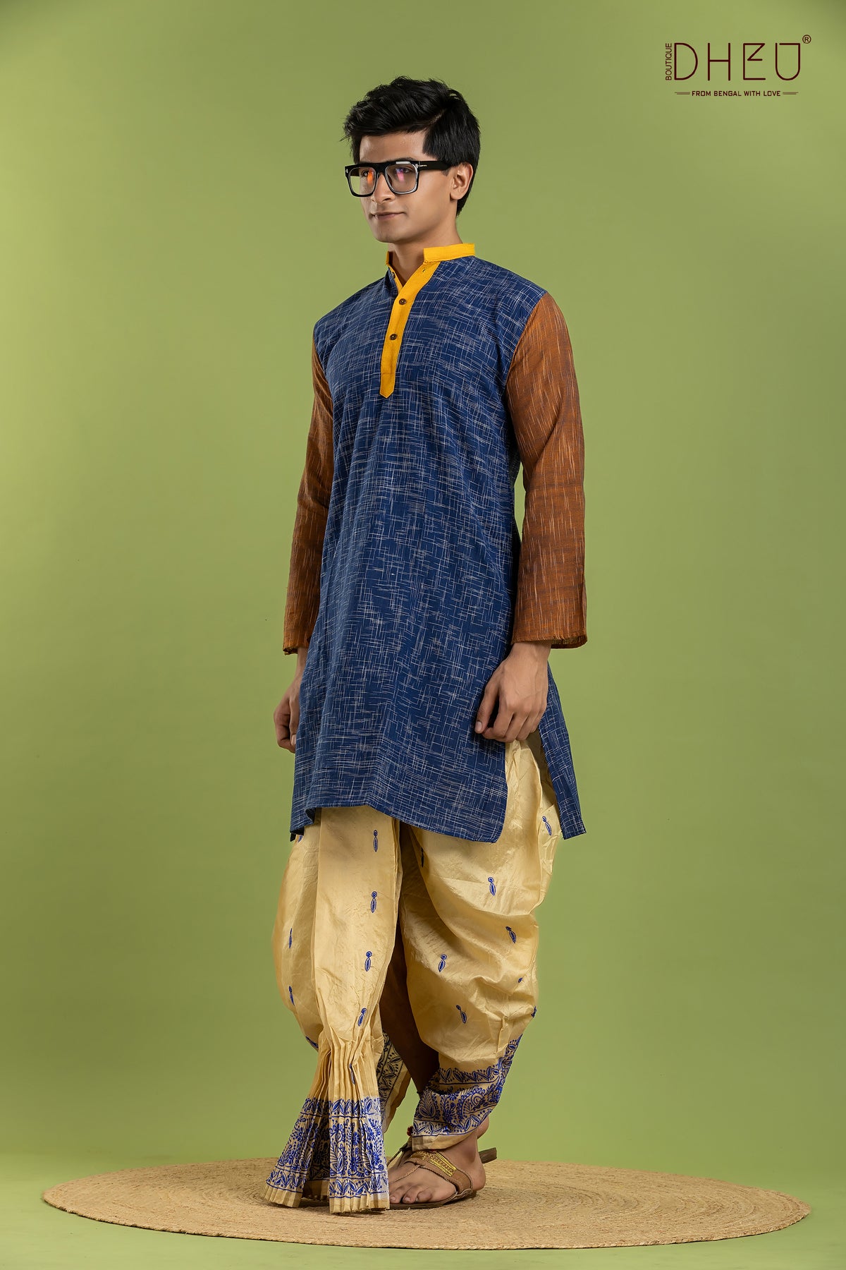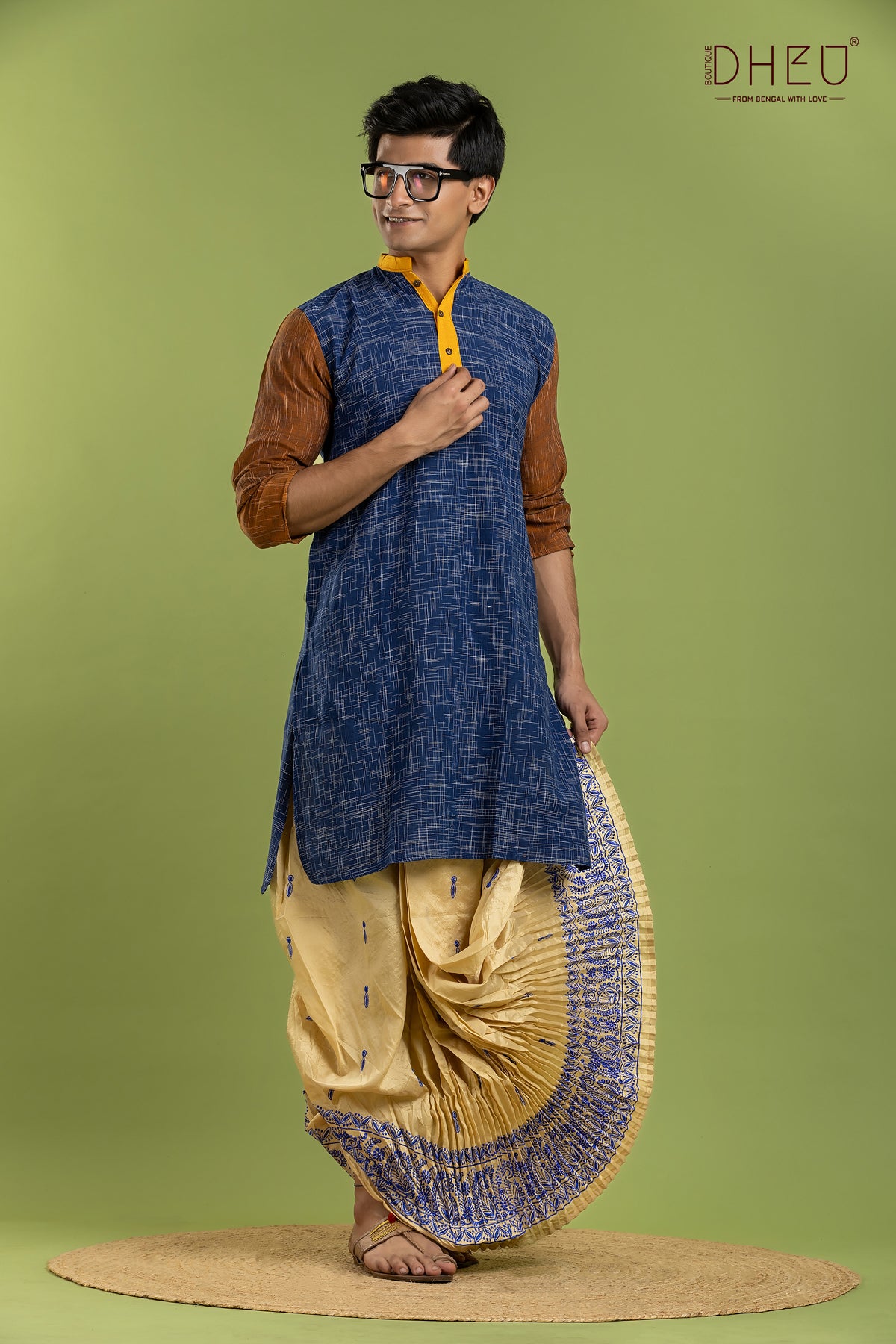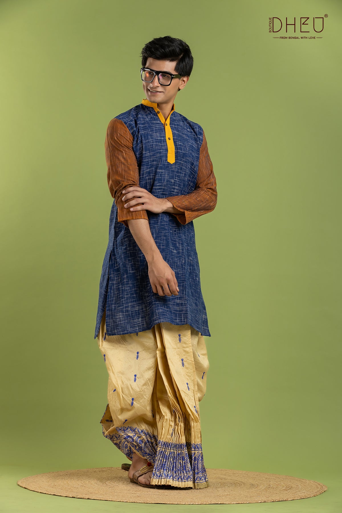 Elevate your festive wardrobe with this exquisite Designer Kurta Dhoti set from Dheu. Crafted from premium Cotton, this ethnic full-sleeve kurta in Blue with Brown pairs beautifully with an Beige Dupion Silk dhoti. Perfect for weddings, celebrations, and special occasions, this ready-to-wear set combines traditional craftsmanship with contemporary style.