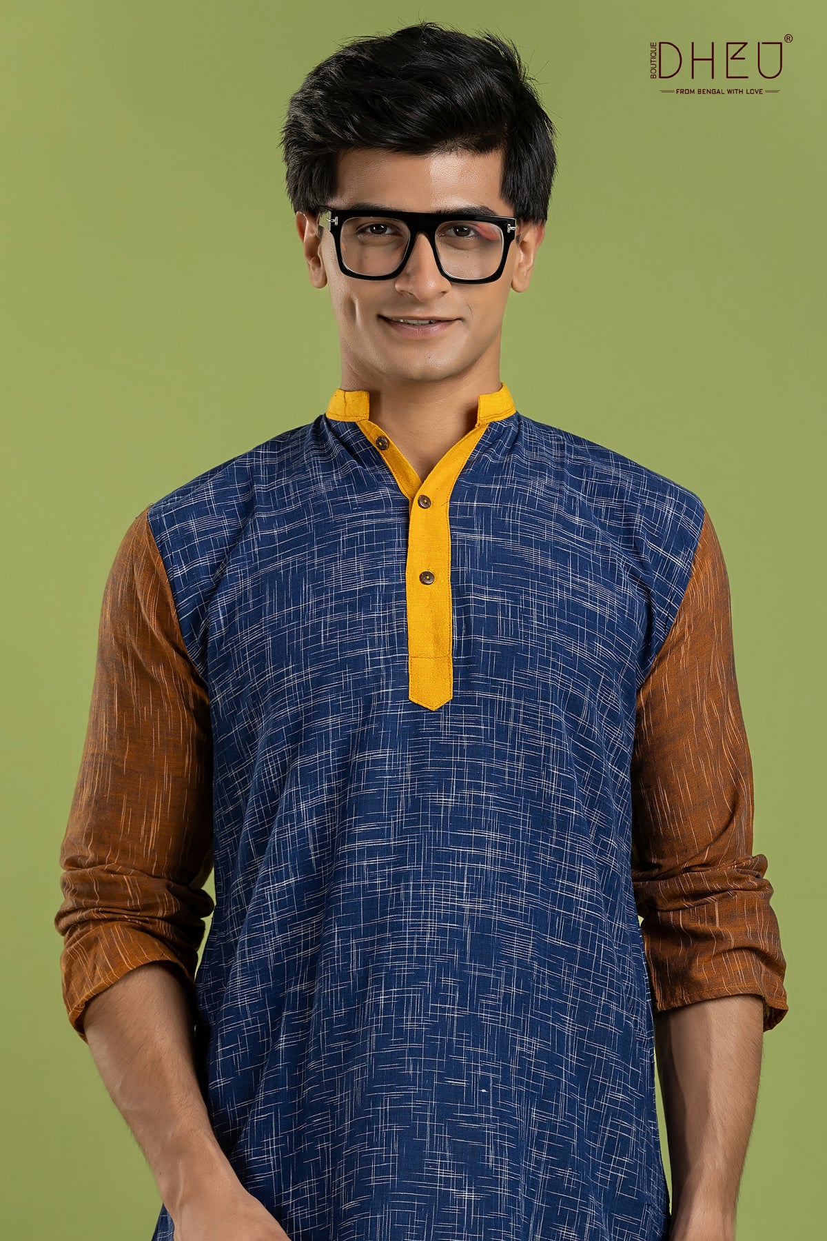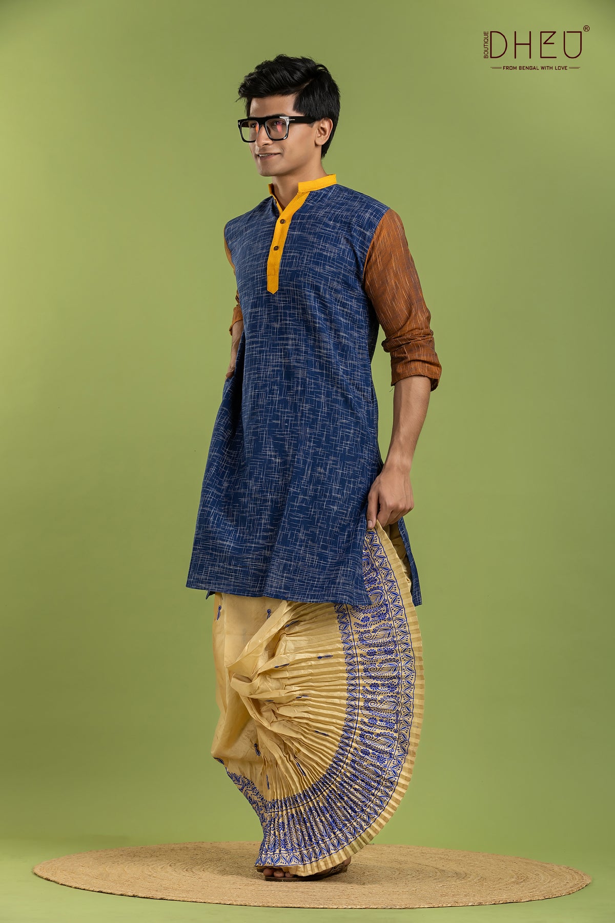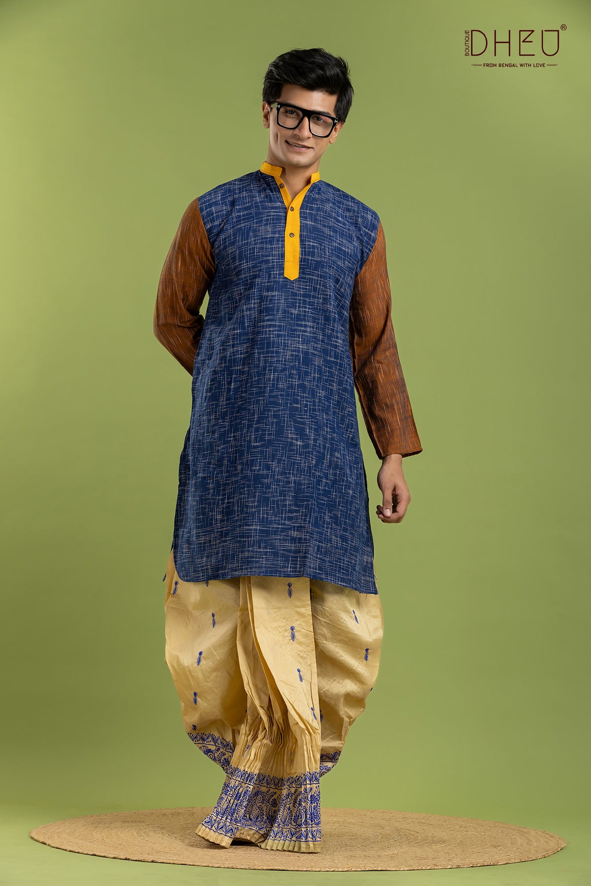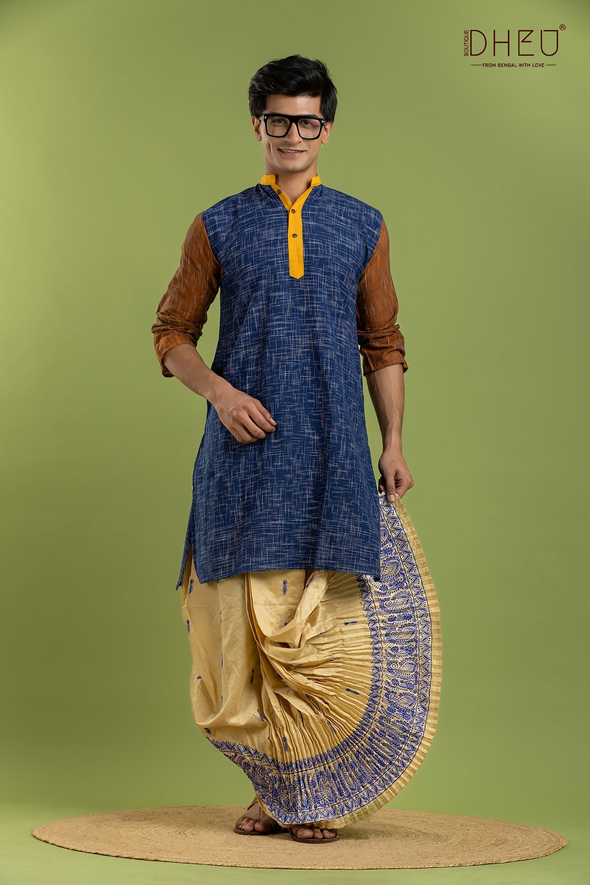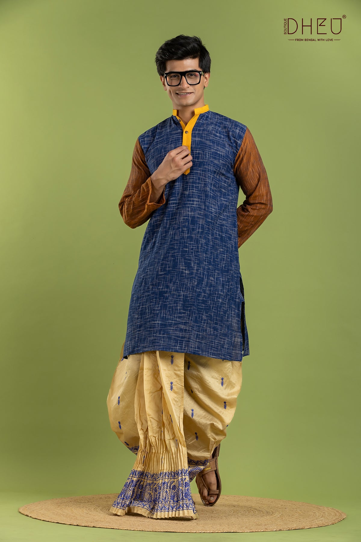 Elevate your festive wardrobe with this exquisite Designer Kurta Dhoti set from Dheu. Crafted from premium Cotton, this ethnic full-sleeve kurta in Blue with Brown pairs beautifully with an Beige Dupion Silk dhoti. Perfect for weddings, celebrations, and special occasions, this ready-to-wear set combines traditional craftsmanship with contemporary style.