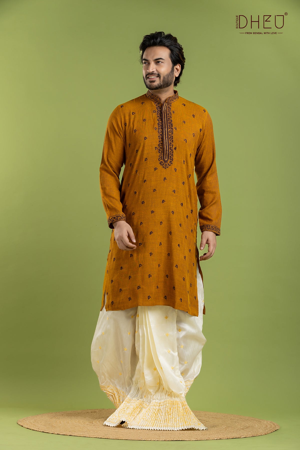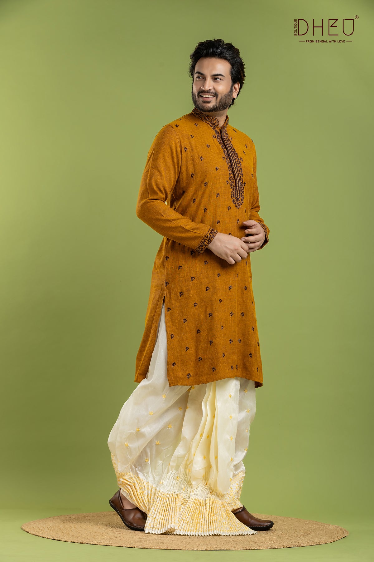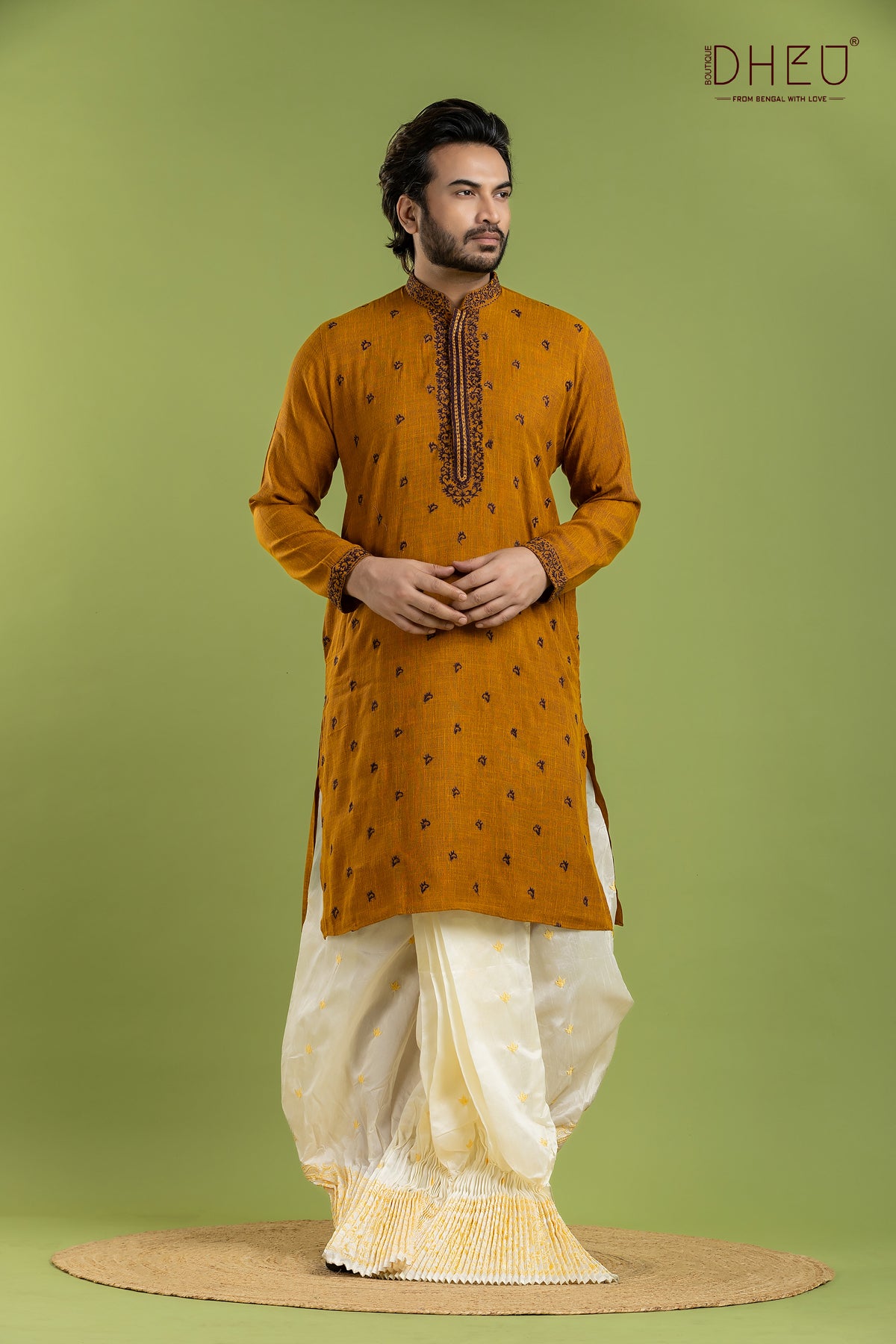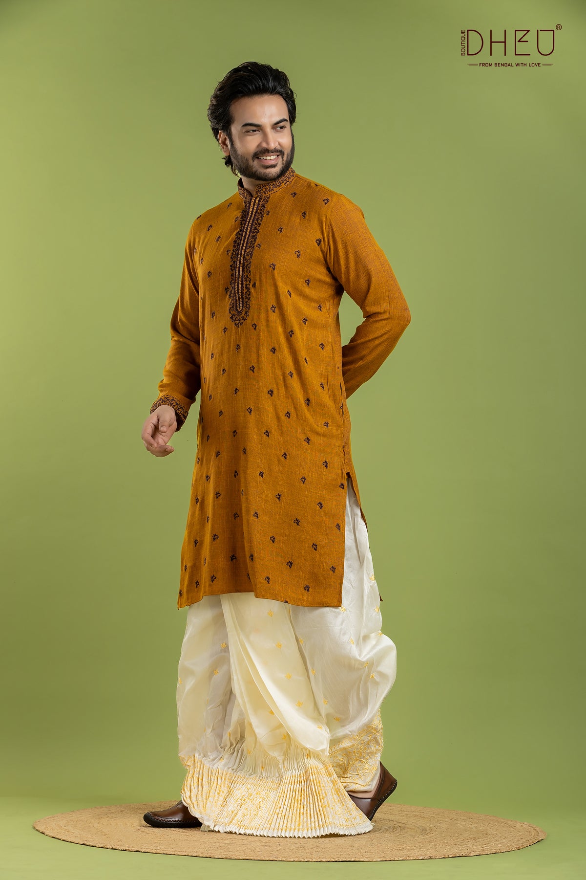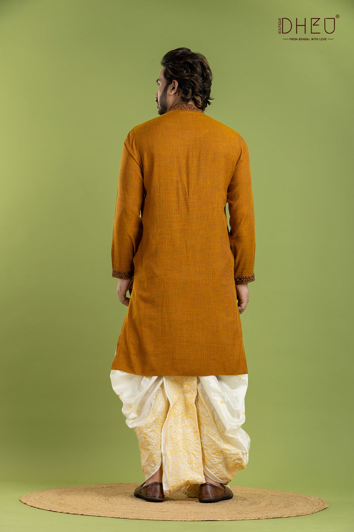 Elevate your festive wardrobe with this exquisite Designer Kurta Dhoti set from Dheu. Crafted from premium Cotton, this ethnic full-sleeve kurta in Golden Brown pairs beautifully with an optional Off White Dupion Silk dhoti. Perfect for weddings, celebrations, and special occasions, this ready-to-wear set combines traditional craftsmanship with contemporary style.
