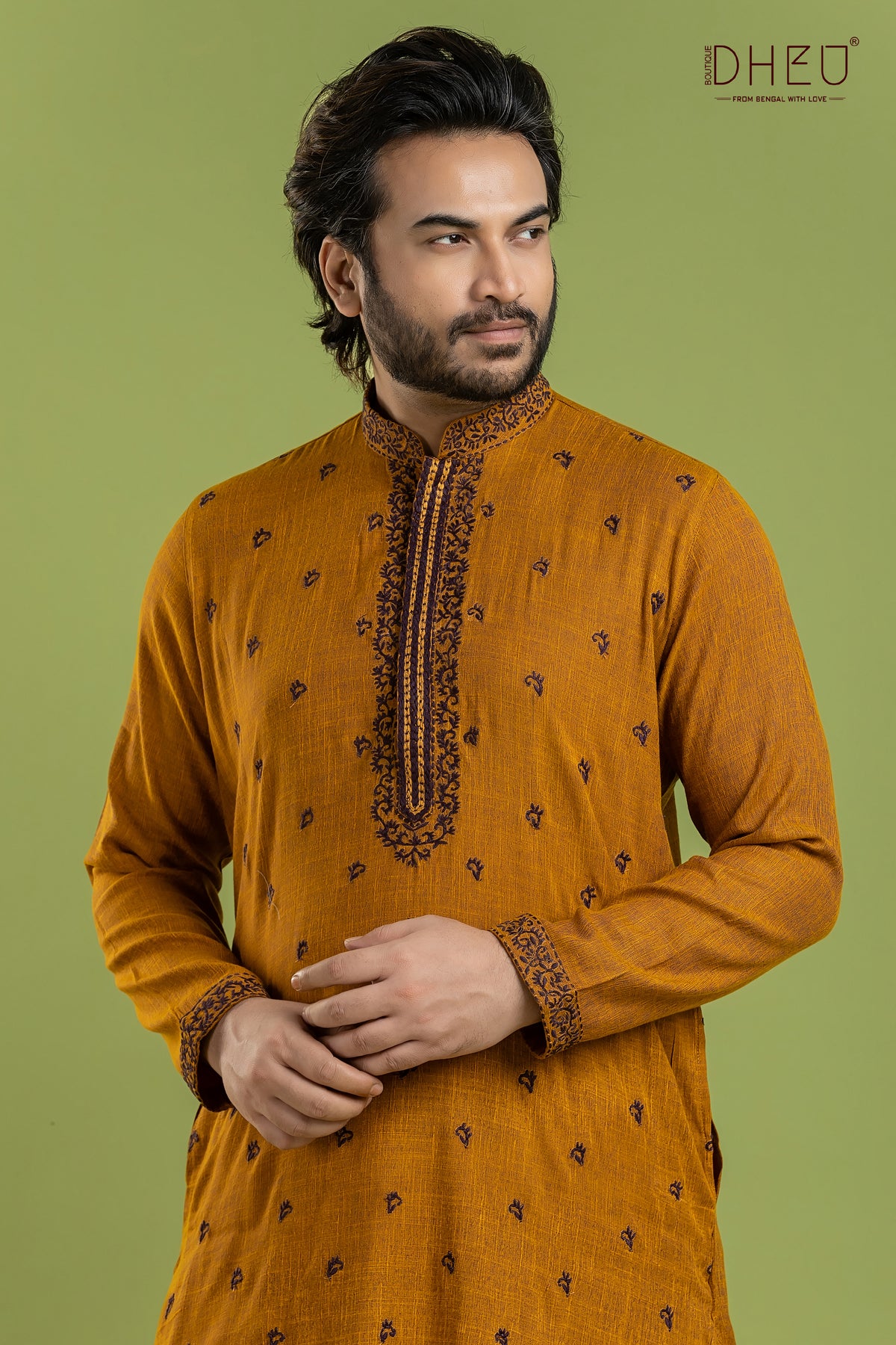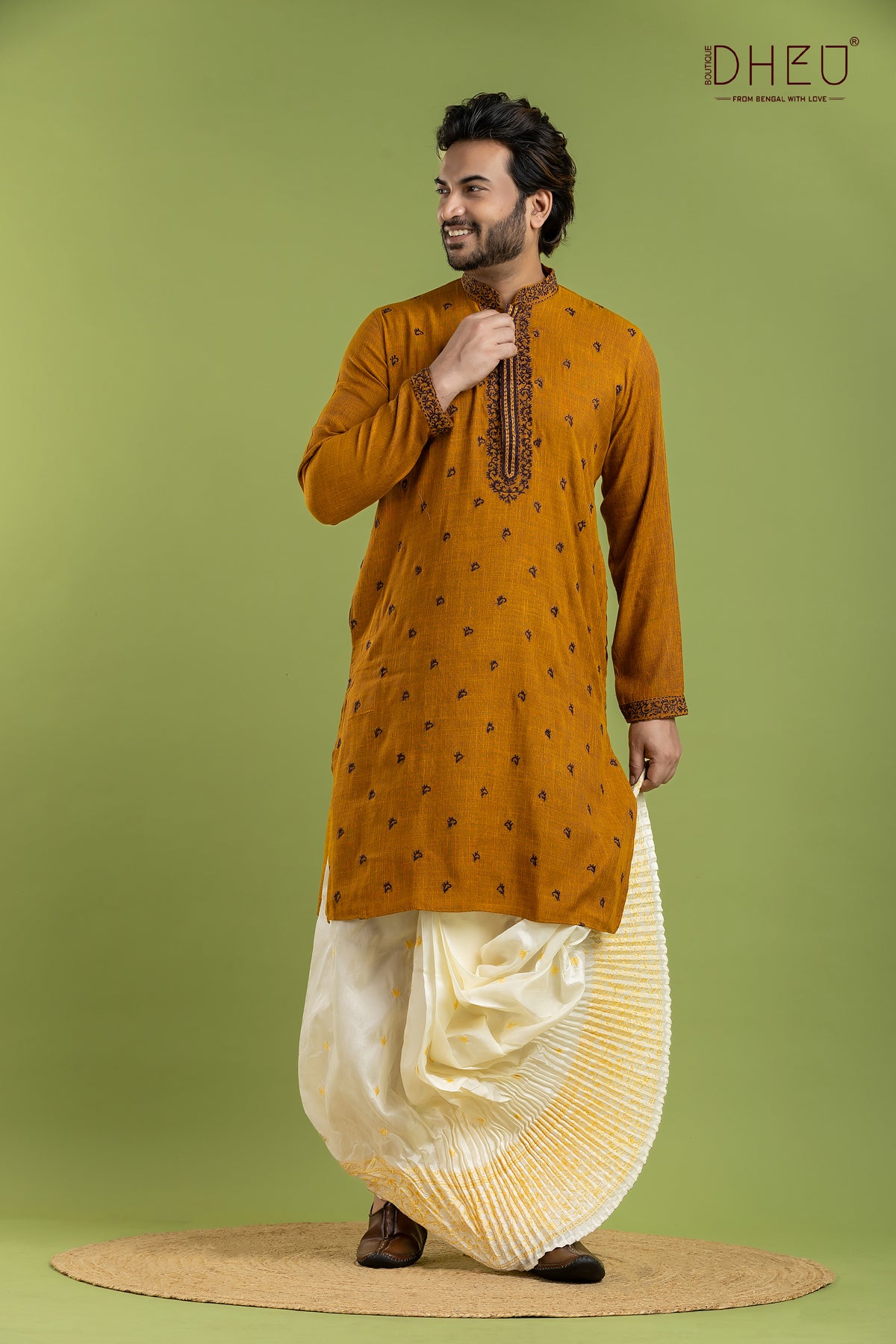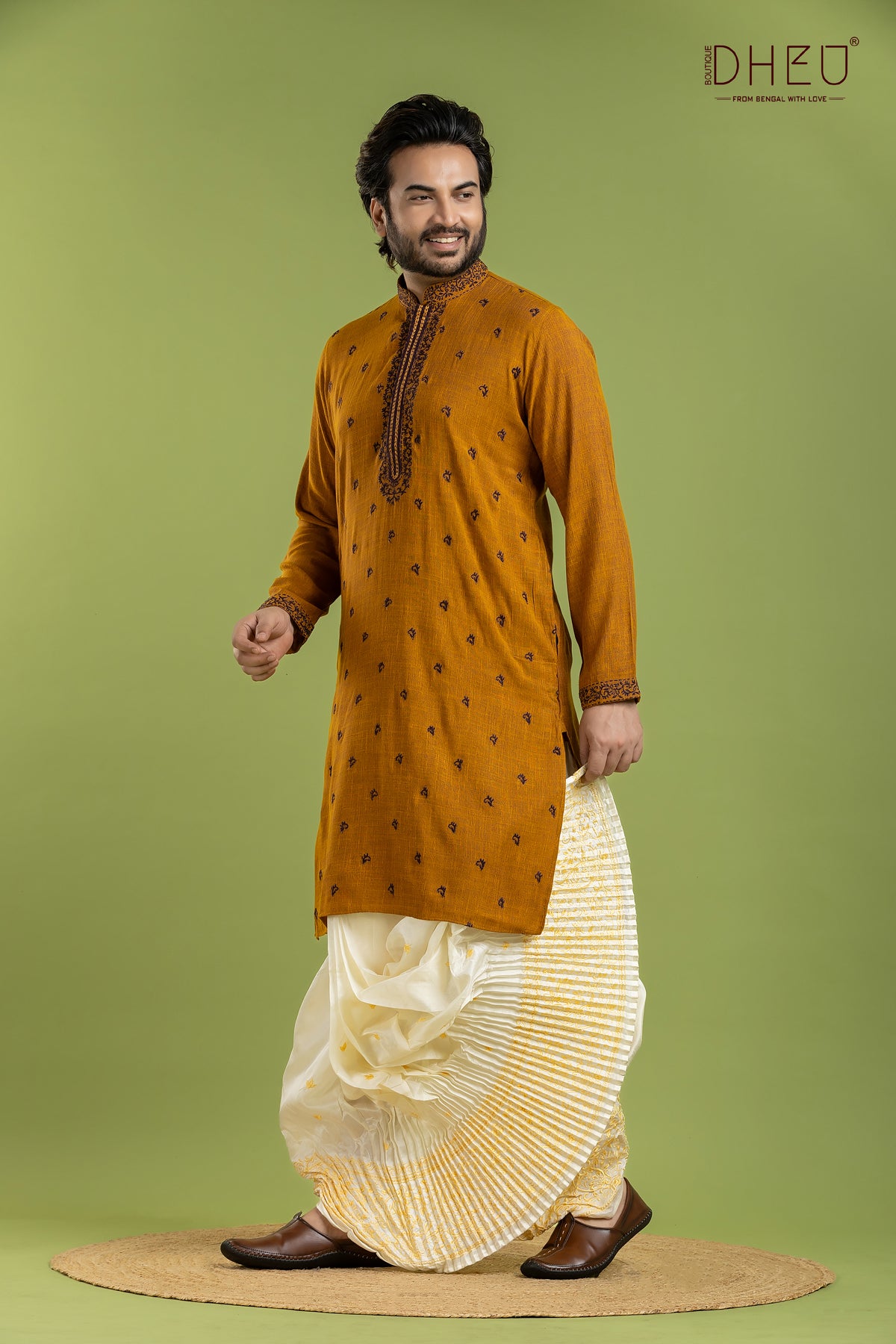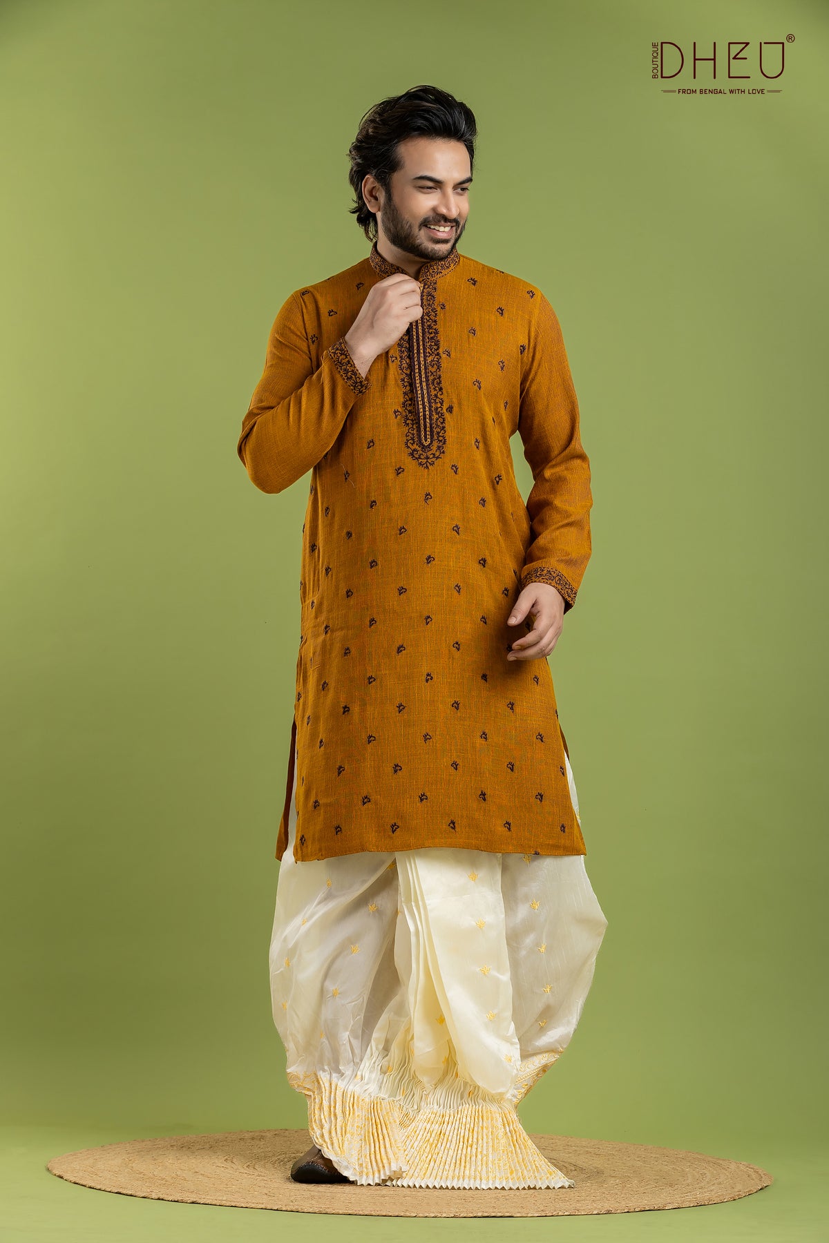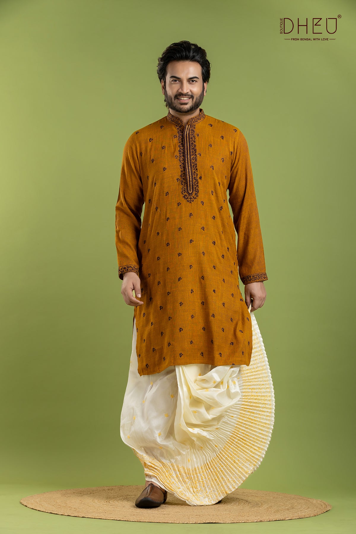 Elevate your festive wardrobe with this exquisite Designer Kurta Dhoti set from Dheu. Crafted from premium Cotton, this ethnic full-sleeve kurta in Golden Brown pairs beautifully with an optional Off White Dupion Silk dhoti. Perfect for weddings, celebrations, and special occasions, this ready-to-wear set combines traditional craftsmanship with contemporary style.