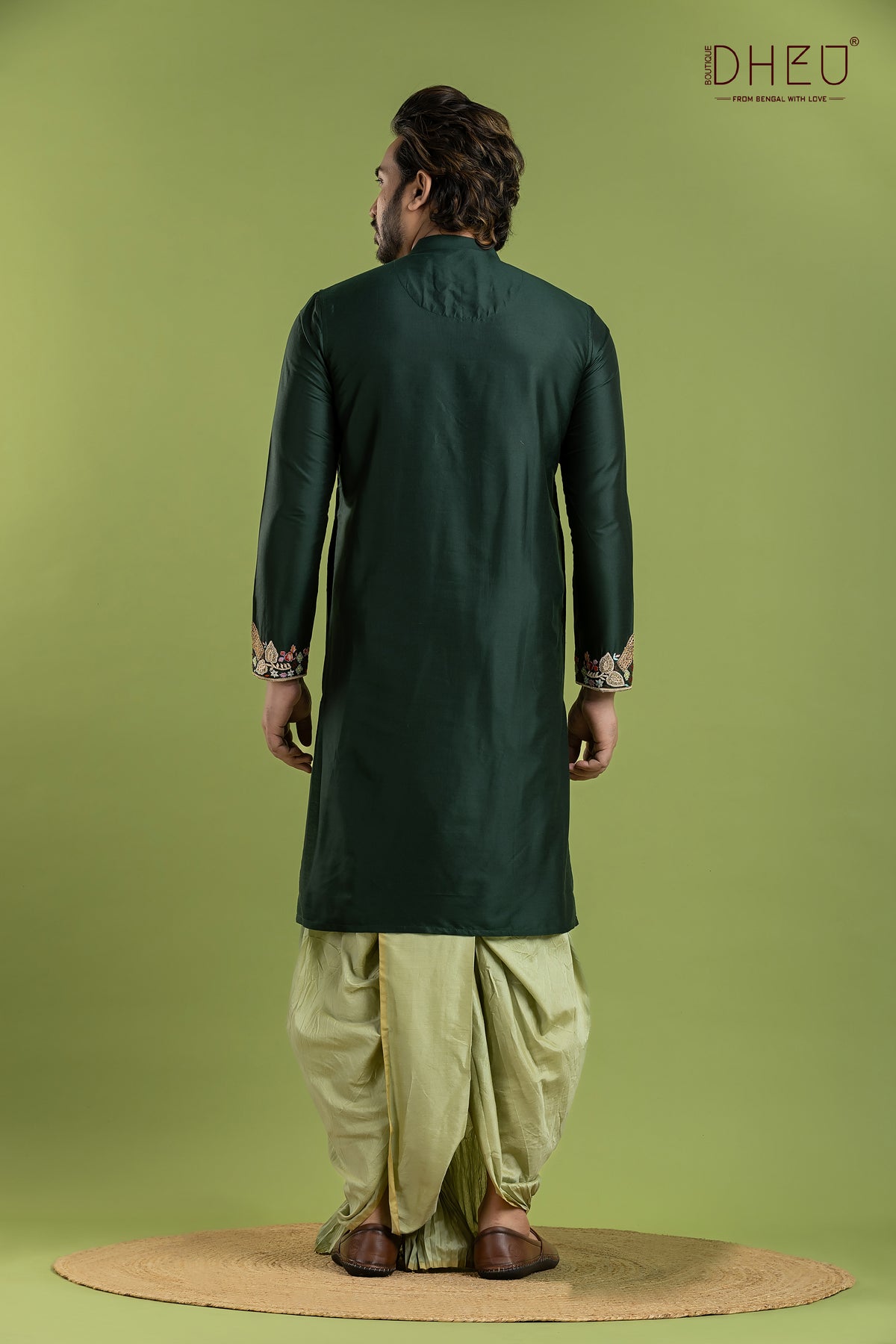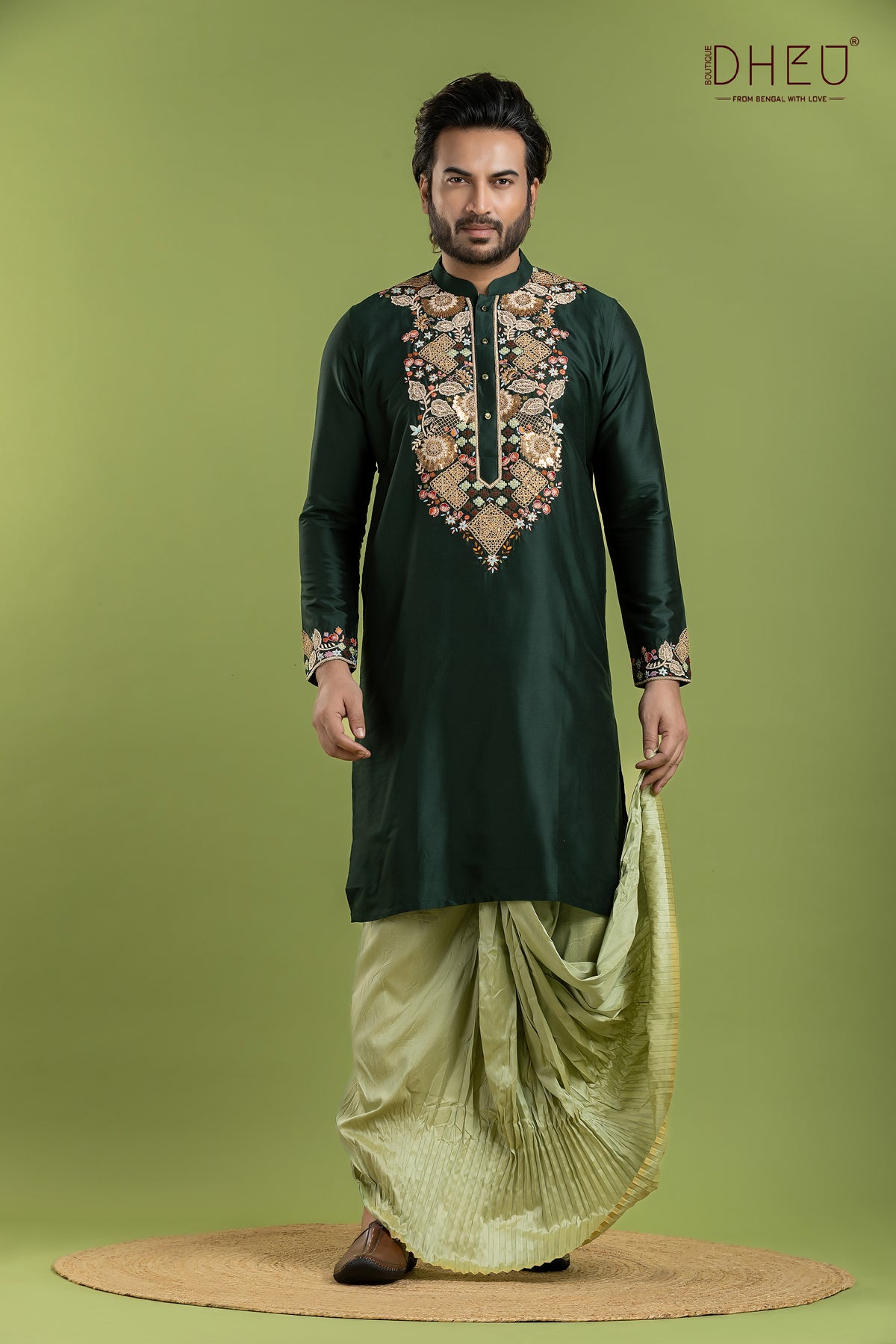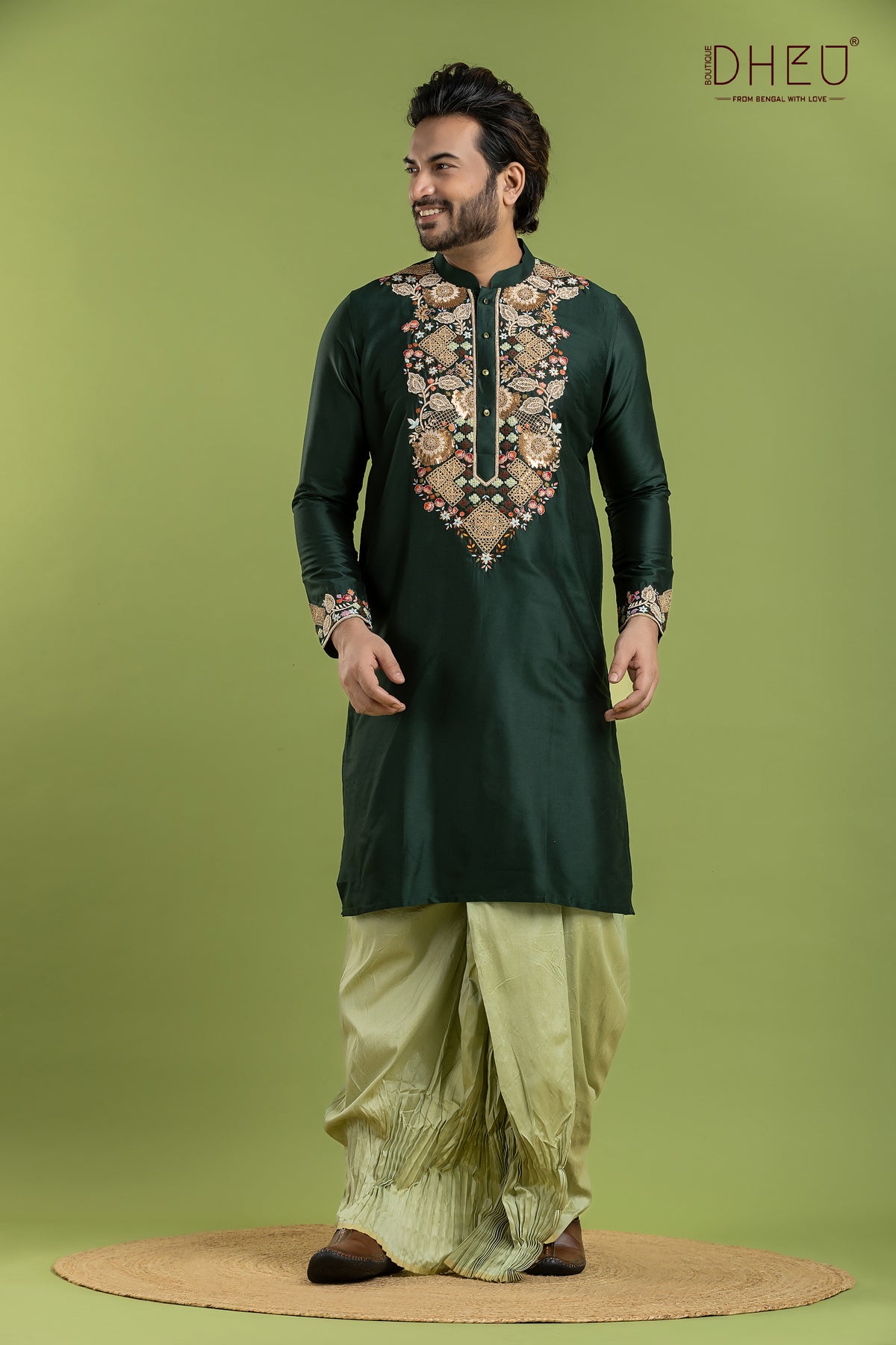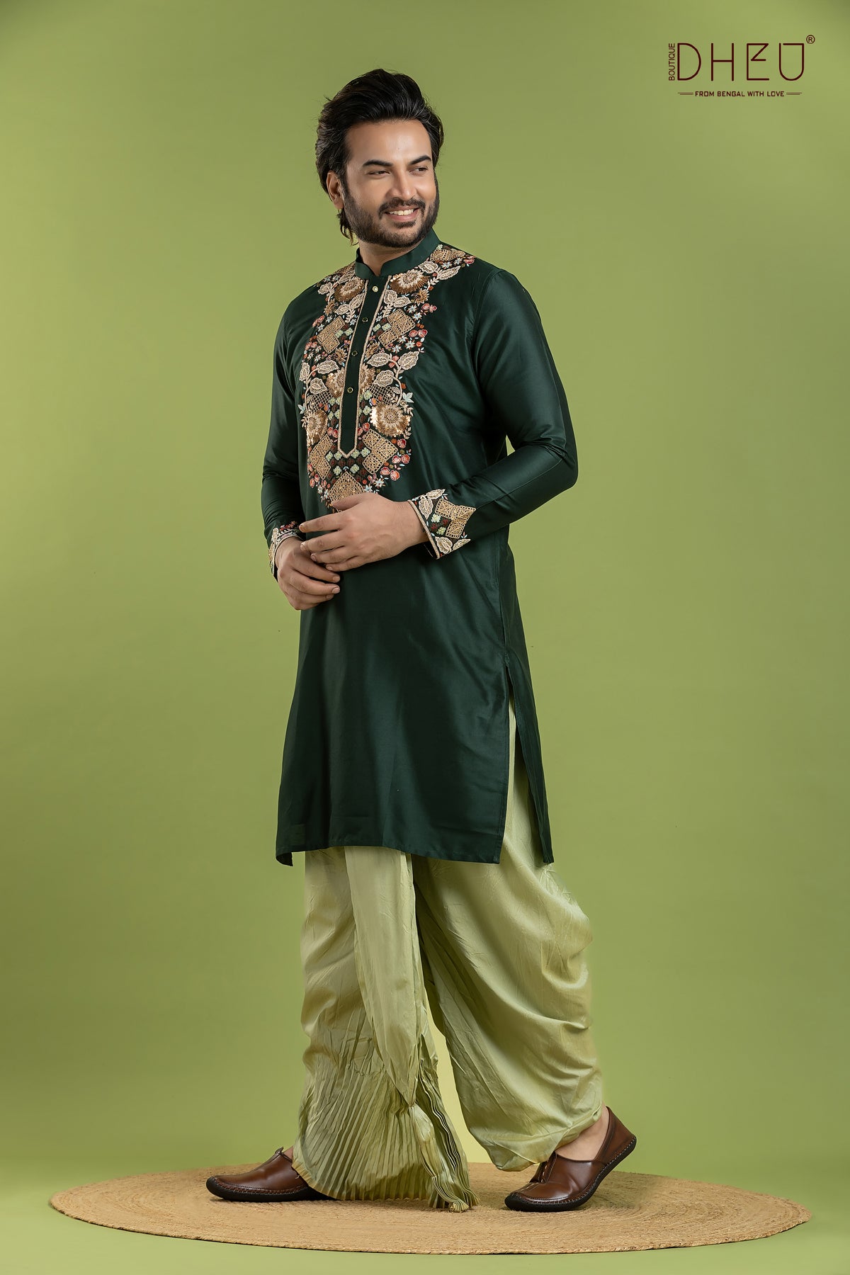 Elevate your festive wardrobe with Dheu's exquisite Designer Silk Kurta Dhoti set. Crafted from premium blended Katan silk, this sophisticated ensemble features intricate thread embroidered work in a stunning Bottle Green kurta paired with a Optional Olive Green raw silk dhoti. Perfect for weddings, celebrations, and special occasions, this set combines traditional craftsmanship with contemporary style. Dheu's Designer Kurta Dhoti Set – where tradition meets timeless elegance for the modern Indian man.