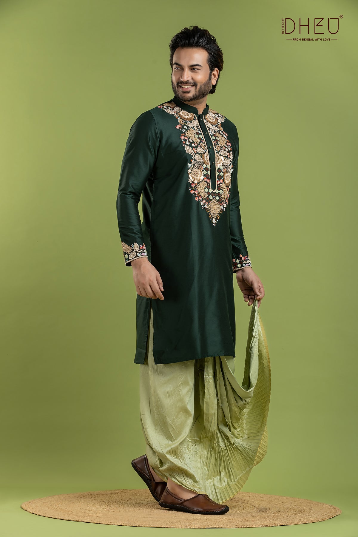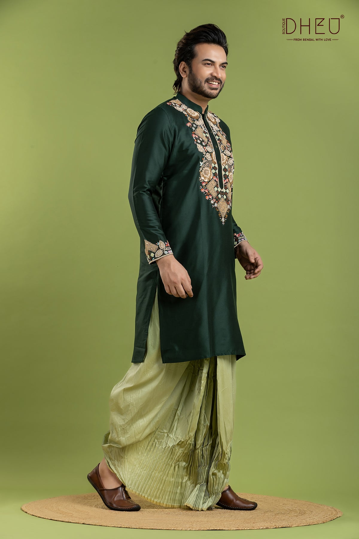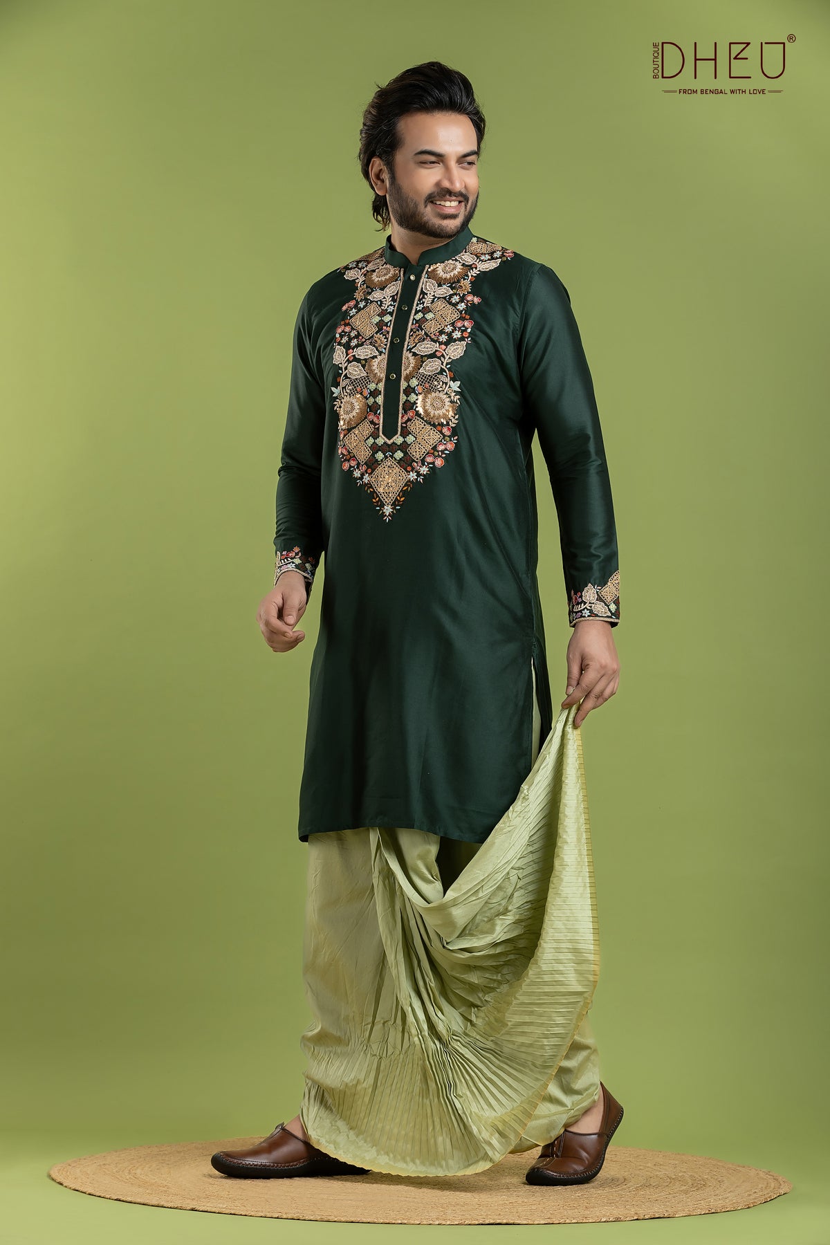Elevate your festive wardrobe with Dheu's exquisite Designer Silk Kurta Dhoti set. Crafted from premium blended Katan silk, this sophisticated ensemble features intricate thread embroidered work in a stunning Bottle Green kurta paired with a Optional Olive Green raw silk dhoti. Perfect for weddings, celebrations, and special occasions, this set combines traditional craftsmanship with contemporary style. Dheu's Designer Kurta Dhoti Set – where tradition meets timeless elegance for the modern Indian man.