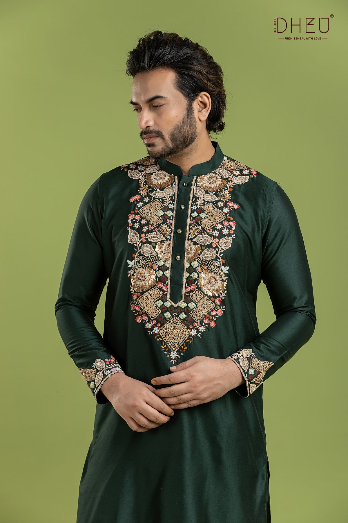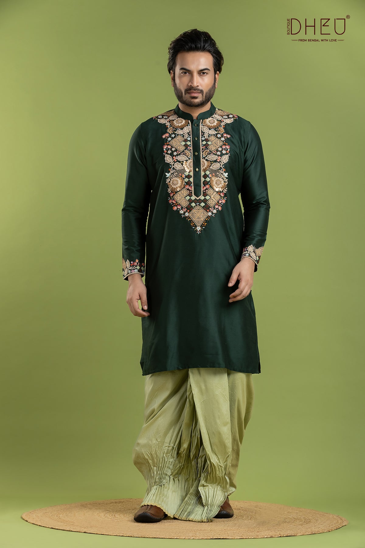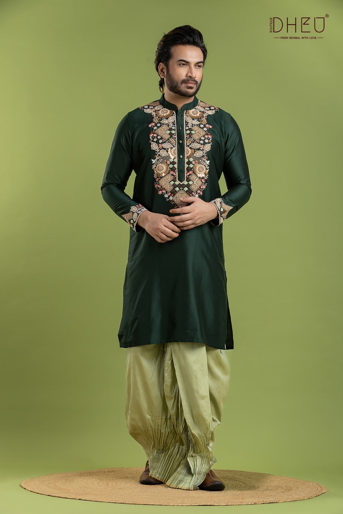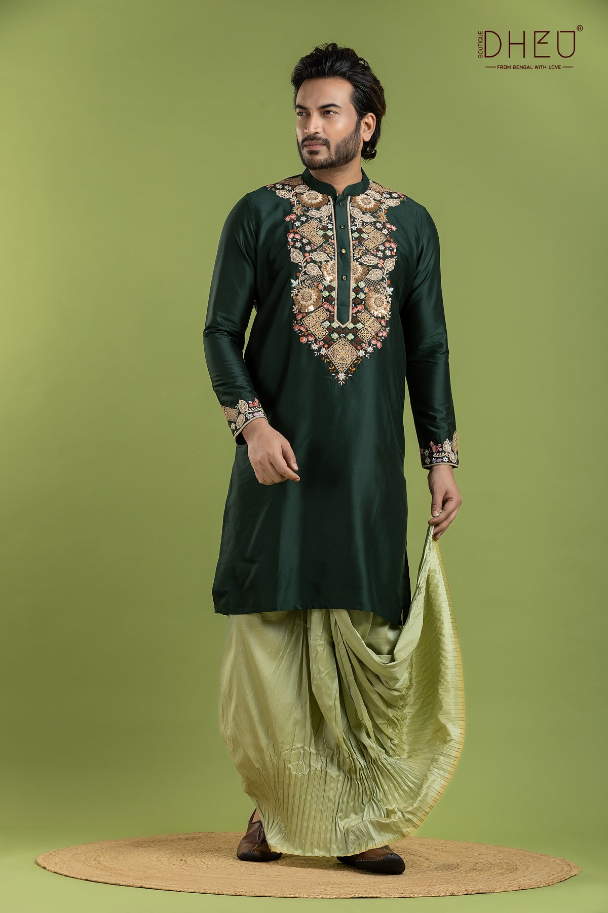 Elevate your festive wardrobe with Dheu's exquisite Designer Silk Kurta Dhoti set. Crafted from premium blended Katan silk, this sophisticated ensemble features intricate thread embroidered work in a stunning Bottle Green kurta paired with a Optional Olive Green raw silk dhoti. Perfect for weddings, celebrations, and special occasions, this set combines traditional craftsmanship with contemporary style. Dheu's Designer Kurta Dhoti Set – where tradition meets timeless elegance for the modern Indian man.