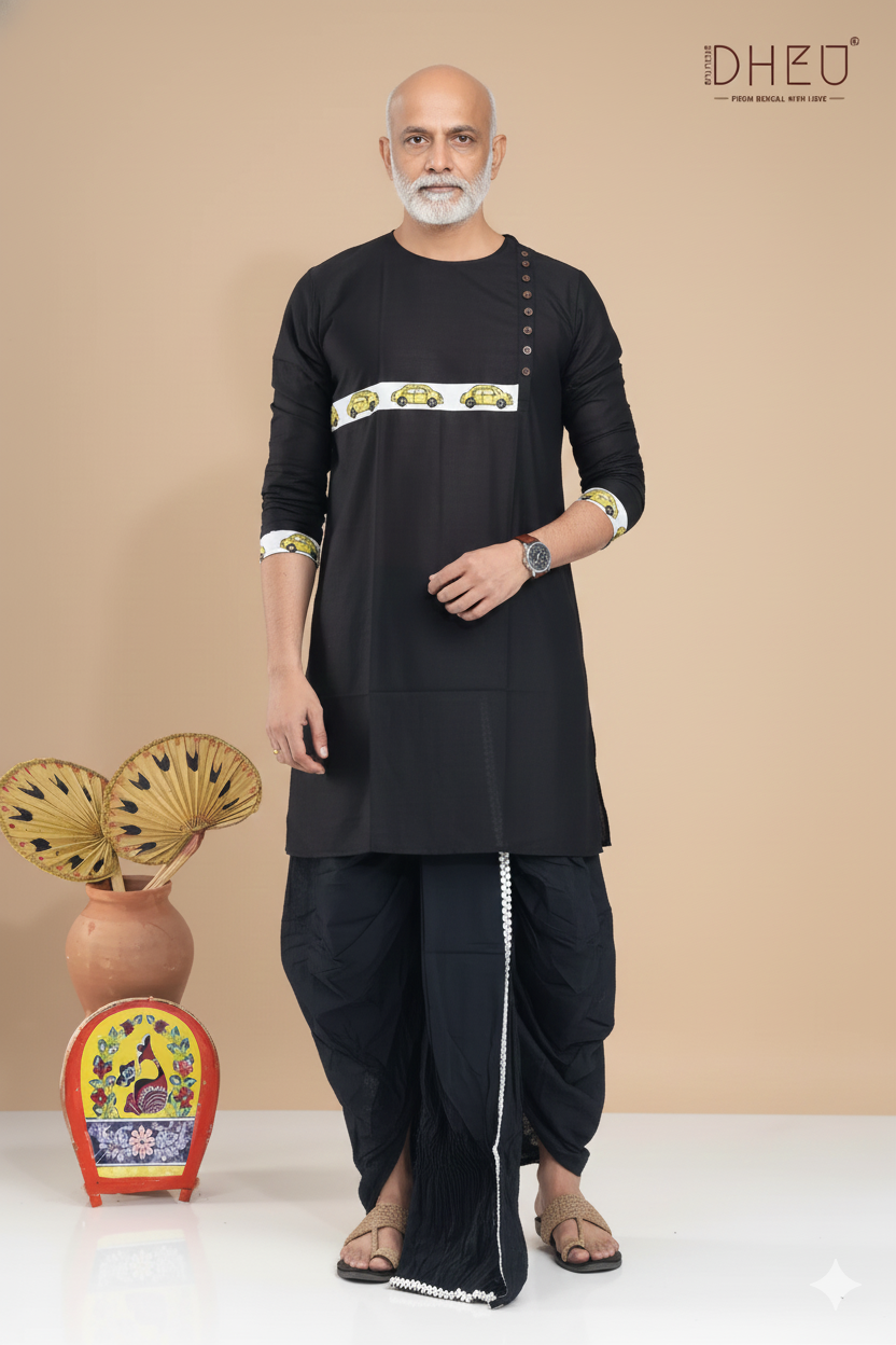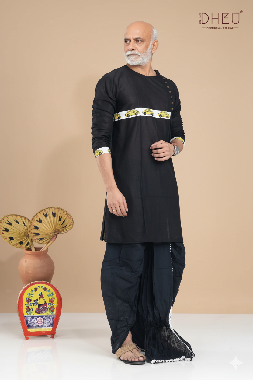 Slip into a Dheu Collections and look like a celebrity! This exclusive traditional bengali style dhoti kurta features unique design and comes in black cotton to make you stand out in the crowd. Live out your fashion dreams with this unique piece from our celebrity collections and be sure to make heads turn. COD and international shipping available!