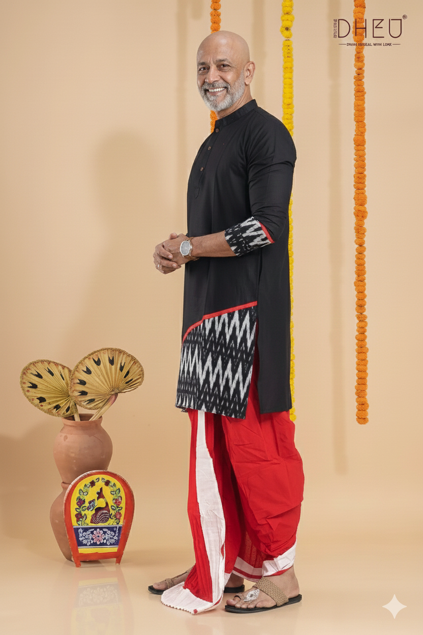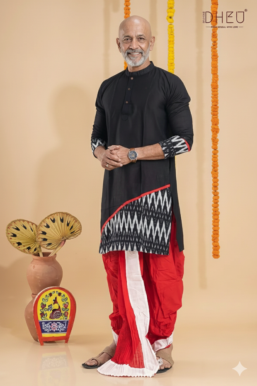 Looking for a unique and traditional outfit? Dheu.in exclusive celebrity collections feature this stunning black and Red dhoti kurta. Its unique Bengali style and perfect for a regal look. Made from handloom pure cotton, we guarantee your comfort. Shop now and get COD & international shipping option.
