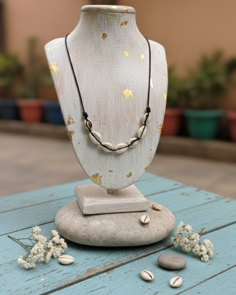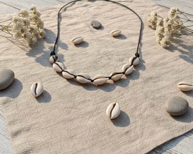 Elevate your everyday style with this timeless Cowrie shell necklace. Featuring a curated row of polished, natural white shells, this piece is meticulously hand-strung on a durable, minimalist black adjustable cord. Whether you're aiming for a relaxed beach vibe or adding a touch of ethno-bohemian charm to a formal outfit.