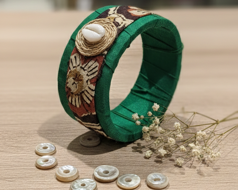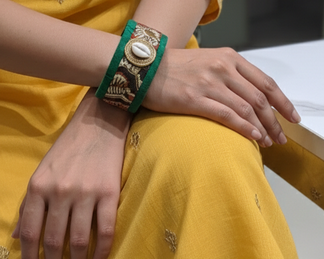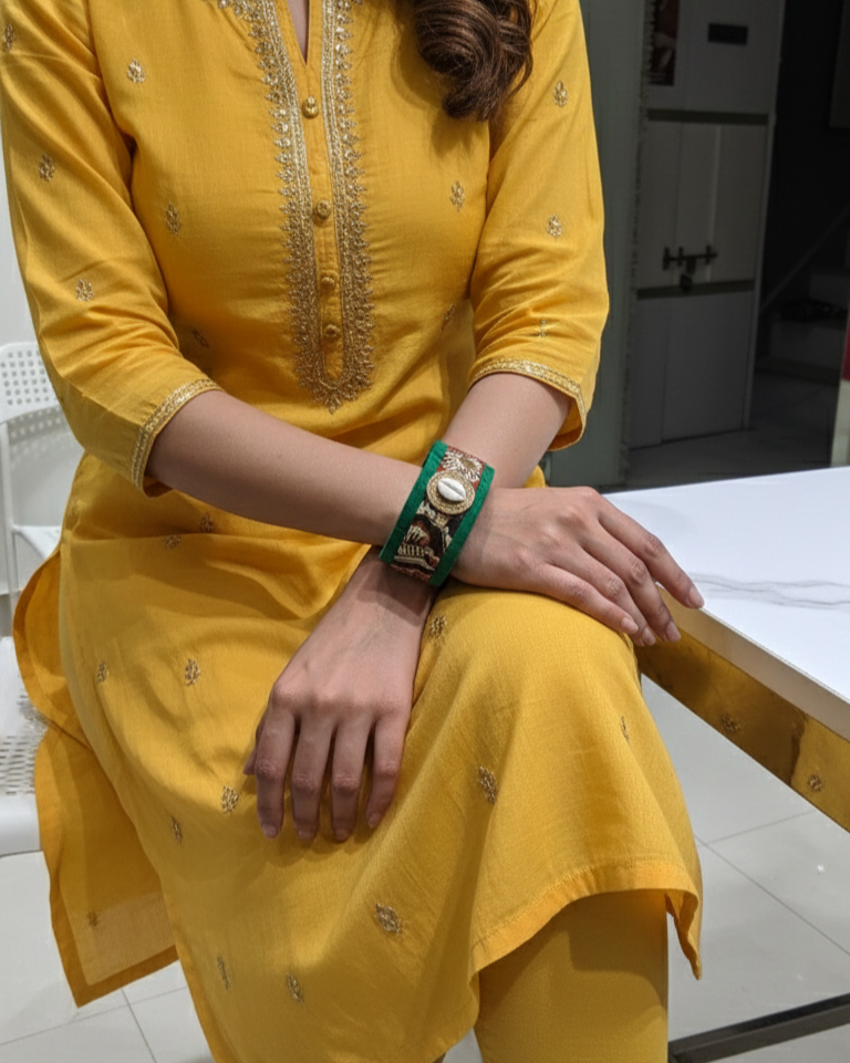 This handmade Bangle features a finely crafted , showcasing intricate artistry. Designed with attention to detail, it offers a unique blend of traditional symbolism and elegant style, making it an exceptional choice for those seeking authentic and meaningful jewelry. Perfect to complement ethnic attire or as a distinctive statement piece.