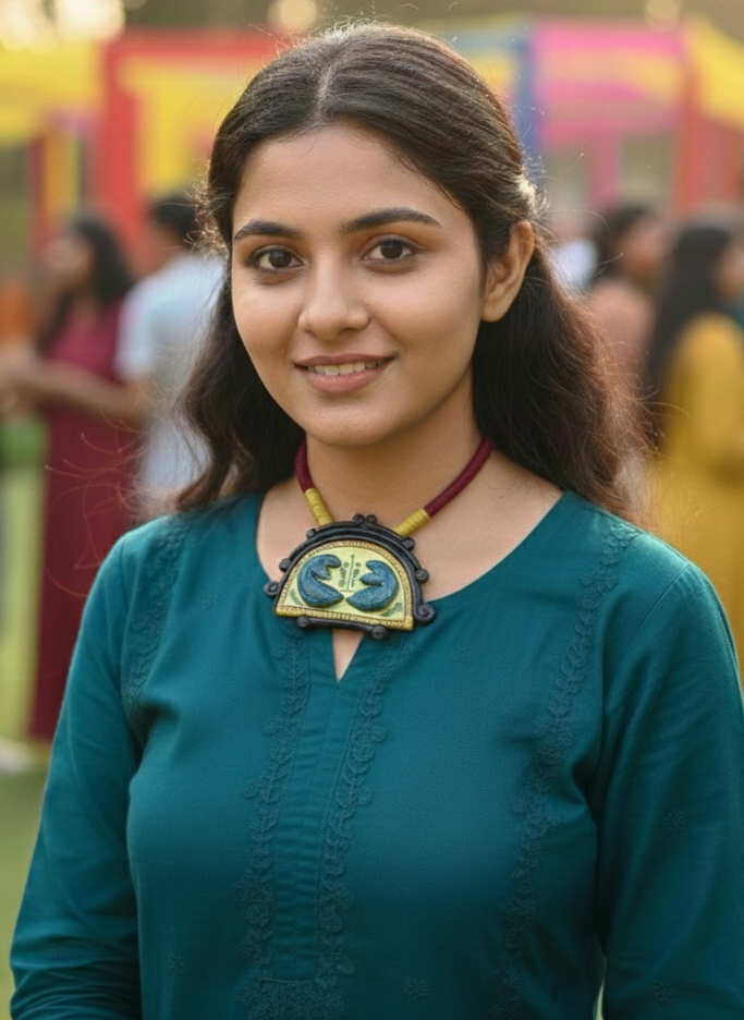 This handmade necklace features a finely crafted Maa Durga face pendant paired with matching ear studs, showcasing intricate artistry. Designed with attention to detail, it offers a unique blend of traditional symbolism and elegant style, making it an exceptional choice for those seeking authentic and meaningful jewelry. Perfect to complement ethnic attire or as a distinctive statement piece.