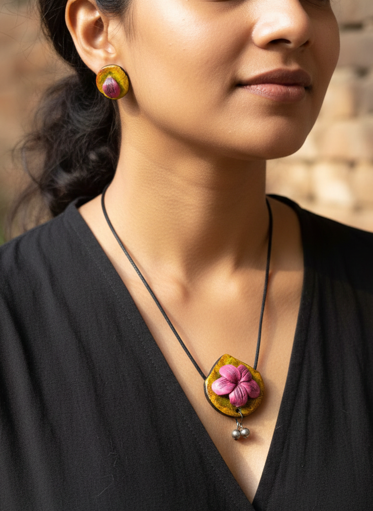 This handmade necklace features a finely crafted Maa Durga Puja Special pendant paired with matching ear studs, showcasing intricate artistry. Designed with attention to detail, it offers a unique blend of traditional symbolism and elegant style, making it an exceptional choice for those seeking authentic and meaningful jewelry. Perfect to complement ethnic attire or as a distinctive statement piece.