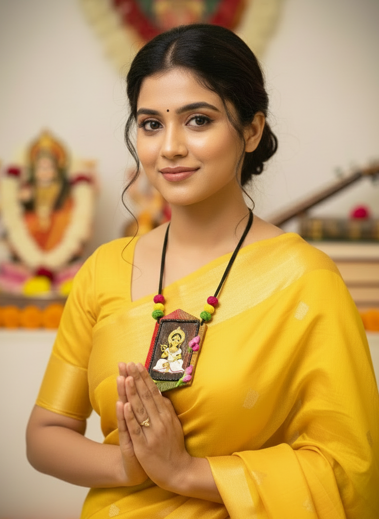 This handmade necklace features a finely crafted Maa Durga Puja Special pendant paired with matching ear studs, showcasing intricate artistry. Designed with attention to detail, it offers a unique blend of traditional symbolism and elegant style, making it an exceptional choice for those seeking authentic and meaningful jewelry. Perfect to complement ethnic attire or as a distinctive statement piece.