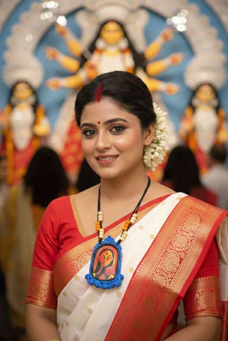 This handmade necklace features a finely crafted Maa Durga Puja Special pendant paired with matching ear studs, showcasing intricate artistry. Designed with attention to detail, it offers a unique blend of traditional symbolism and elegant style, making it an exceptional choice for those seeking authentic and meaningful jewelry. Perfect to complement ethnic attire or as a distinctive statement piece.