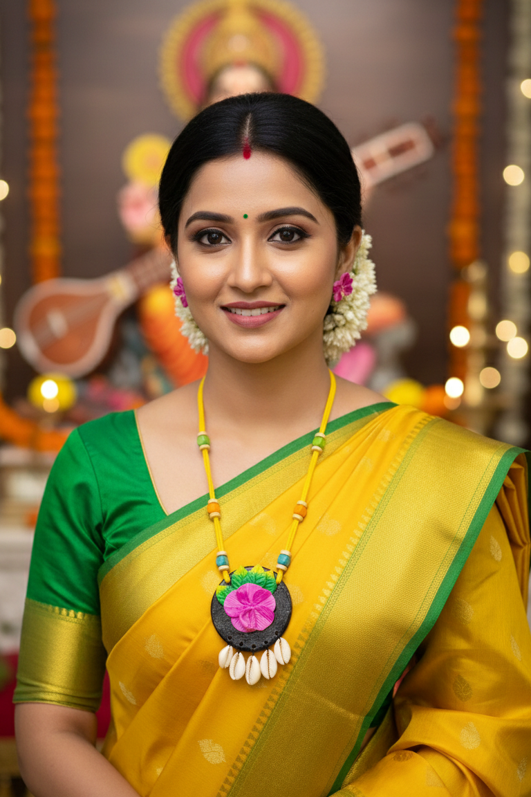 This handmade necklace features a finely crafted Maa Durga Puja Special pendant paired with matching ear studs, showcasing intricate artistry. Designed with attention to detail, it offers a unique blend of traditional symbolism and elegant style, making it an exceptional choice for those seeking authentic and meaningful jewelry. Perfect to complement ethnic attire or as a distinctive statement piece.