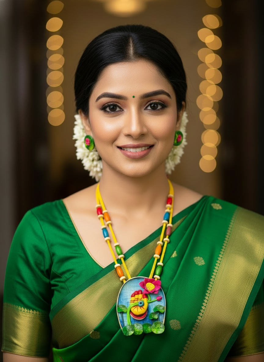 This handmade necklace features a finely crafted Maa Durga Puja Special pendant paired with matching ear studs, showcasing intricate artistry. Designed with attention to detail, it offers a unique blend of traditional symbolism and elegant style, making it an exceptional choice for those seeking authentic and meaningful jewelry. Perfect to complement ethnic attire or as a distinctive statement piece.