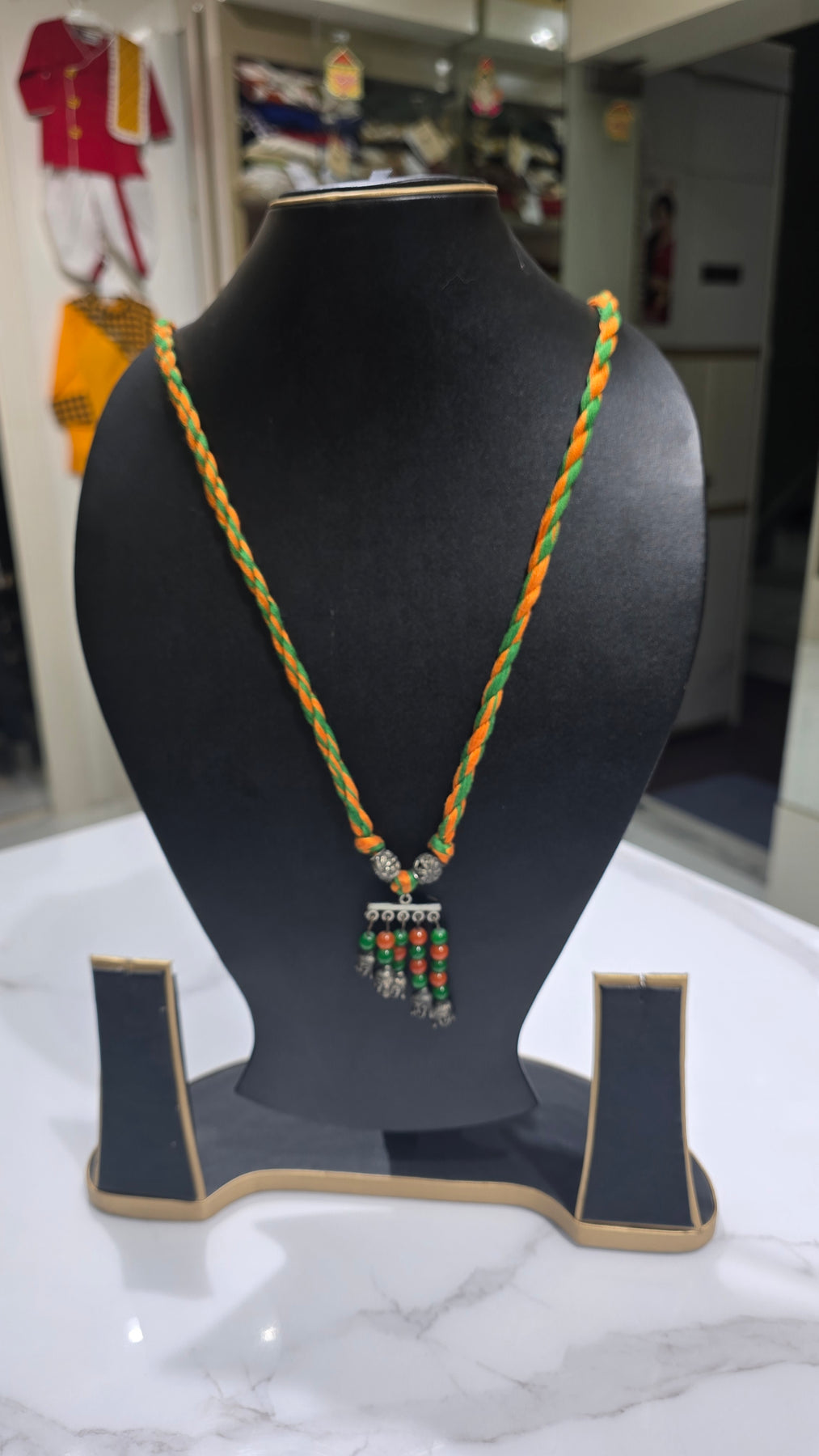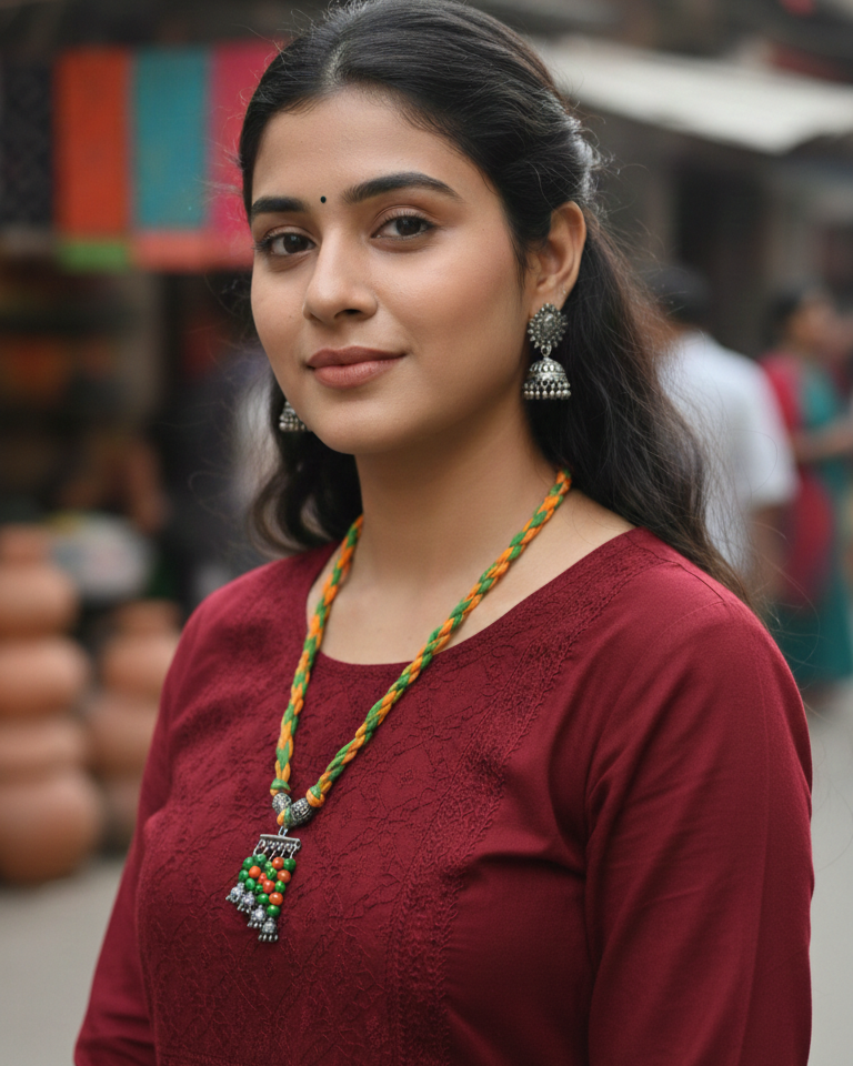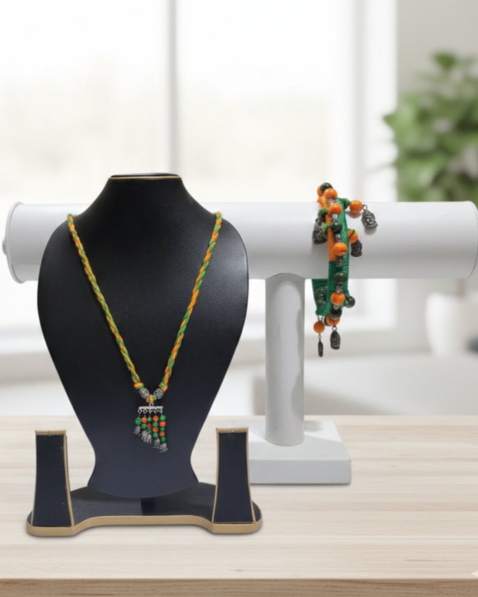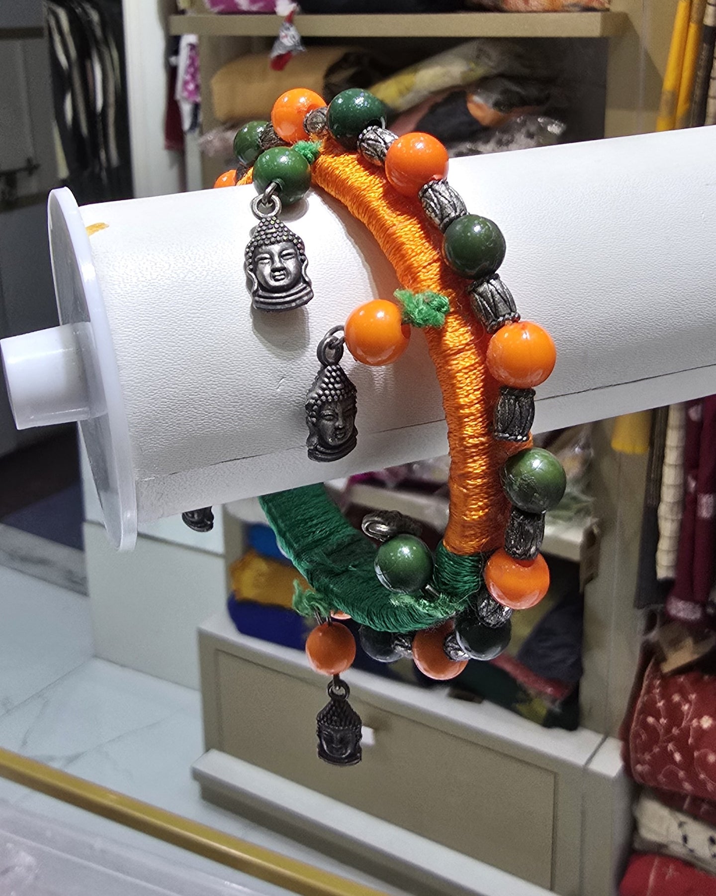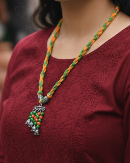 This vibrant neckpiece is a celebration of traditional craftsmanship and contemporary style. Perfect for those who love boho-chic or tribal-inspired accessories, this necklace adds a pop of color to any ethnic or fusion outfit. Make a spiritual and stylish statement with this unique handcrafted bangle. Combining the earthy feel of thread work with the serene symbolism of the Buddha, this piece is a standout accessory for your handmade jewelry collection