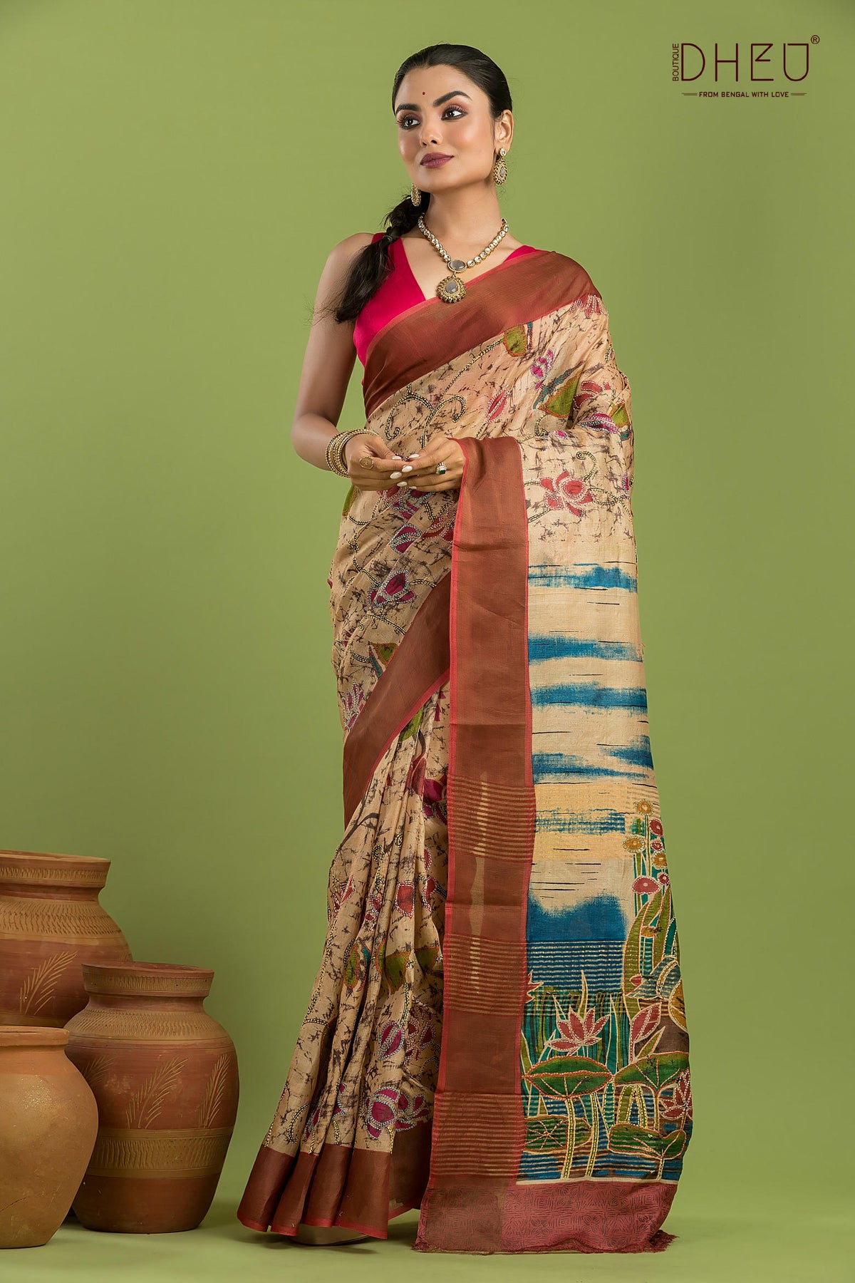 Pure Tussar Silk Kantha Stitch Saree (Silk Mark Certified)