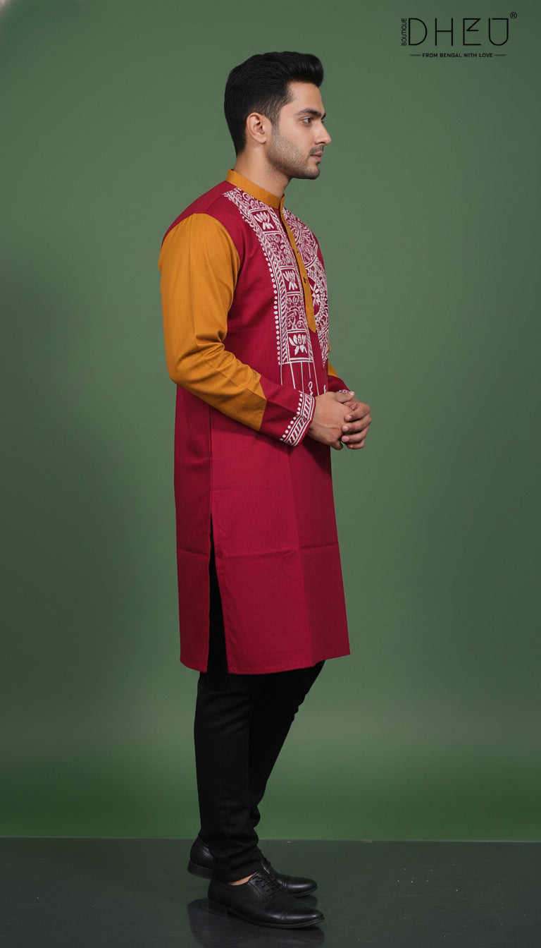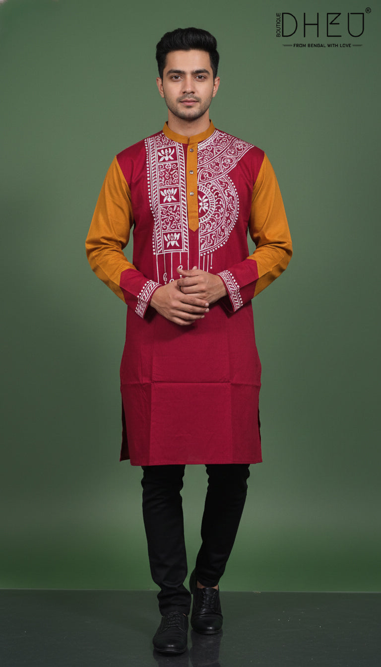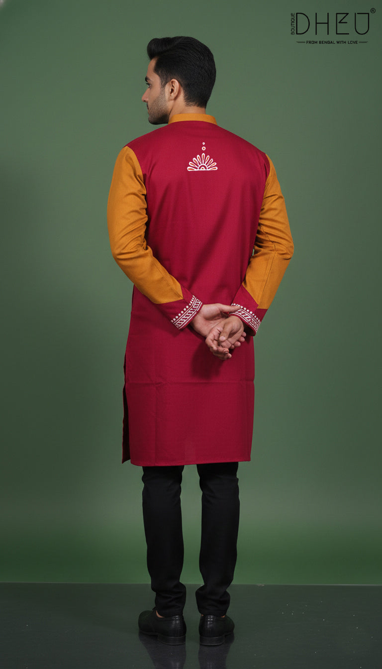 Elevate your ethnic wardrobe with this striking Maroon and yellow Kurta from Dheu. Perfectly blending heritage Bengali aesthetics with contemporary design, this piece is crafted for the modern man who appreciates traditional craftsmanship.