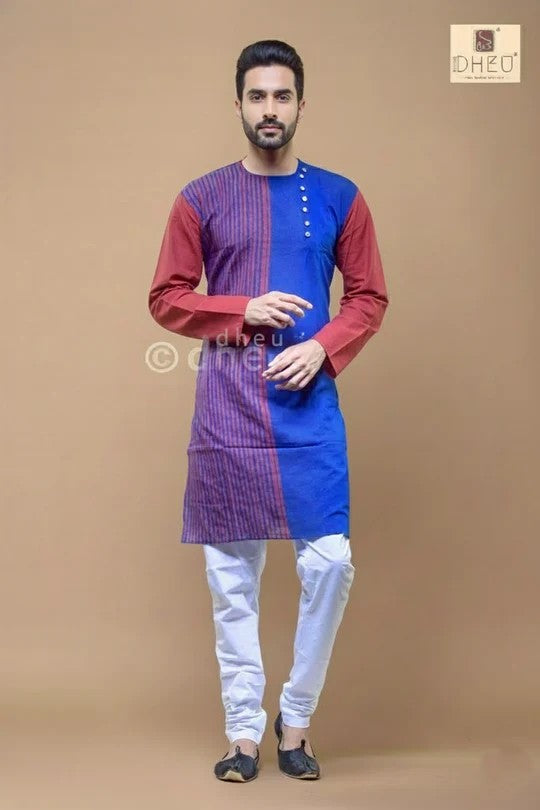 - Handwoven Maroon-Blue pure cotton Kurta for Men