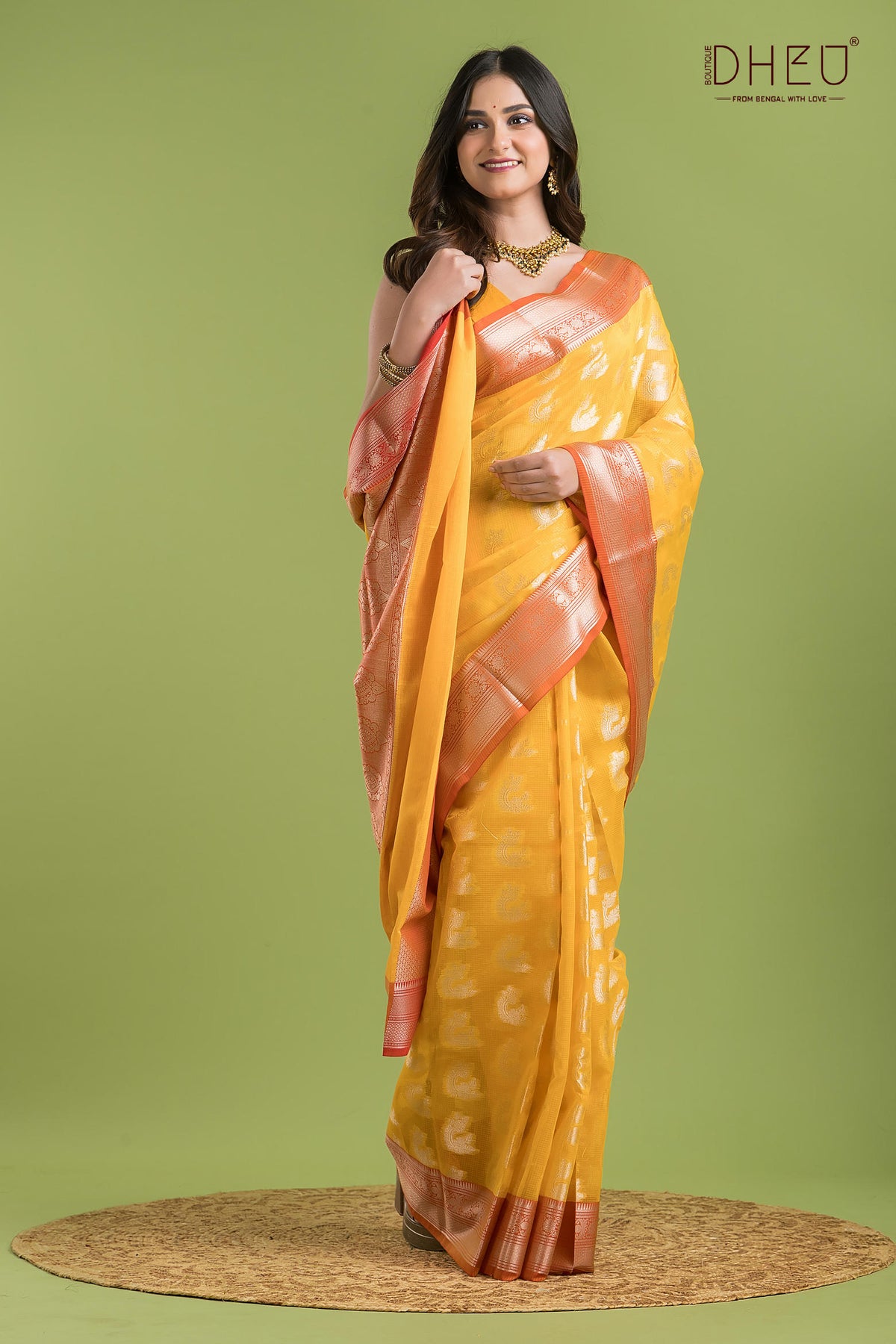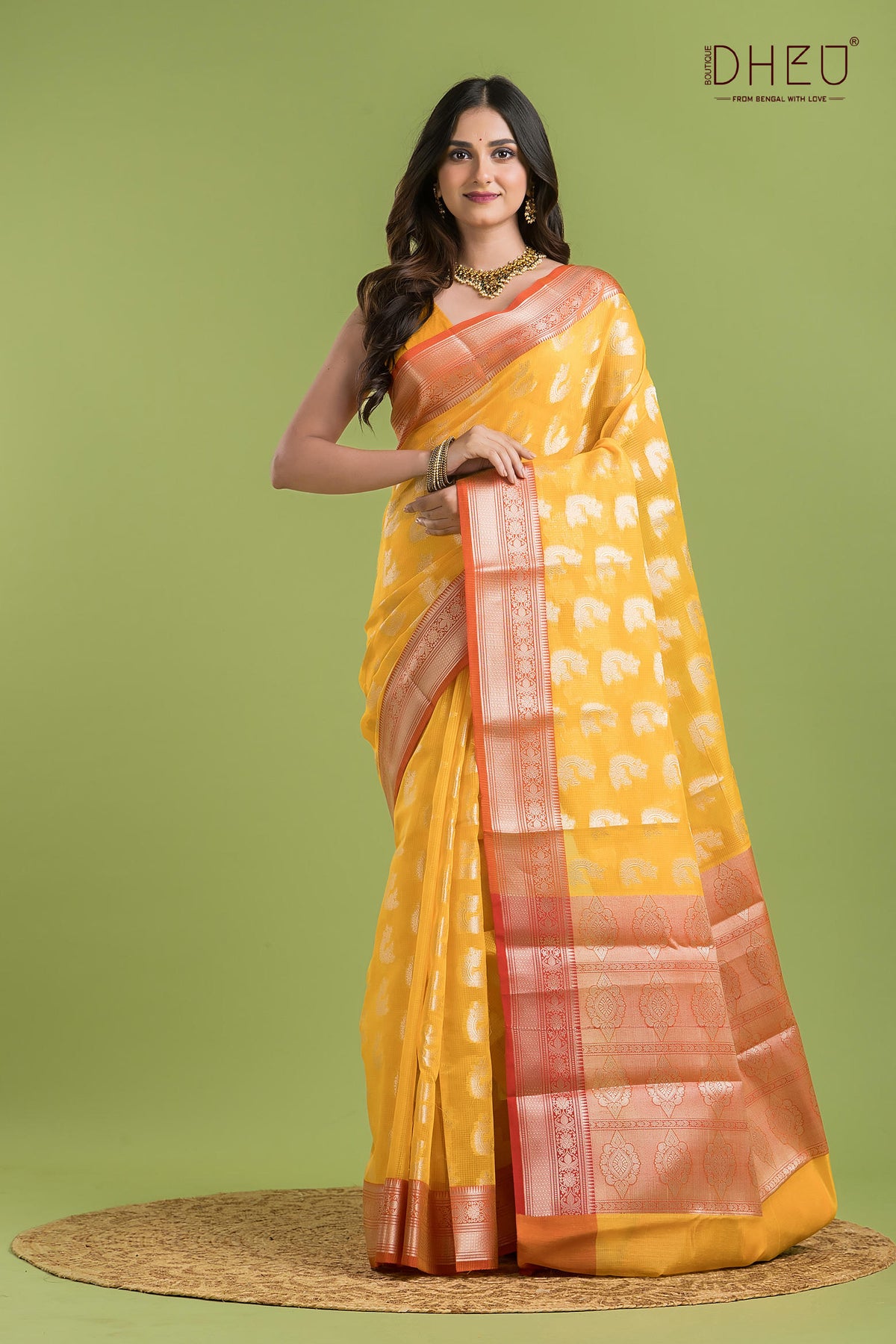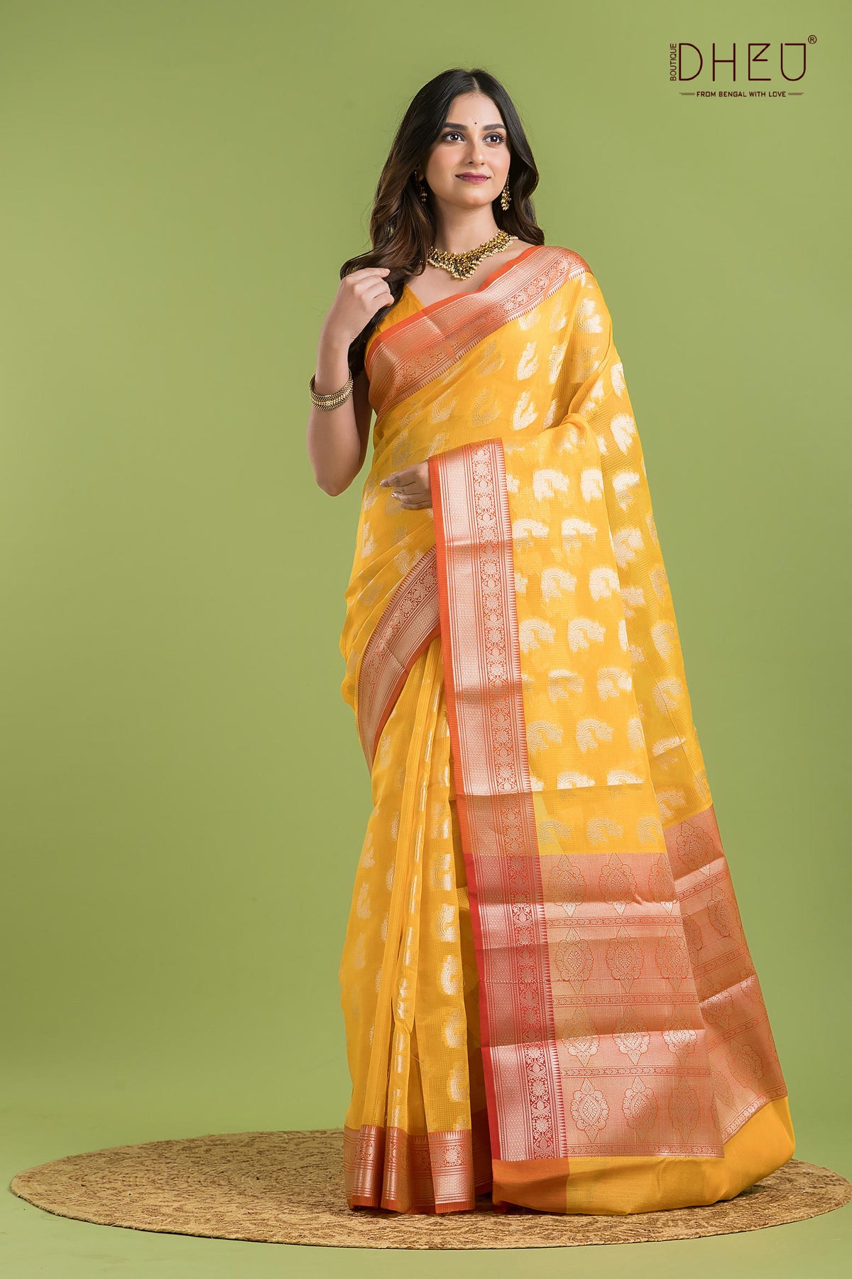 Our Handloom Maheshwari Silk Saree is a testament to 18th-century royal elegance. The lightweight, breathable nature of the fabric makes it the perfect "all-day" saree these sarees are celebrated for their unique Silk-Cotton blend, offering the luxurious sheen of silk with the airy comfort of cotton.