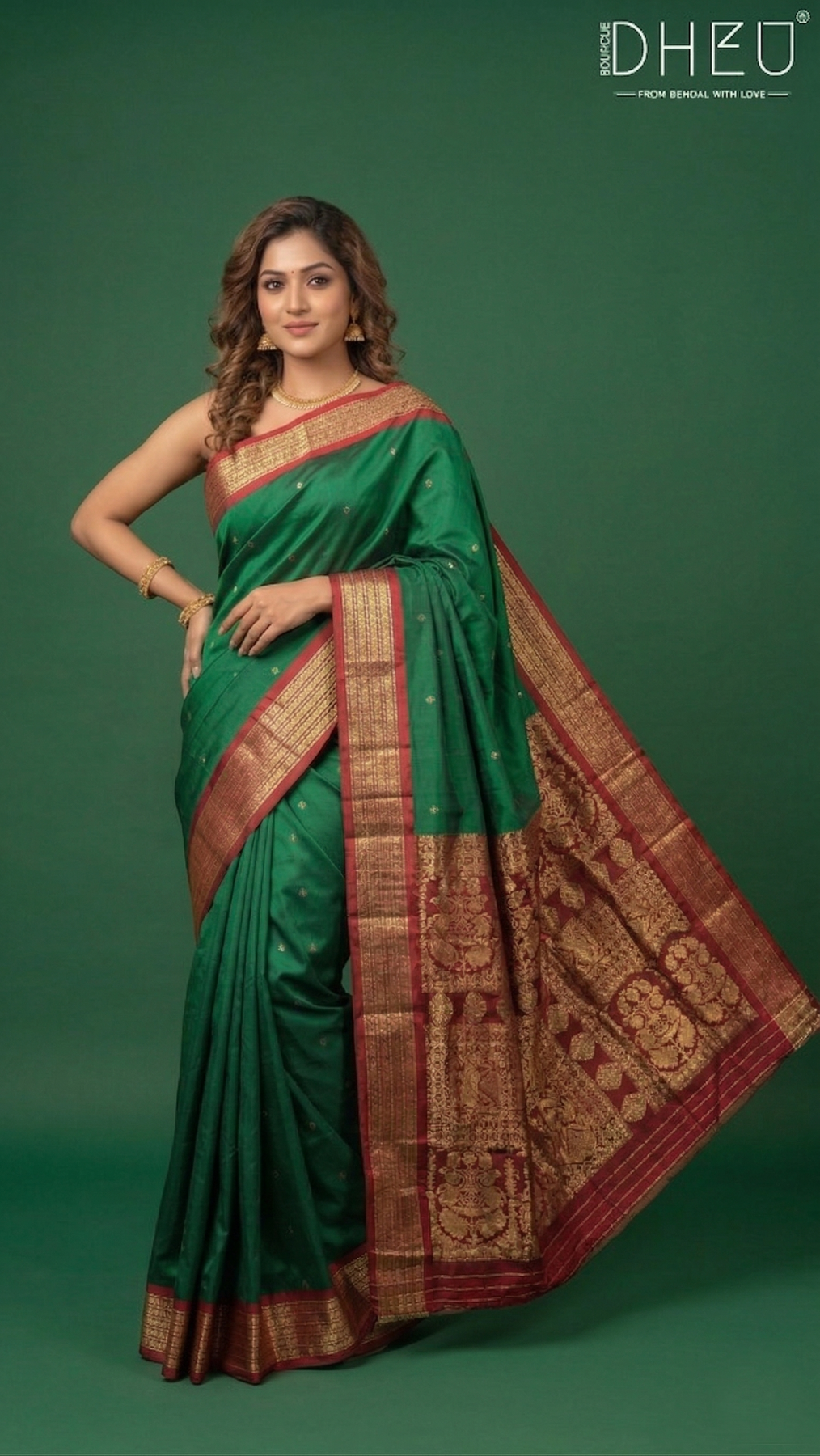 Design Elements: * Body: Features delicate gold butta (tiny floral/geometric motifs) scattered across the rich green silk.