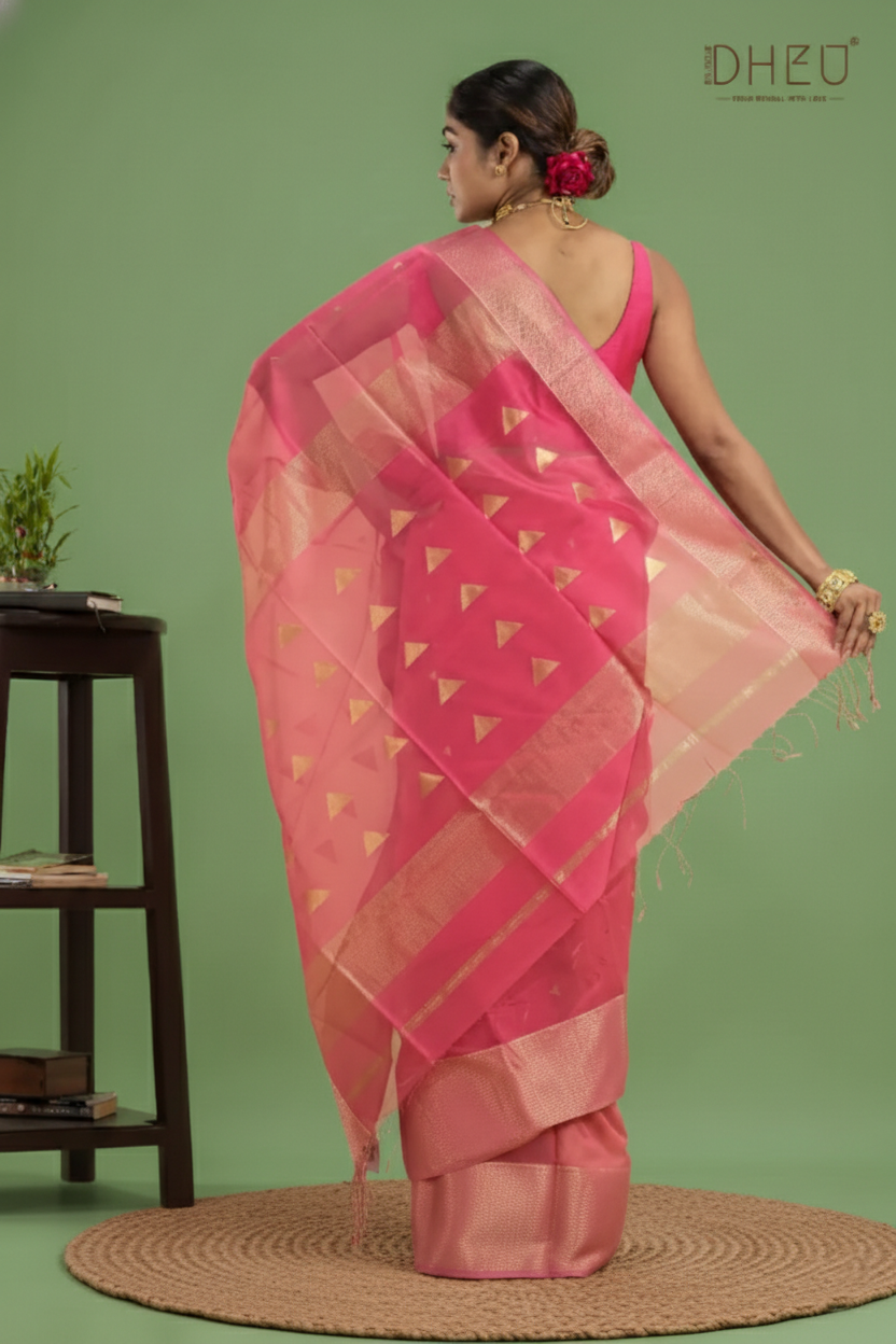 This saree has been designed in a Maheswari Silk, crafted with precision by highly experienced weavers. Its intricate handwork and beautiful motifs make this a saree that is both exclusive and stylish. Dheu Exclusive is the perfect choice for weddings and other special occasions.