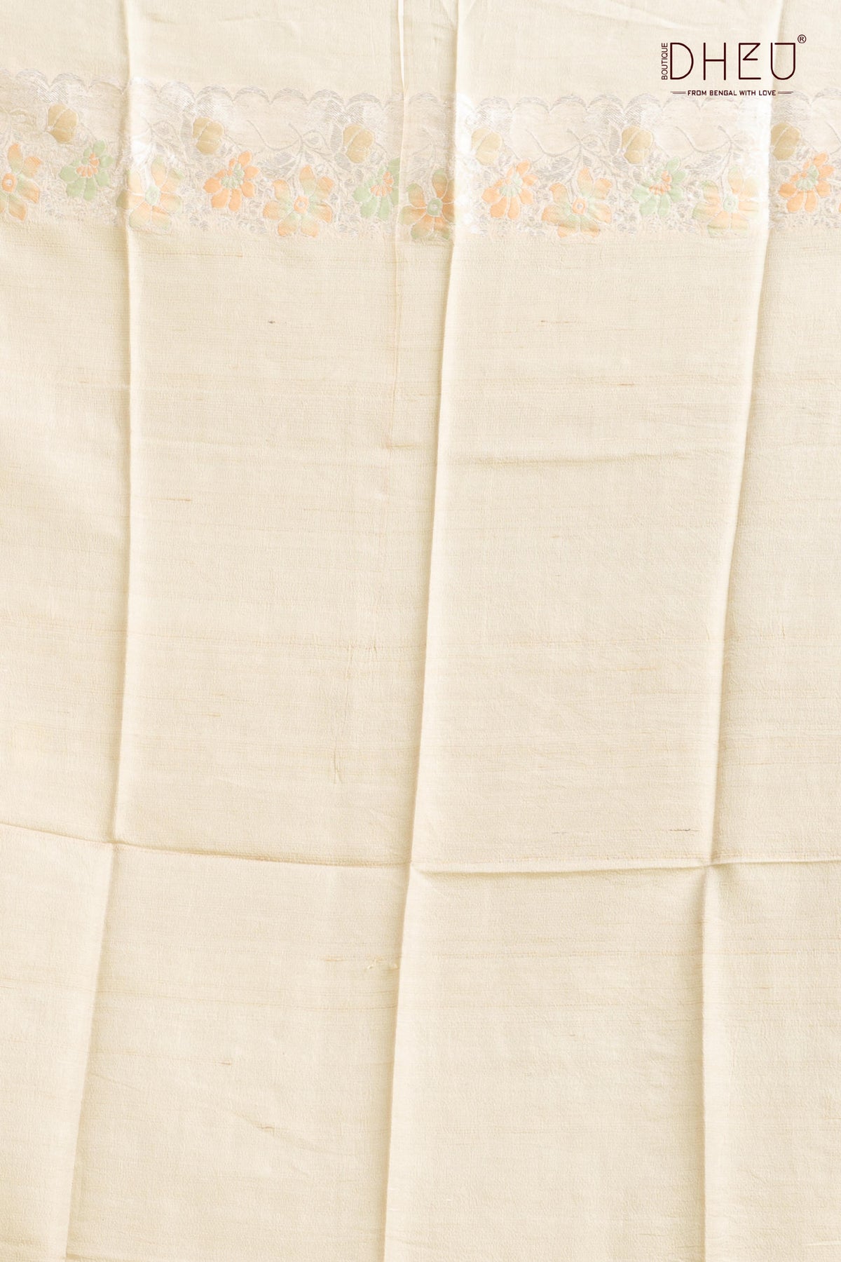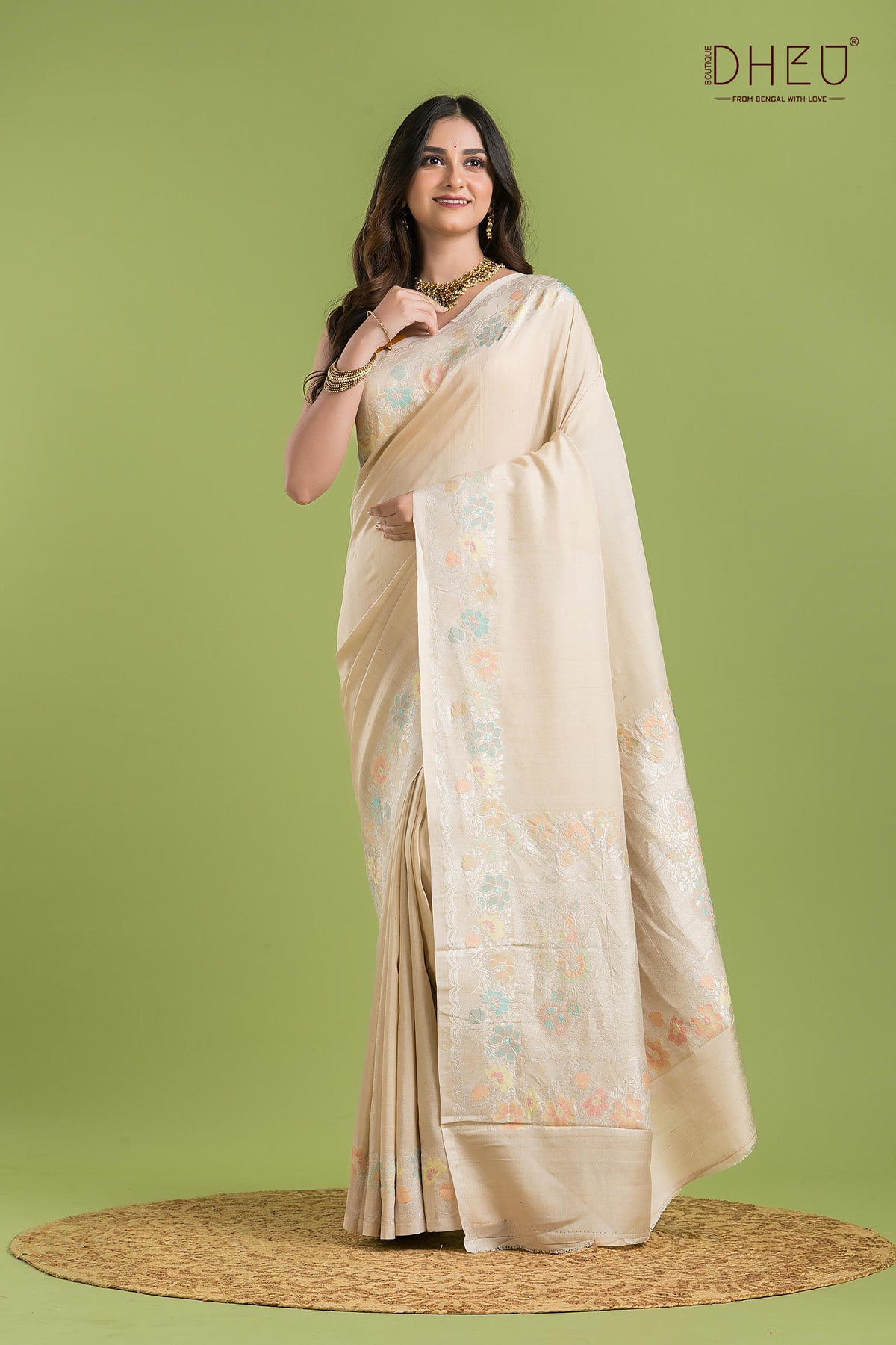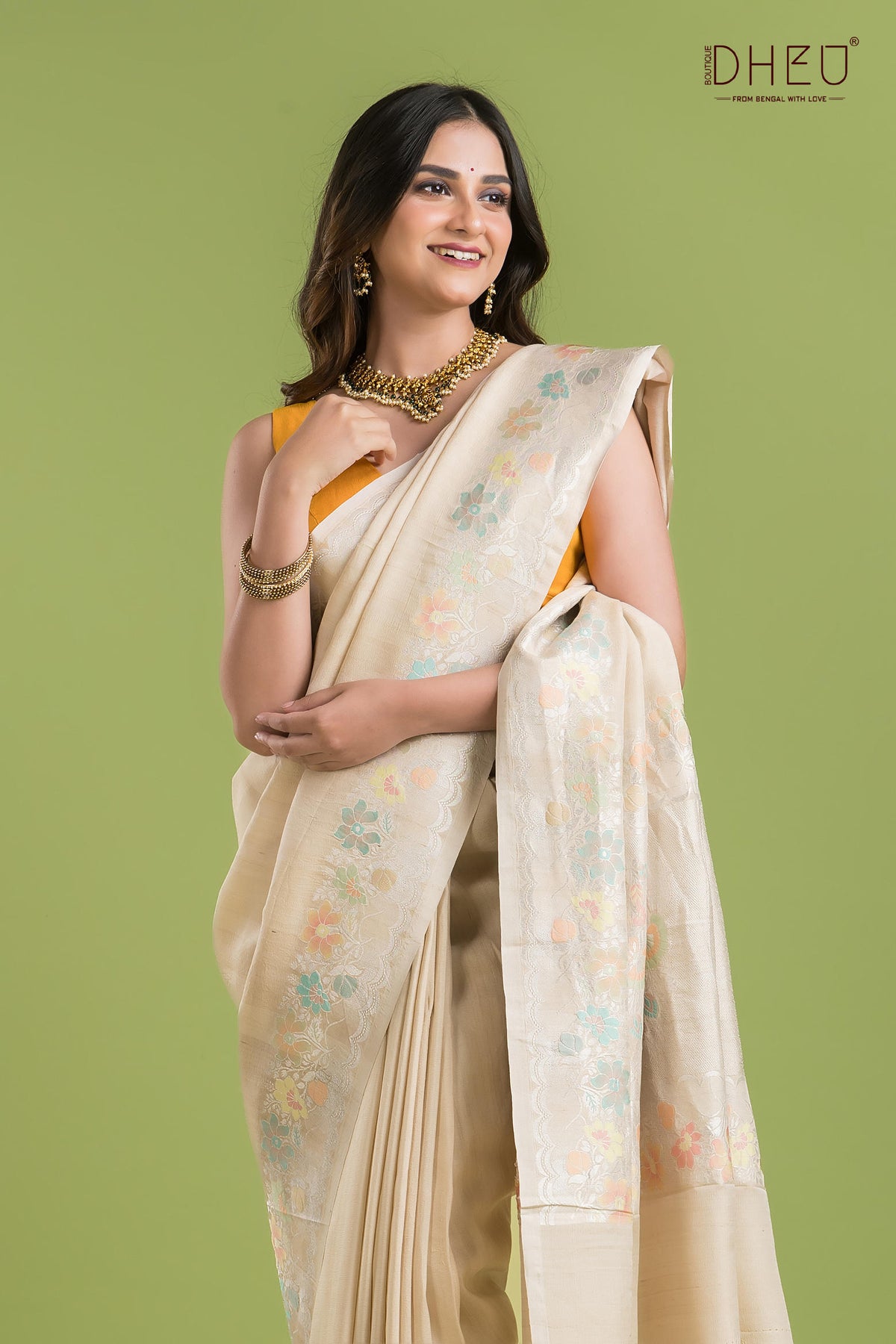 Discover the understated luxury of this Pure Tussar Silk Saree, crafted from 100% natural Tussar (Kosa) silk. Known for its rich texture, natural golden hue, and subtle sheen,  This saree features a soft yet slightly coarse texture that gives it a distinctive character, making each piece unique. Traditional motifs, artistic weaves, and refined borders highlight the beauty of this heritage fabric, while its breathable nature ensures all-day comfort. Lightweight and graceful, it drapes beautifully, making it ideal for both daytime and evening wear.