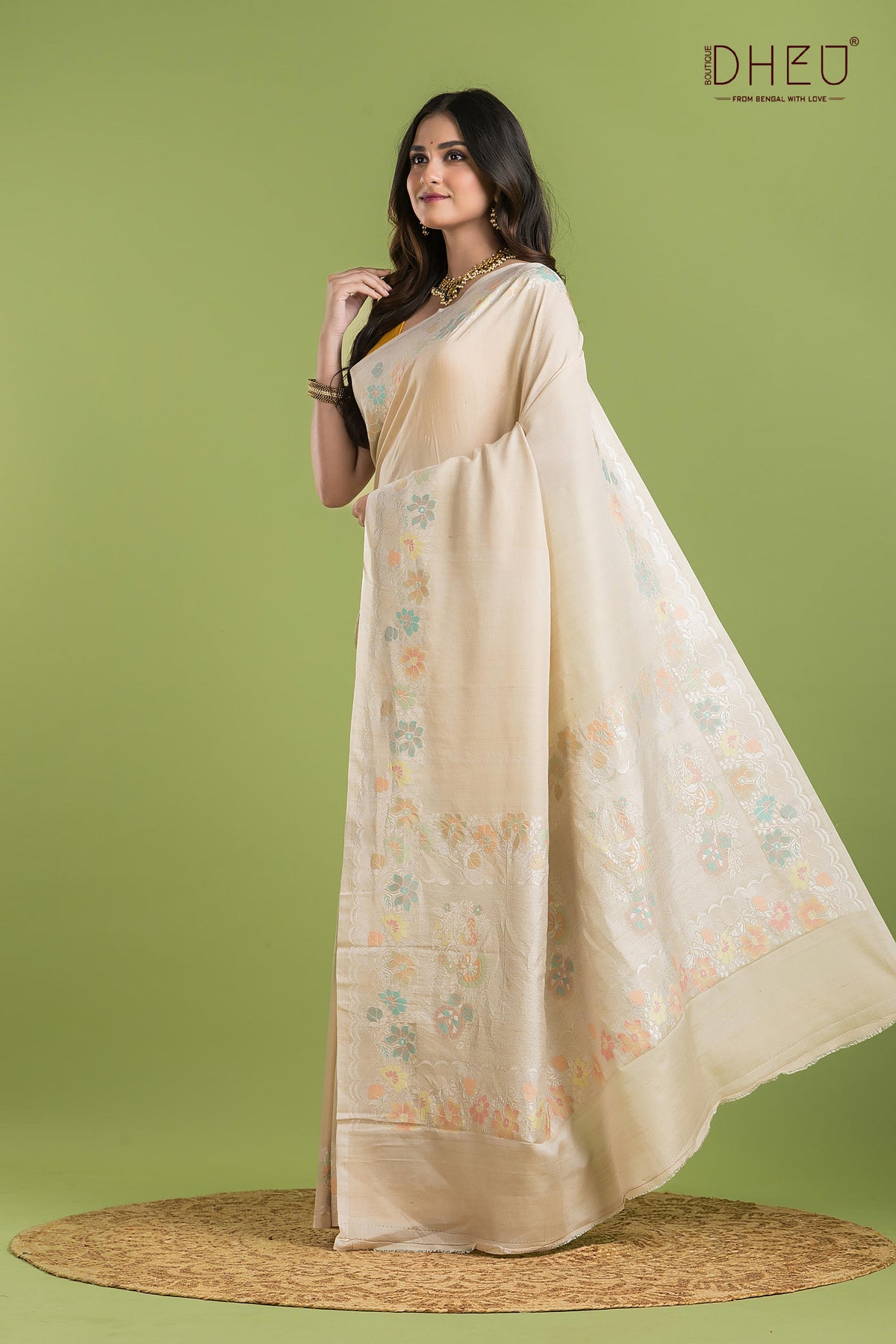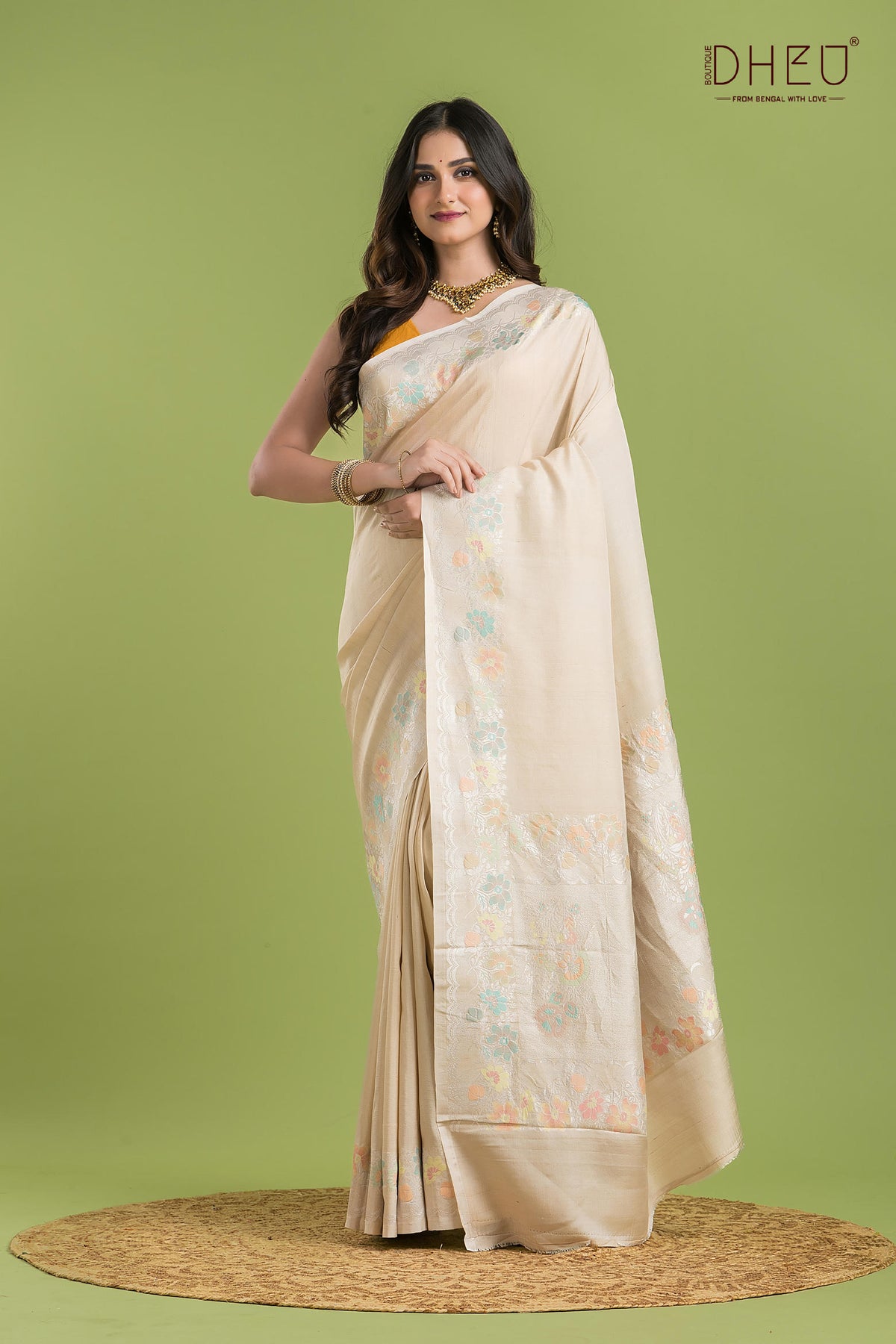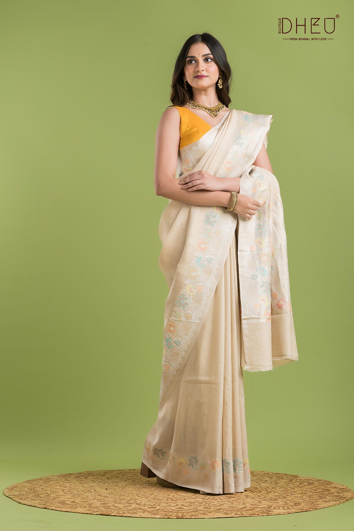 Discover the understated luxury of this Pure Tussar Silk Saree, crafted from 100% natural Tussar (Kosa) silk. Known for its rich texture, natural golden hue, and subtle sheen,  This saree features a soft yet slightly coarse texture that gives it a distinctive character, making each piece unique. Traditional motifs, artistic weaves, and refined borders highlight the beauty of this heritage fabric, while its breathable nature ensures all-day comfort. Lightweight and graceful, it drapes beautifully, making it ideal for both daytime and evening wear.