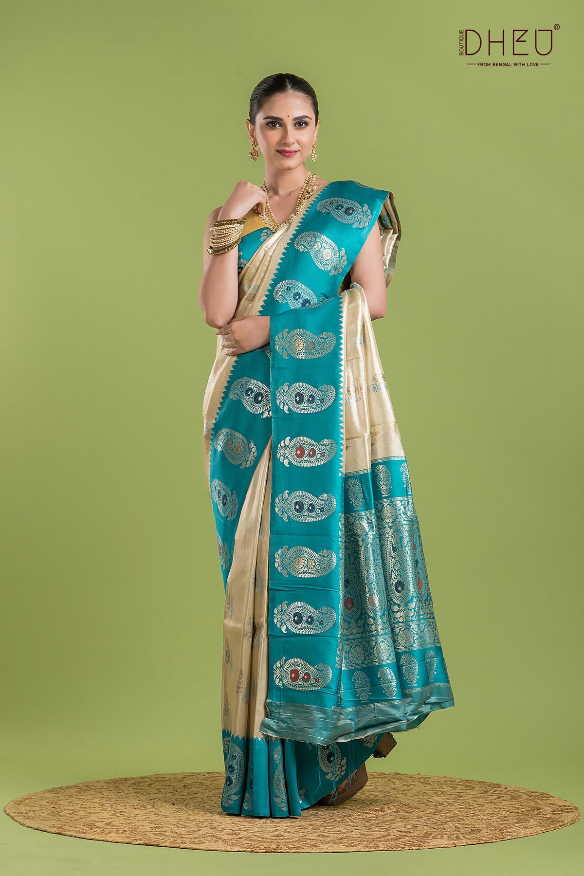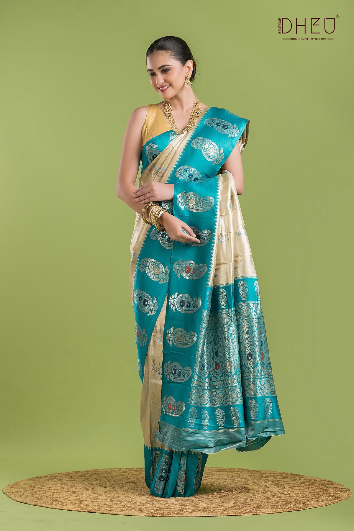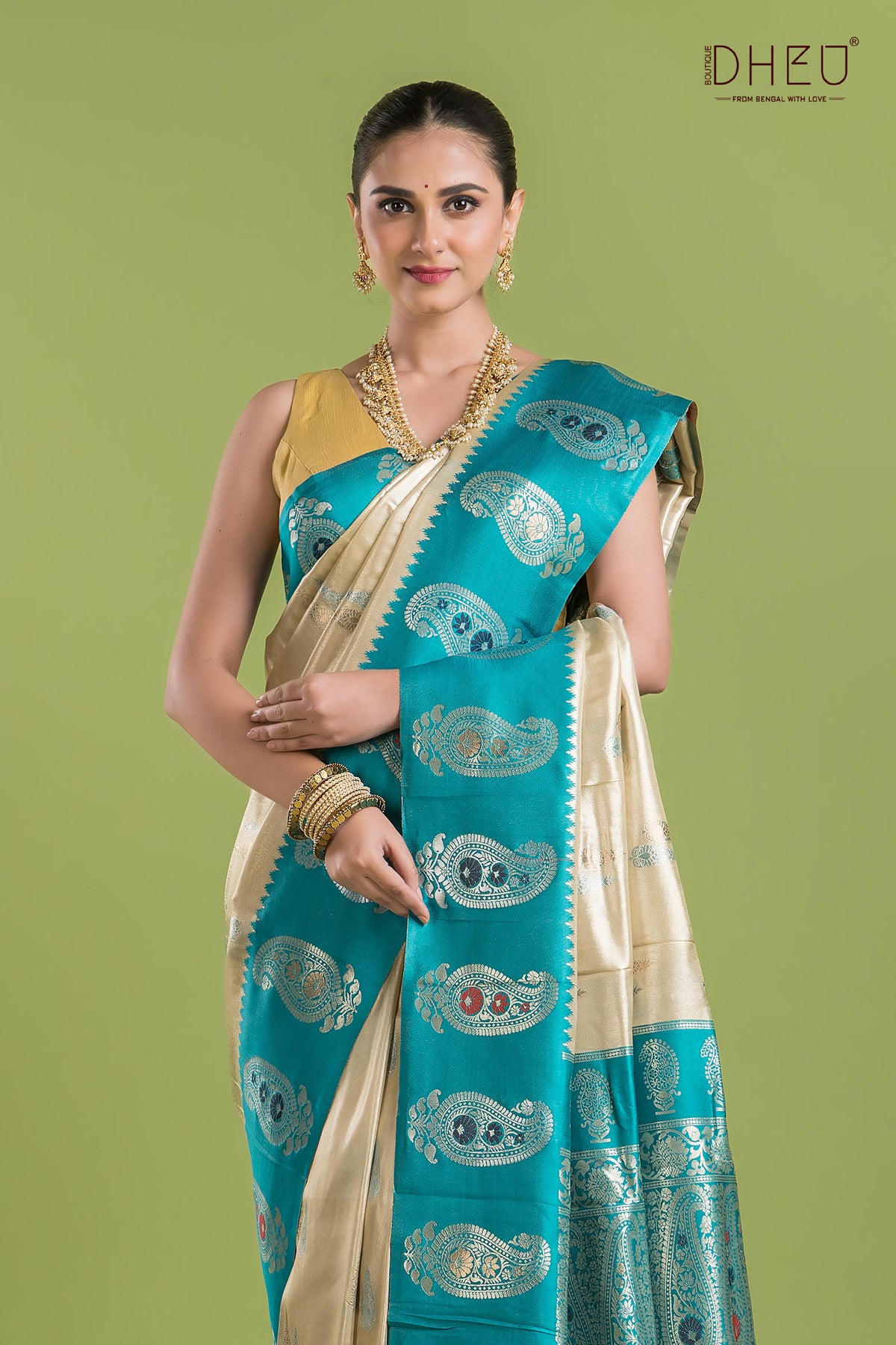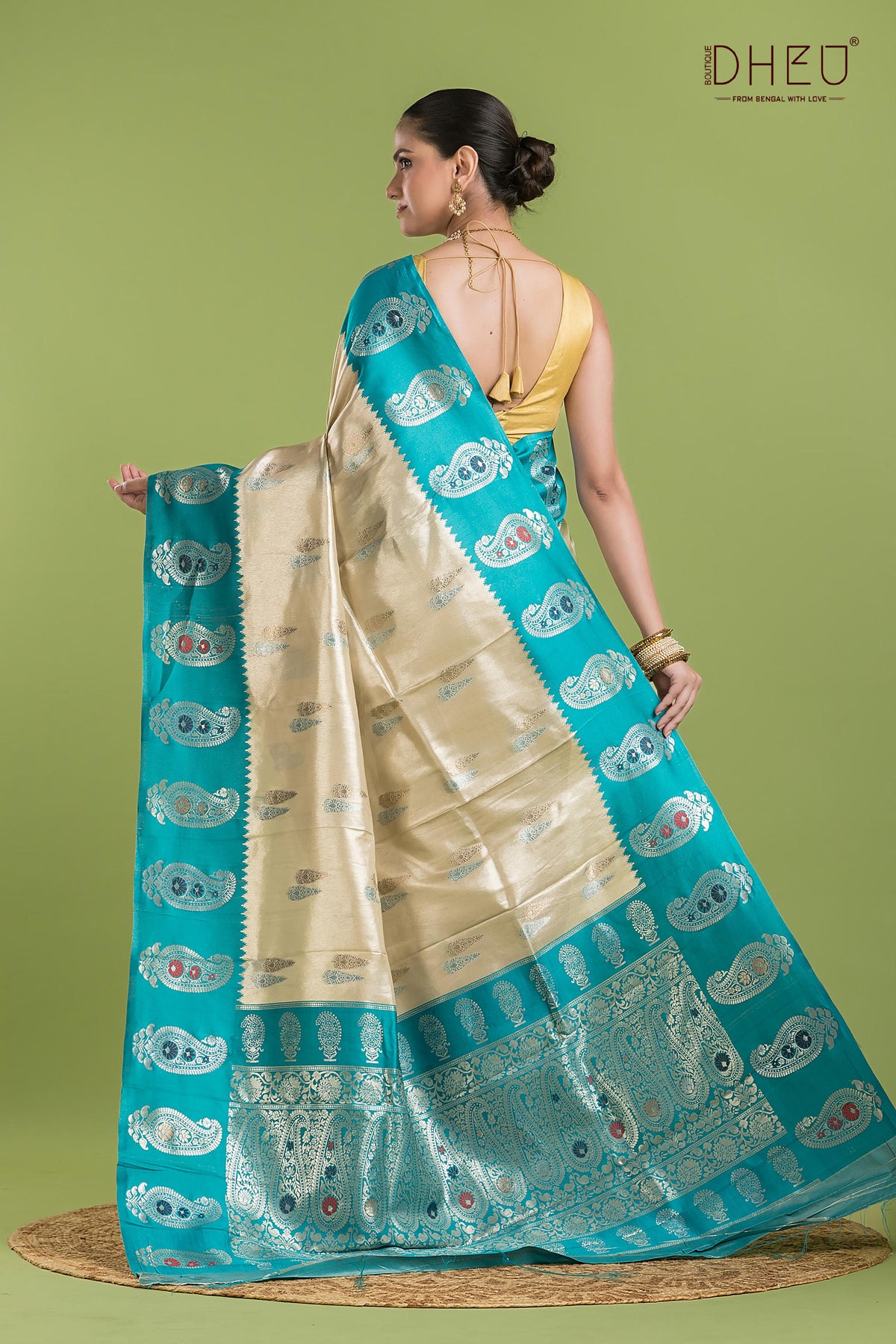 Experience the timeless splendor of traditional handloom with this exquisite Tissue Paithani Saree, a graceful fusion of sheer tissue silk and classic Paithani craftsmanship from Maharashtra. Renowned for its luminous texture, lightweight feel, and rich zari work, this saree reflects royal elegance and cultural heritage. The intricately designed pallu and contrasting zari borders enhance its regal appeal, creating a saree that is both ethereal and opulent.