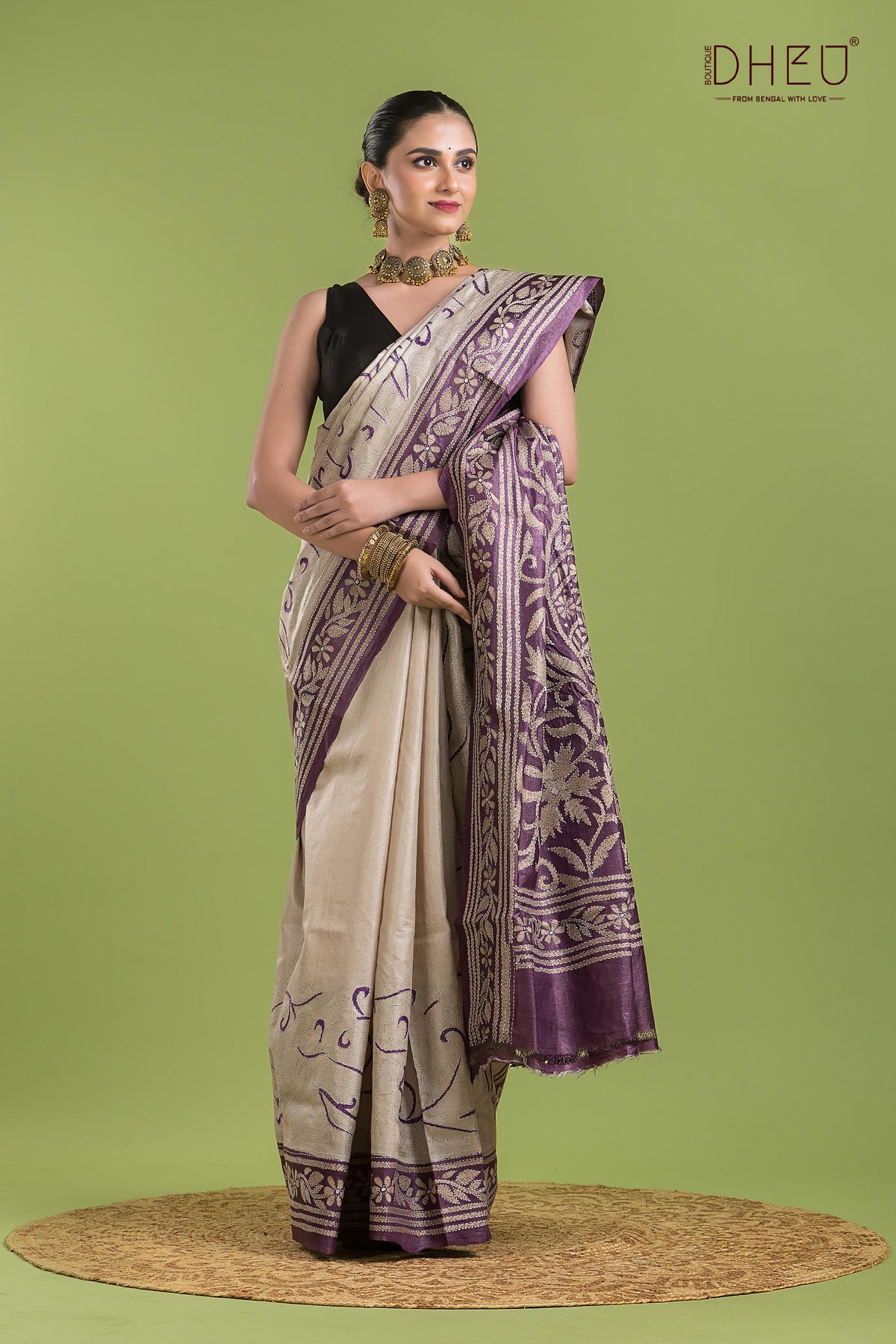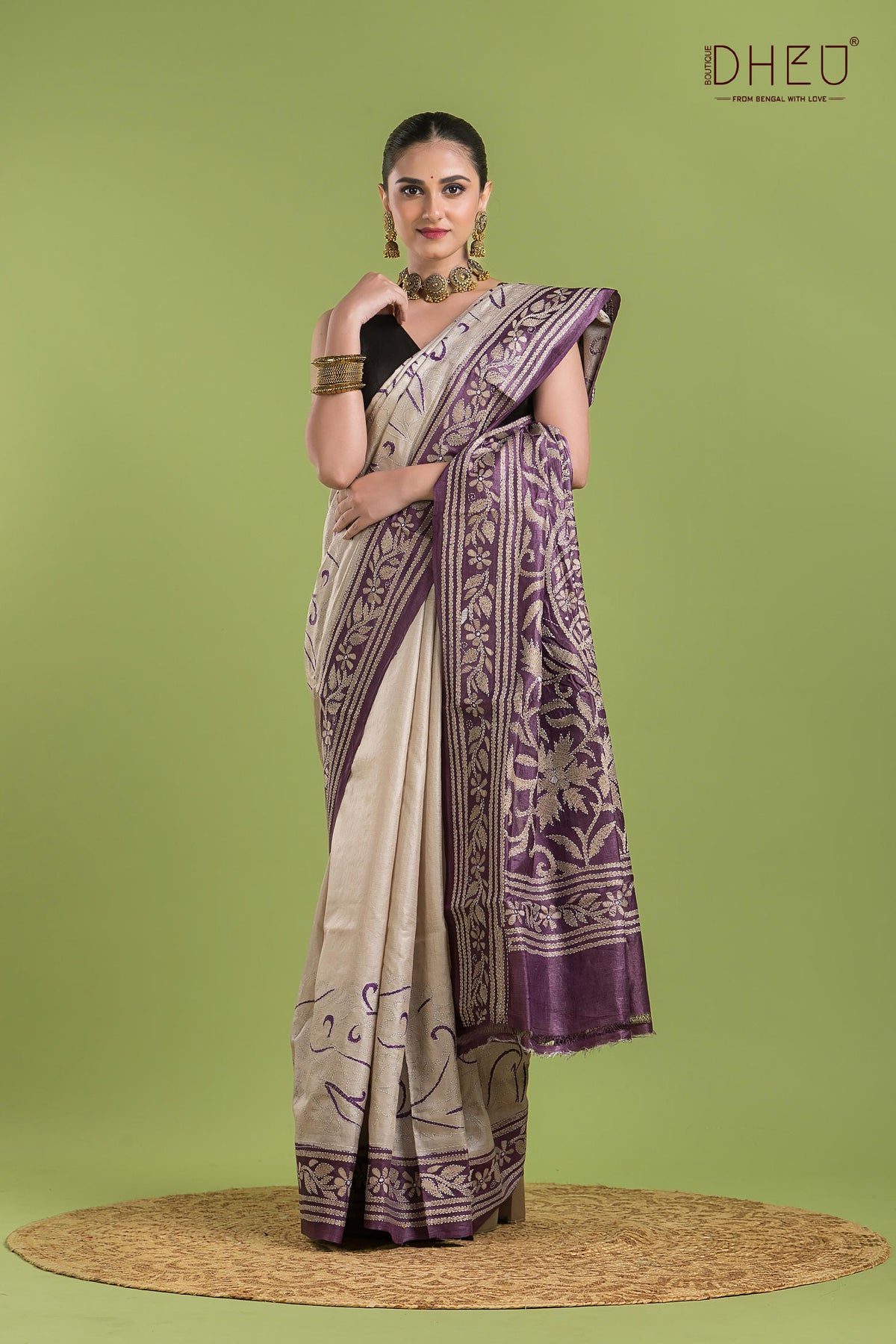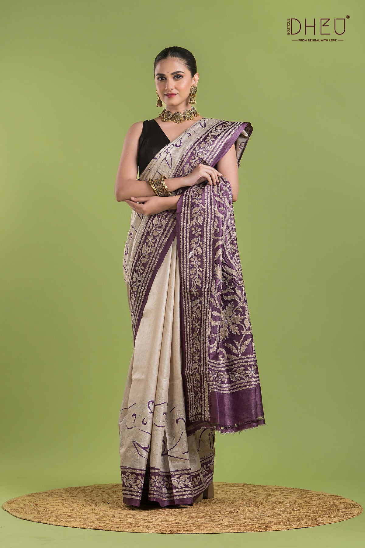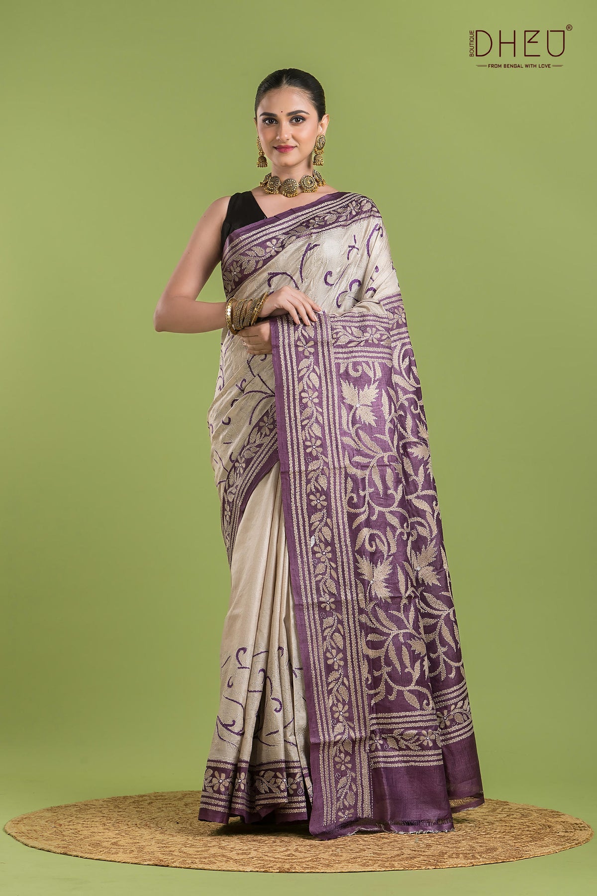 A Tussar Kantha Stitch Saree is a graceful blend of rustic silk and traditional hand embroidery, reflecting the rich textile heritage of India. Made from Tussar (Kosa) silk, the saree is known for its natural golden sheen, coarse texture, and earthy elegance. The saree is adorned with Kantha embroidery, a centuries-old hand-stitching technique originating from Bengal. Tussar silk is breathable, lightweight, and prized for its organic, unpolished charm.