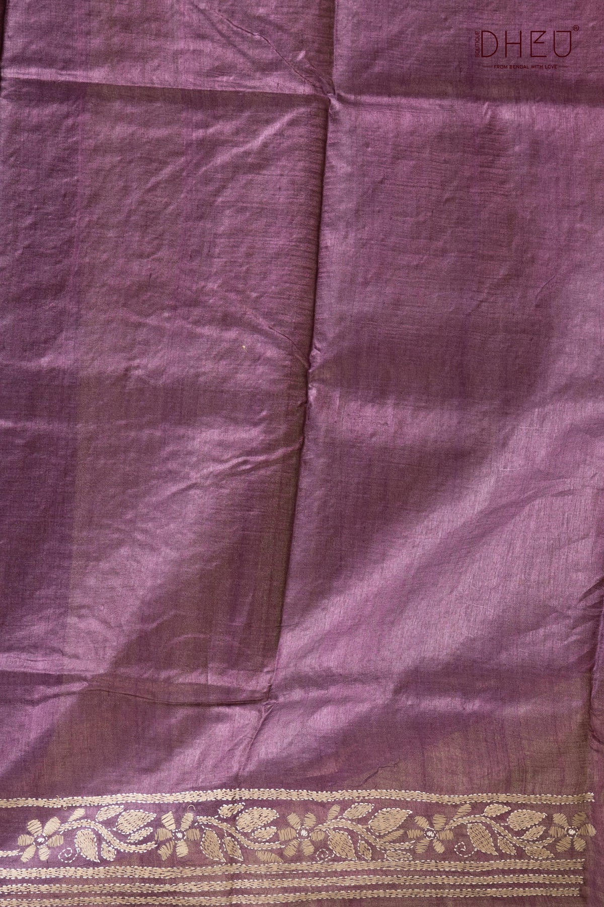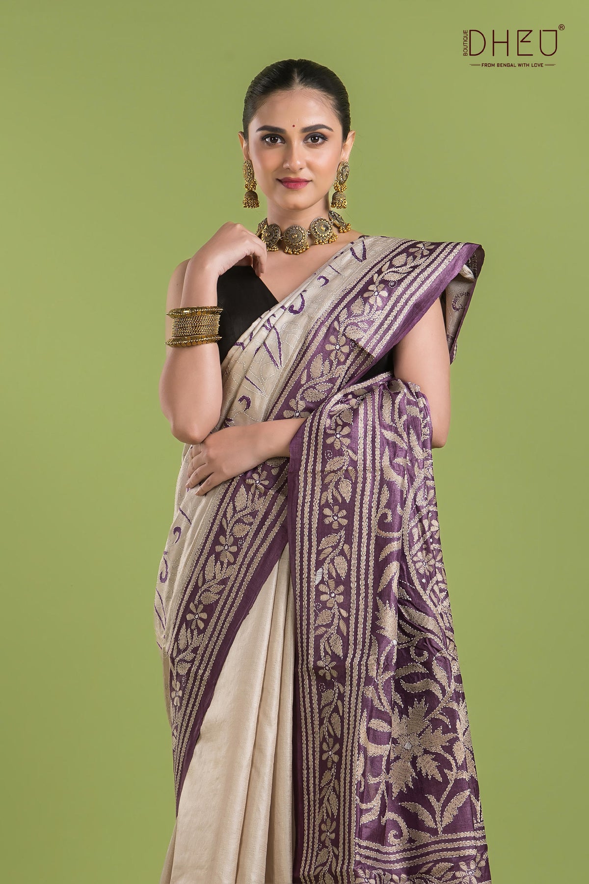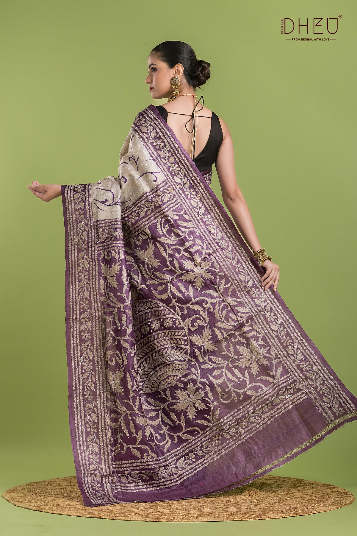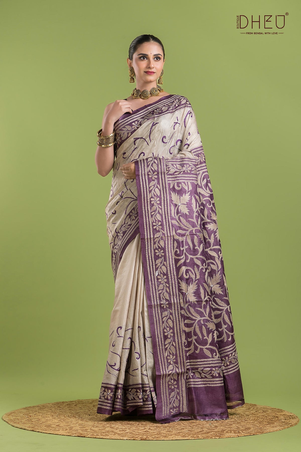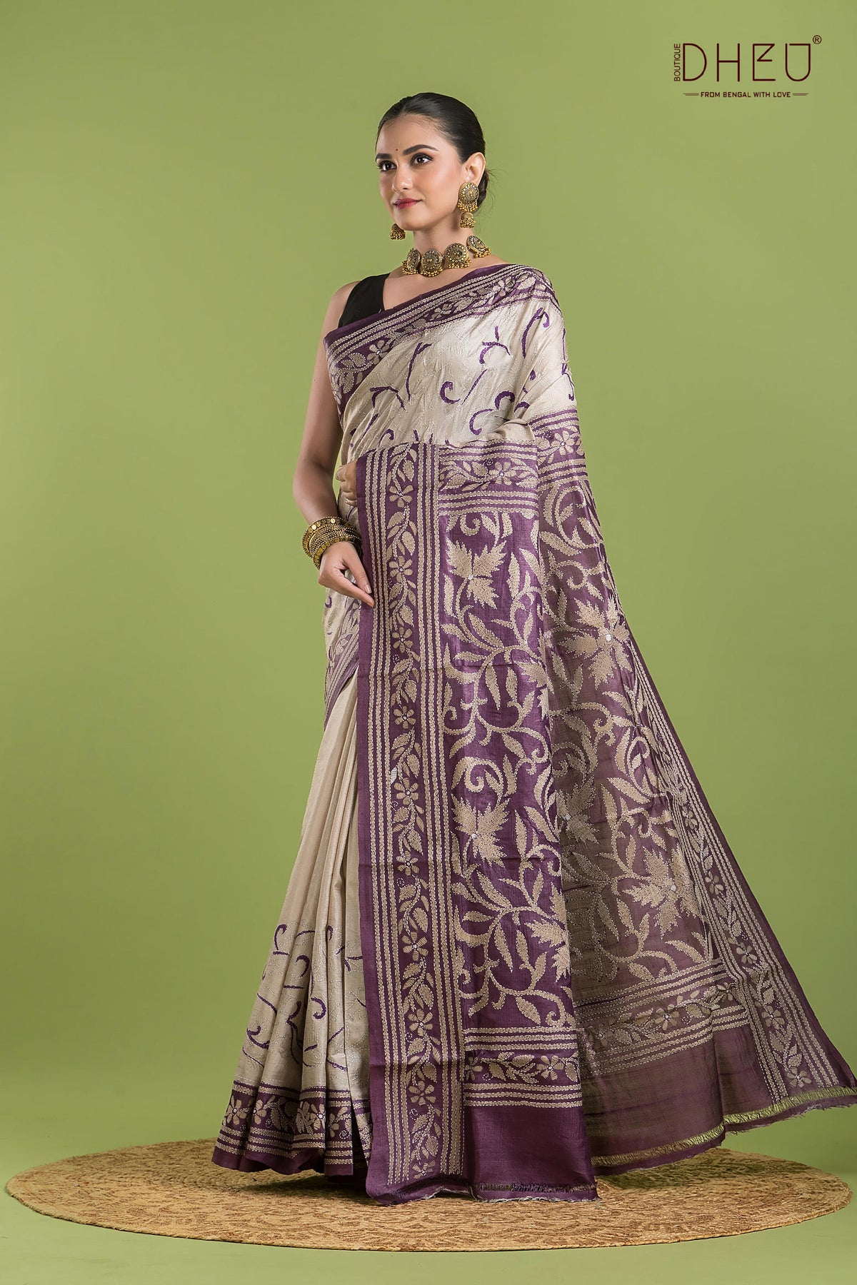 A Tussar Kantha Stitch Saree is a graceful blend of rustic silk and traditional hand embroidery, reflecting the rich textile heritage of India. Made from Tussar (Kosa) silk, the saree is known for its natural golden sheen, coarse texture, and earthy elegance. The saree is adorned with Kantha embroidery, a centuries-old hand-stitching technique originating from Bengal. Tussar silk is breathable, lightweight, and prized for its organic, unpolished charm.